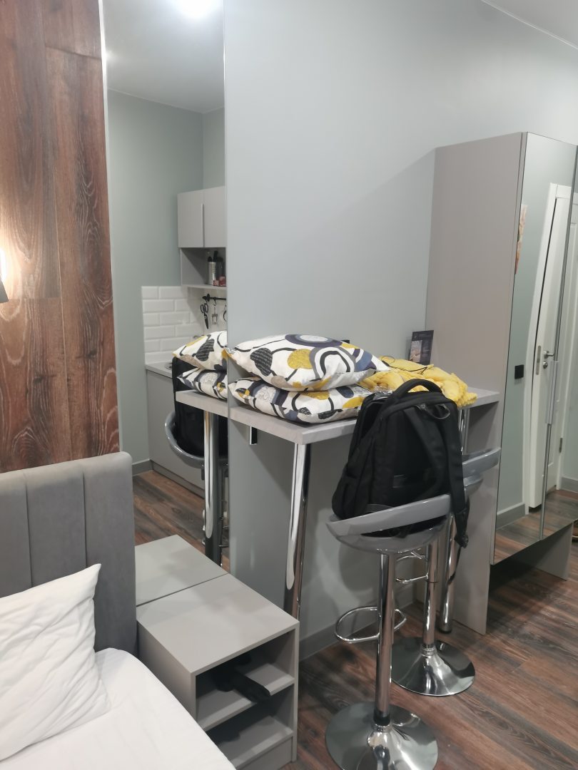Небольшая кухонная зона оборудована электроплитой, электрочайником и холодильником. Для тех, кто не хочет готовить самостоятельно, рядом расположились различные заведения: от столовых до ресторанов, благодаря чему каждый найдет себе что-то по вкусу и бюджету.