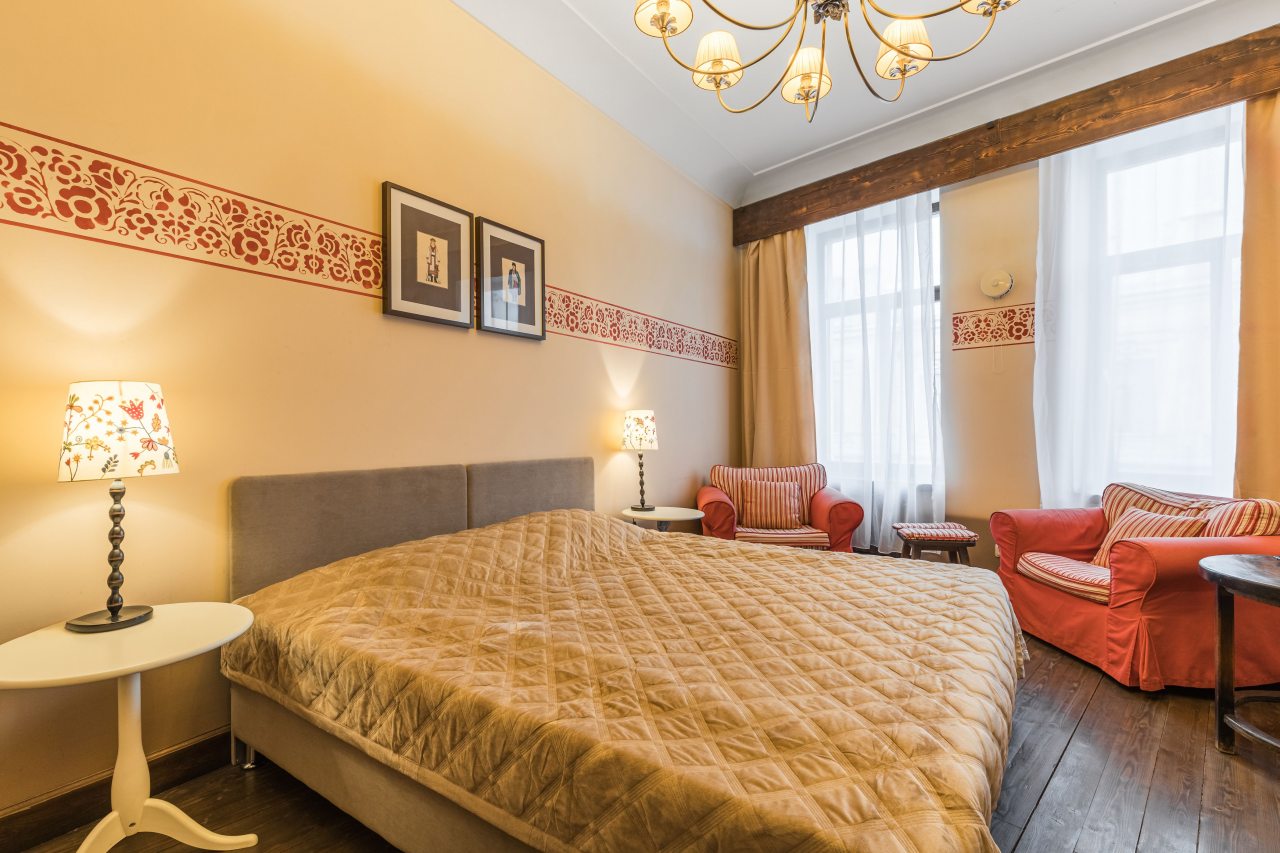 Тишина, интерьер, есть все необходимое: микроволновка, гладильная доска, холодильник. Очень уютно, самый центр Петербурга, при этом тихо.