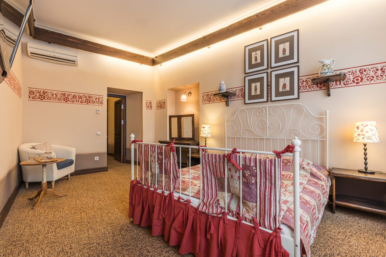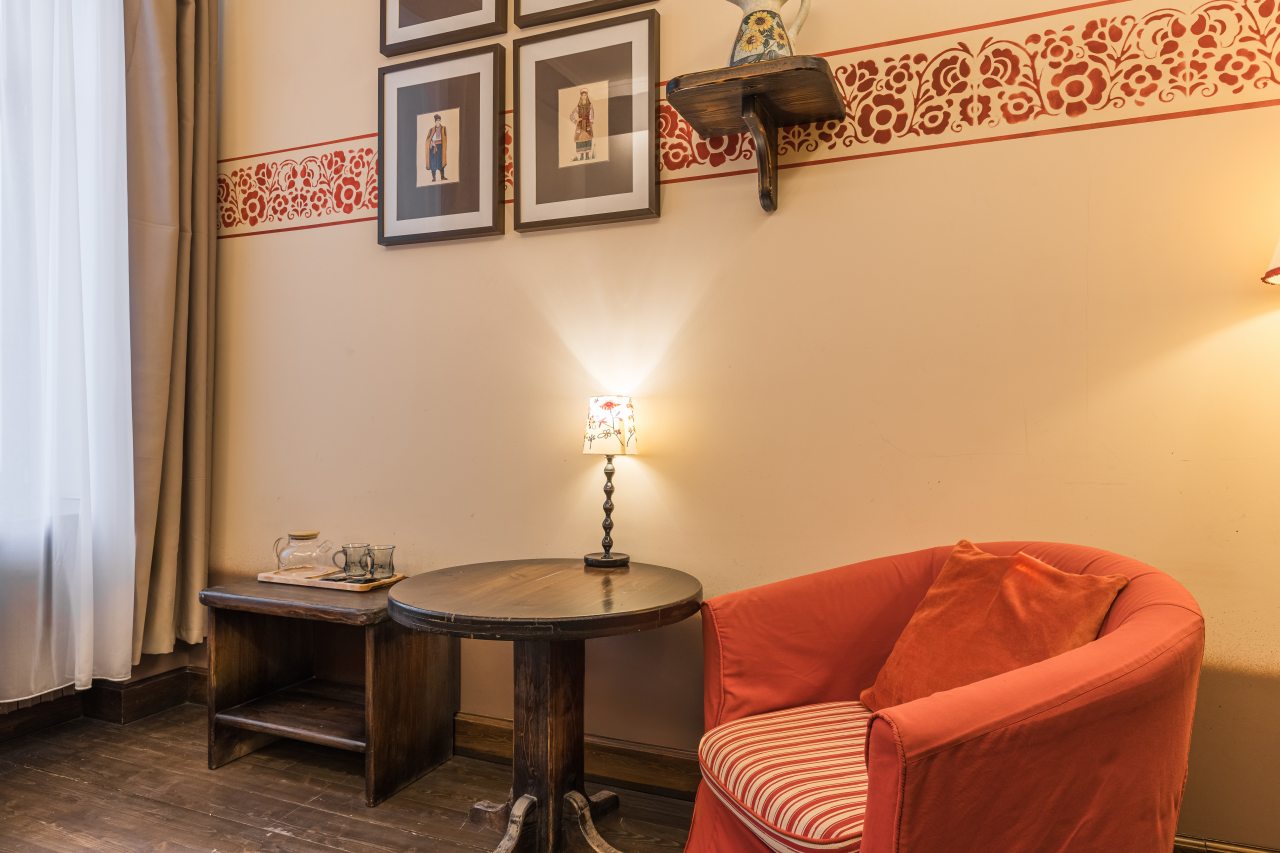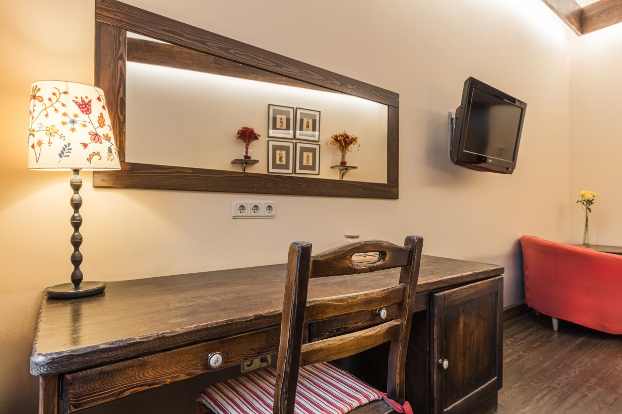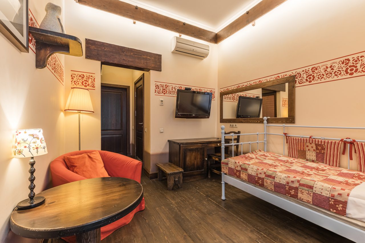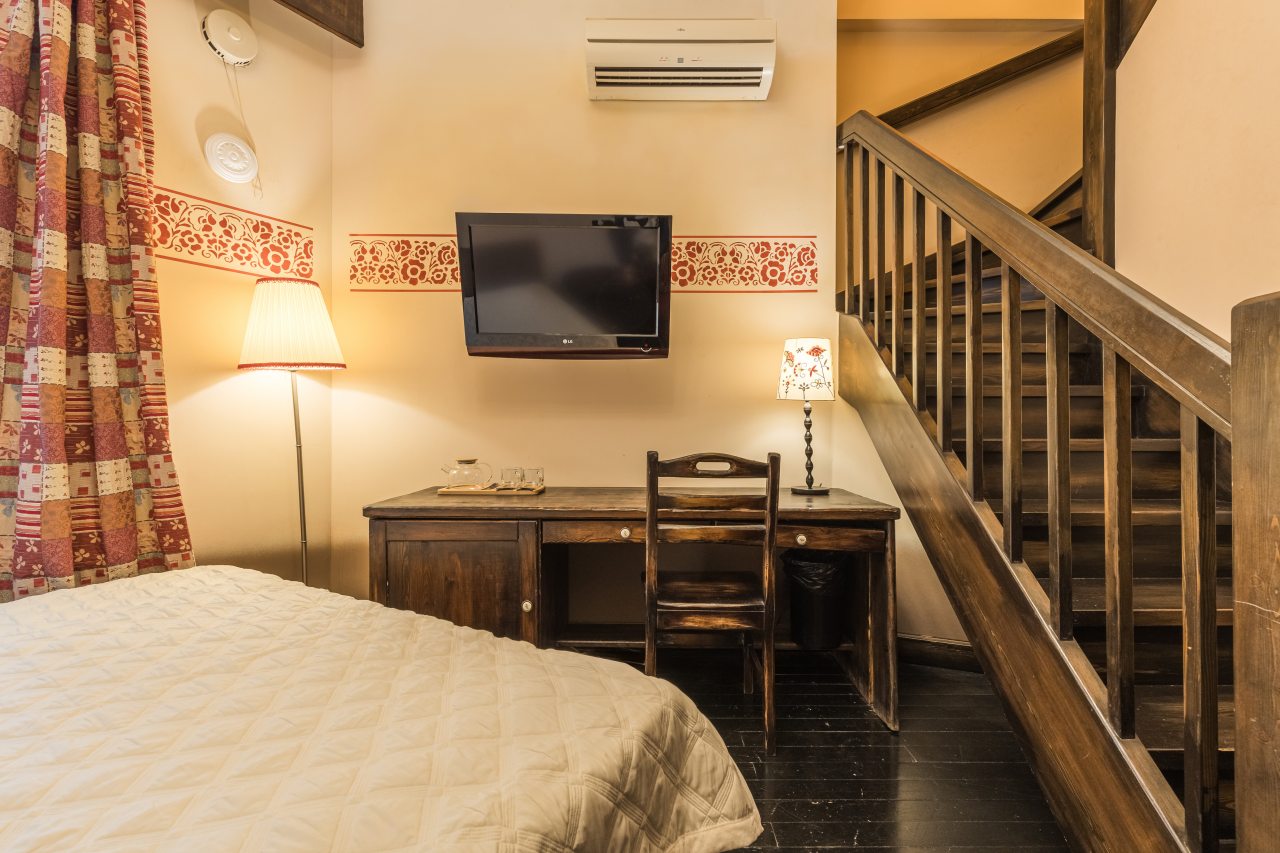 Для пребывания представлена категория «Стандарт» на одного-двух гостей и двухуровневые номера «Семейный», «Люкс» на двух-четырех человек, которые подойдут паре или семьи с детьми. Все предложенные варианты укомплектованы мебелью и техникой: двуспальные или односпальные кровати, телевизор, стол, холодильник, кондиционер, сейф. В санузле есть фен и косметико-гигиенические средства.