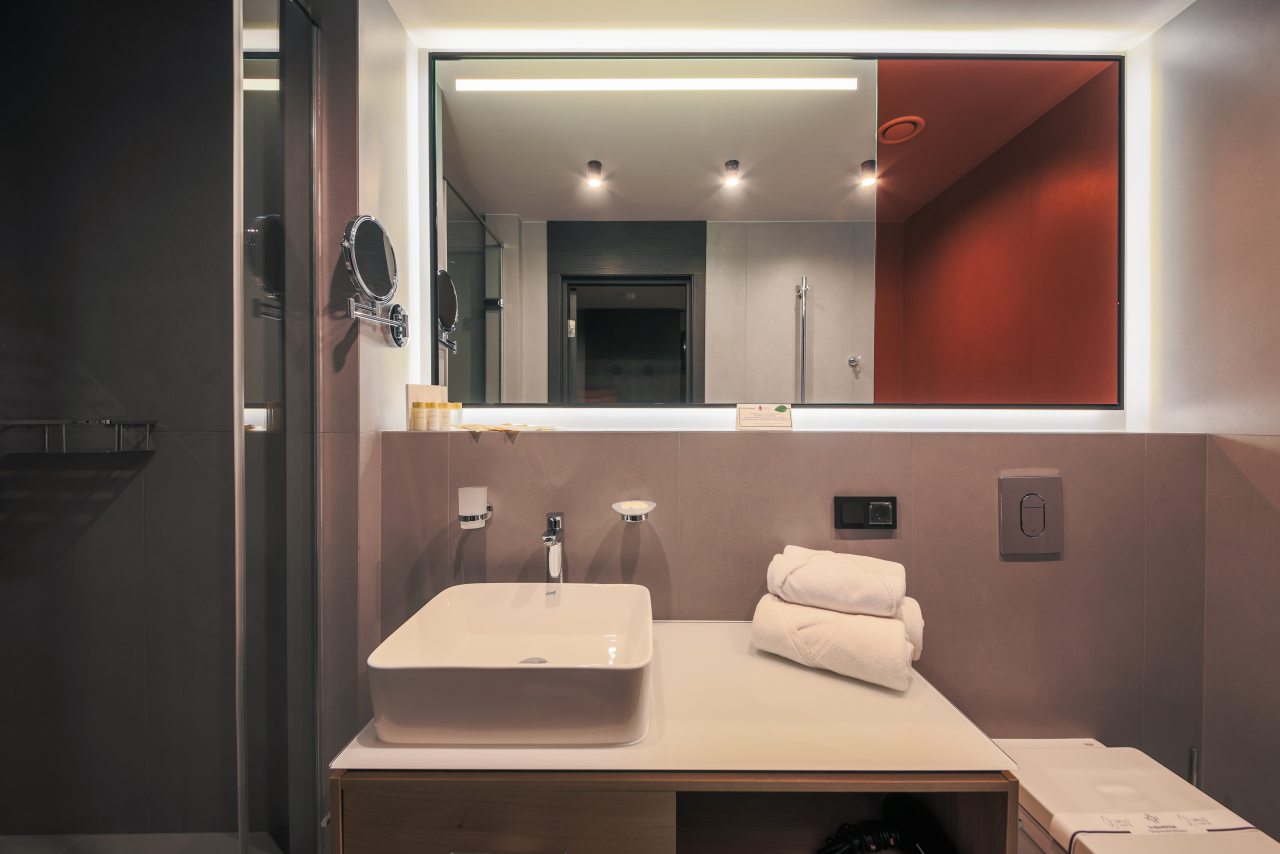 Бронировали стандартный номер, при заселении повысили номер до комфорта, приятно.Понравилось современное здание, дизайн в номере и в самом отеле.