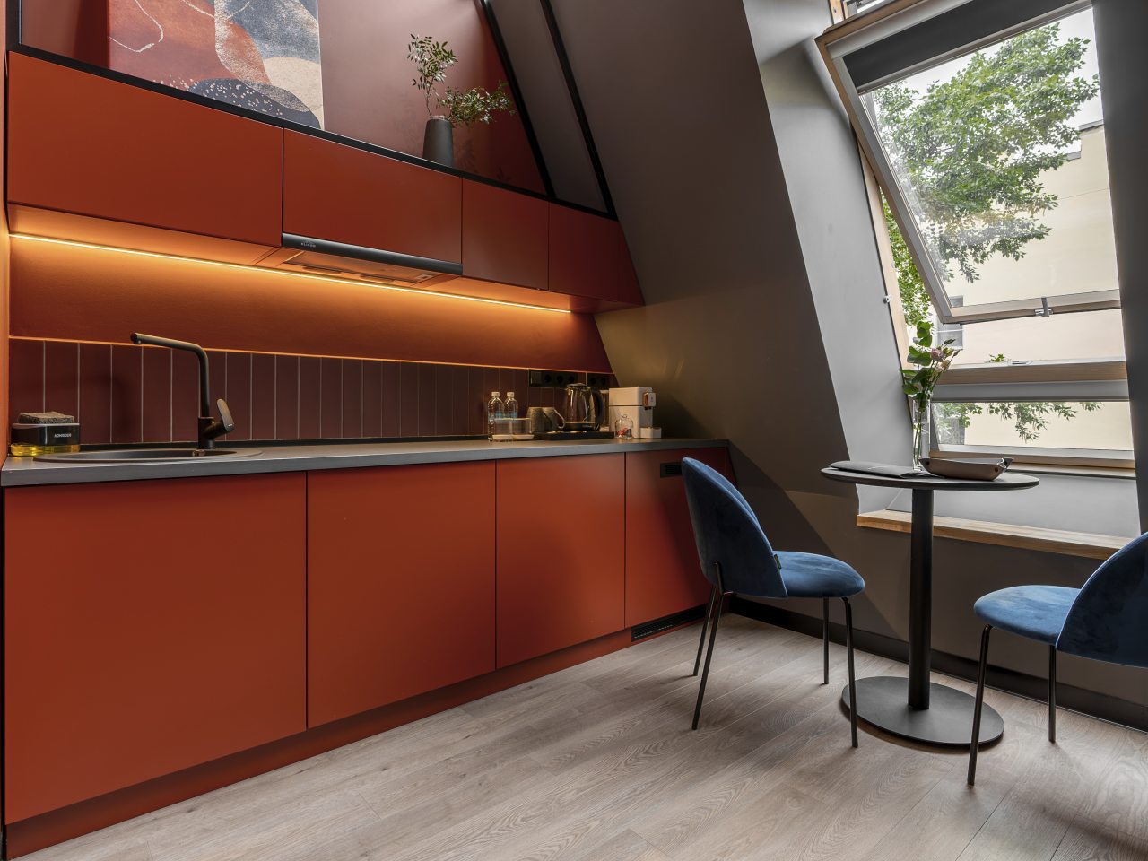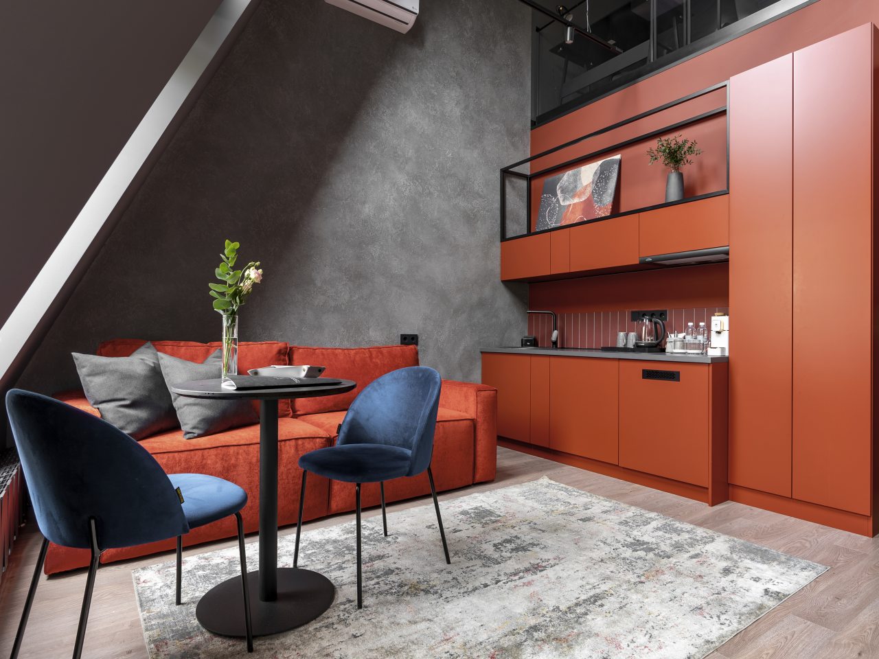 Во всех номерах установлен холодильник и чайник, а категория «Студия» дополнительно располагает кухонной зоной с микроволновой печью и посудой. Рядом продуктовые магазины, рестораны и кондитерские.
