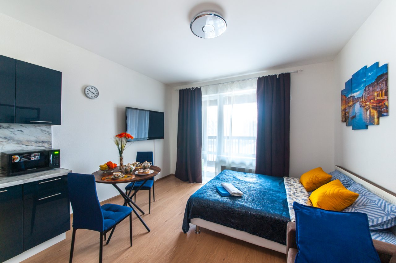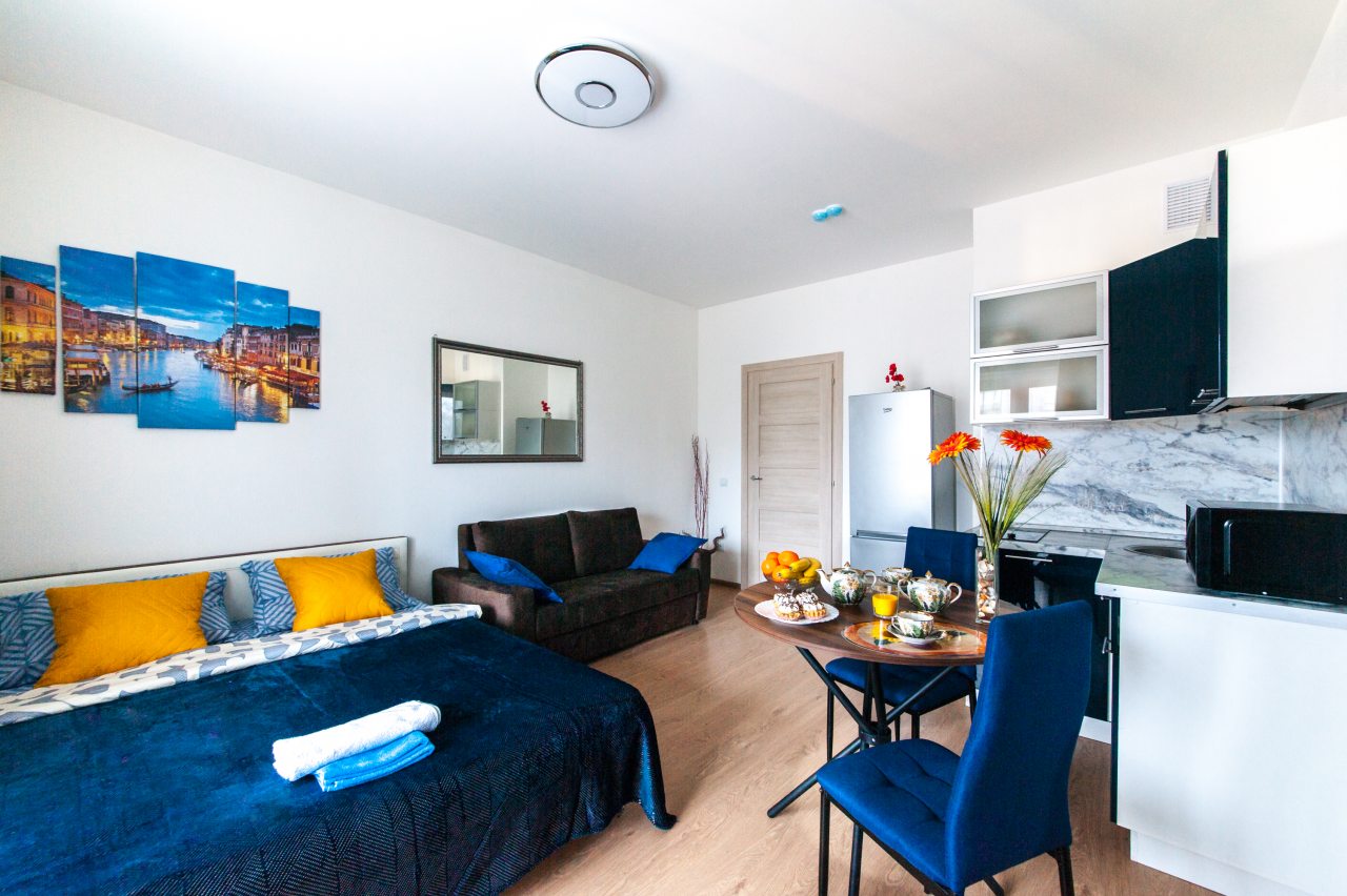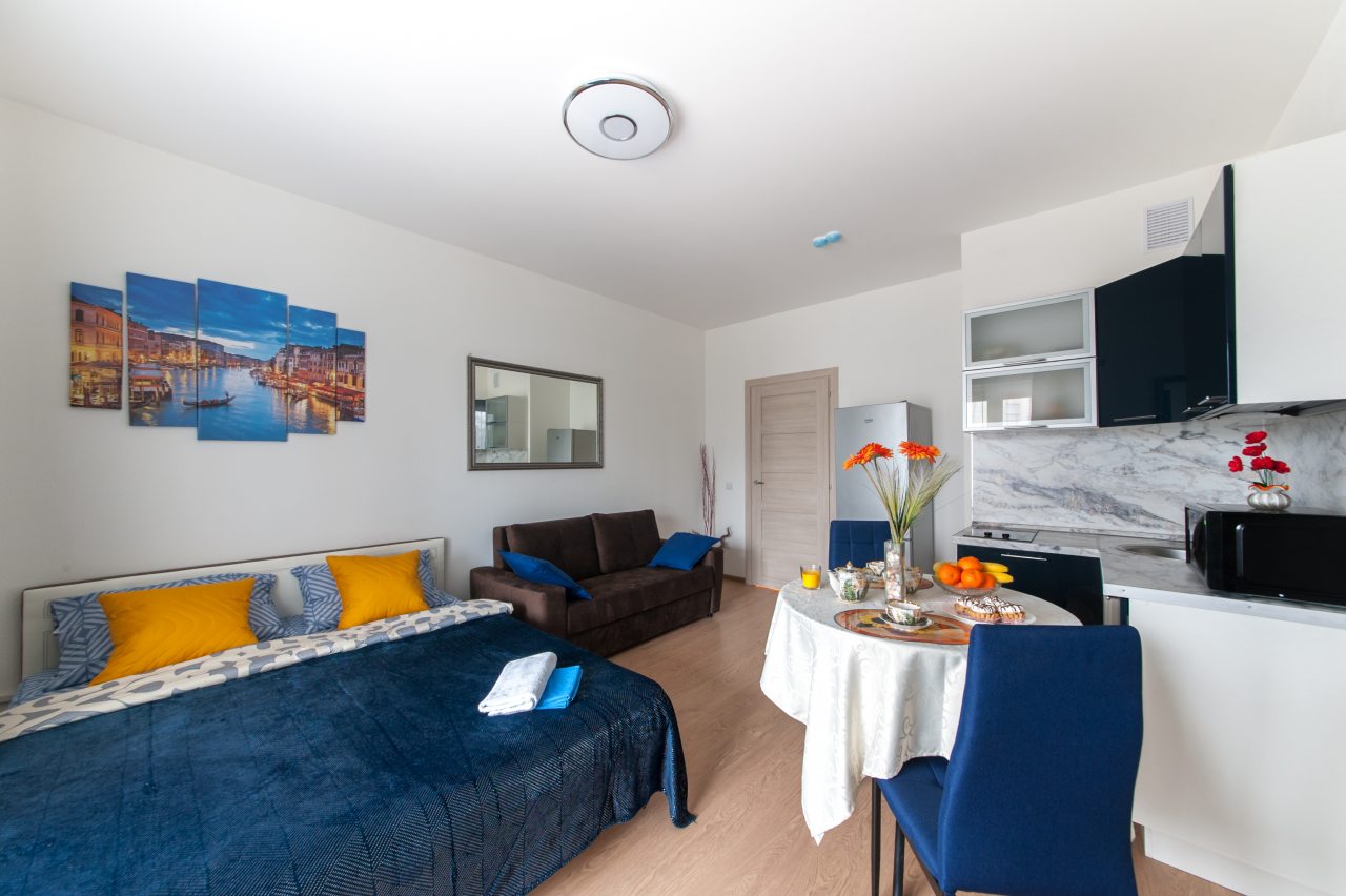 Провели неделю в Санкт-Петербурге, в это время жили в Studio 2 MSK. Здесь достаточно просторно, хорошая вместительная кровать в спальне и есть небольшое кресло. Телевизор подвешен на стене прямо напротив спального места. Гарнитур угловой с плитой и раковиной. Можно запросто что-то приготовить. В плане безопасности все организовано - от датчиков дыма до огнетушителей.