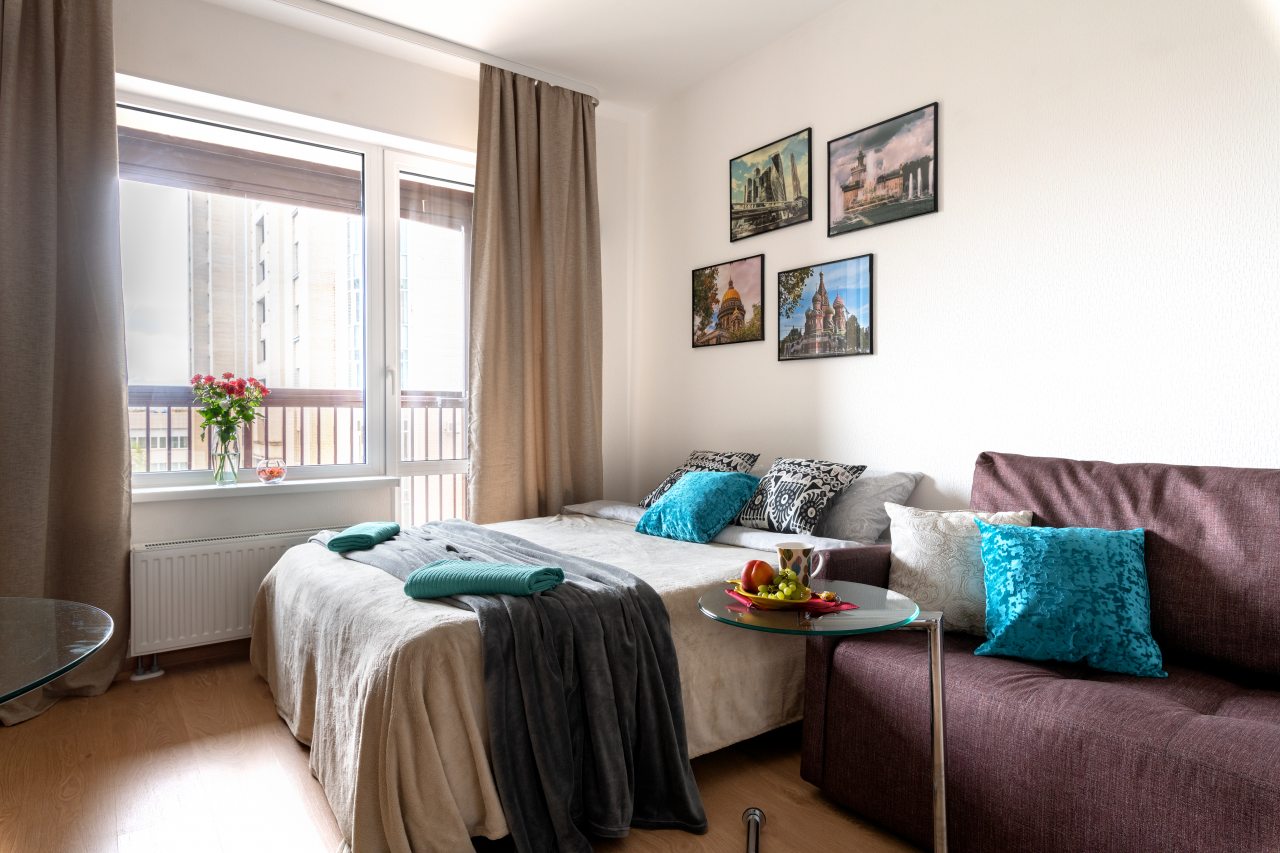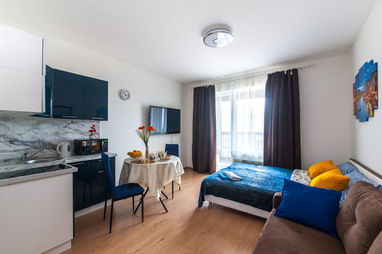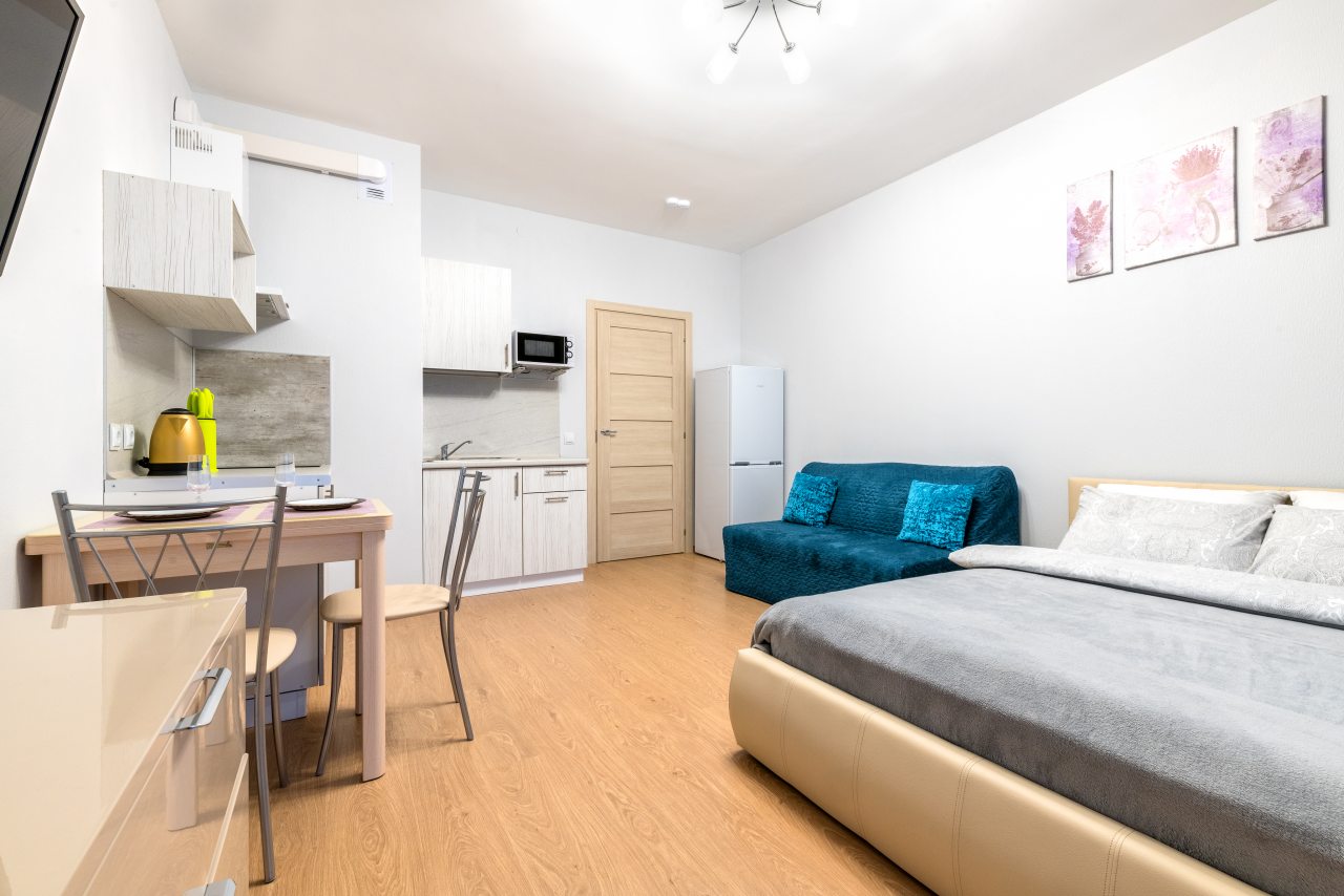 Провели неделю в Санкт-Петербурге, в это время жили в Studio 2 MSK. Здесь достаточно просторно, хорошая вместительная кровать в спальне и есть небольшое кресло. Телевизор подвешен на стене прямо напротив спального места. Гарнитур угловой с плитой и раковиной. Можно запросто что-то приготовить. В плане безопасности все организовано - от датчиков дыма до огнетушителей.