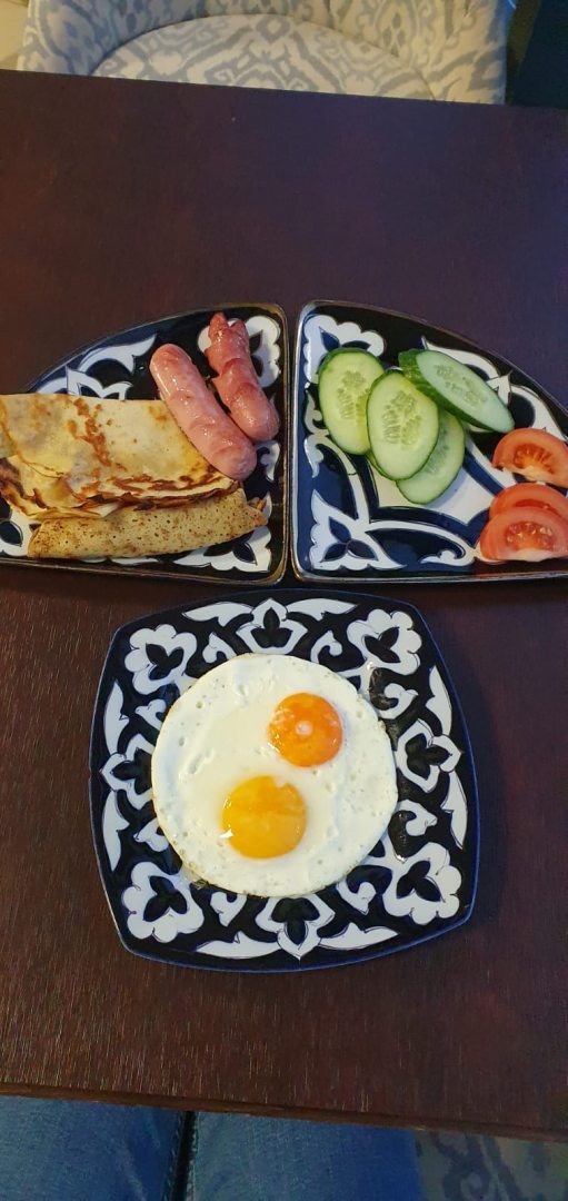 Завтраки для гостей отеля, а также доставку еды в номера осуществляет ресторан "Навруз". На завтрак подается: чай/кофе, сыр/куриная ветчина, лепешка, каша (овсяная, манная, рисовая), омлет с сыром.
