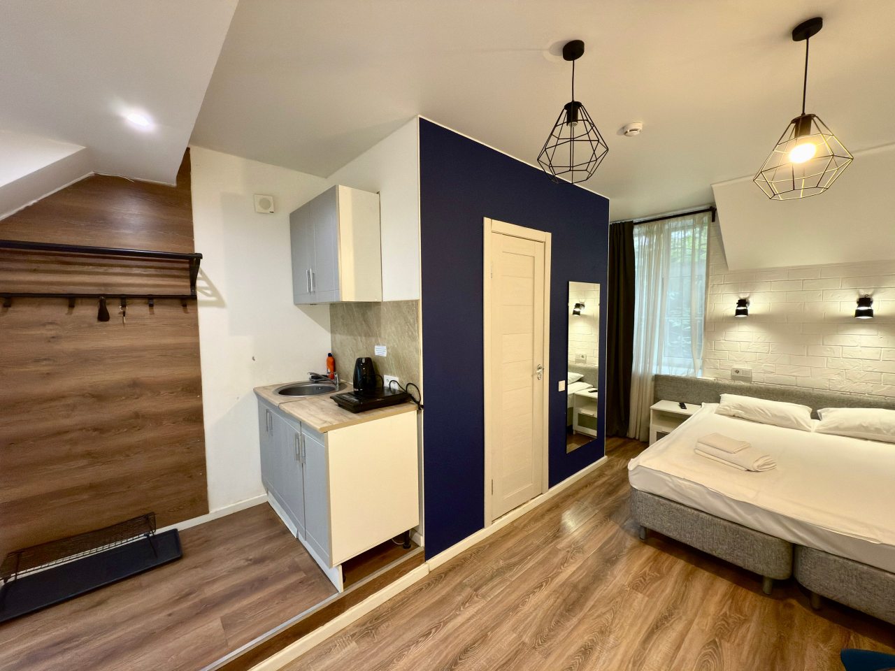 Для гостей подготовлены уютные апартаменты, в которых есть все необходимое для комфортного отдыха: приятный дизайн, удобная мебель, телевизор, бесплатный Wi-Fi, собственная ванная комната с чистыми мягкими полотенцами и туалетно-косметическими принадлежности.