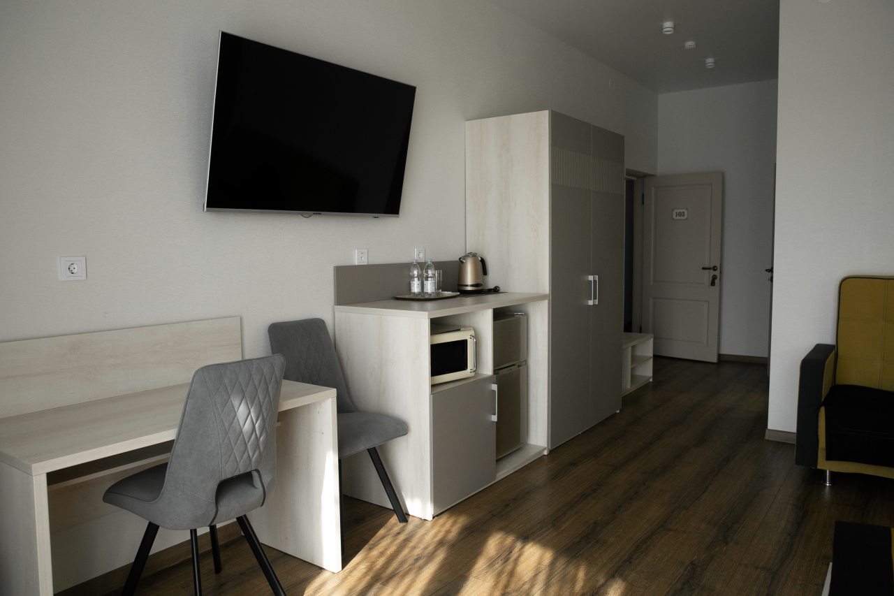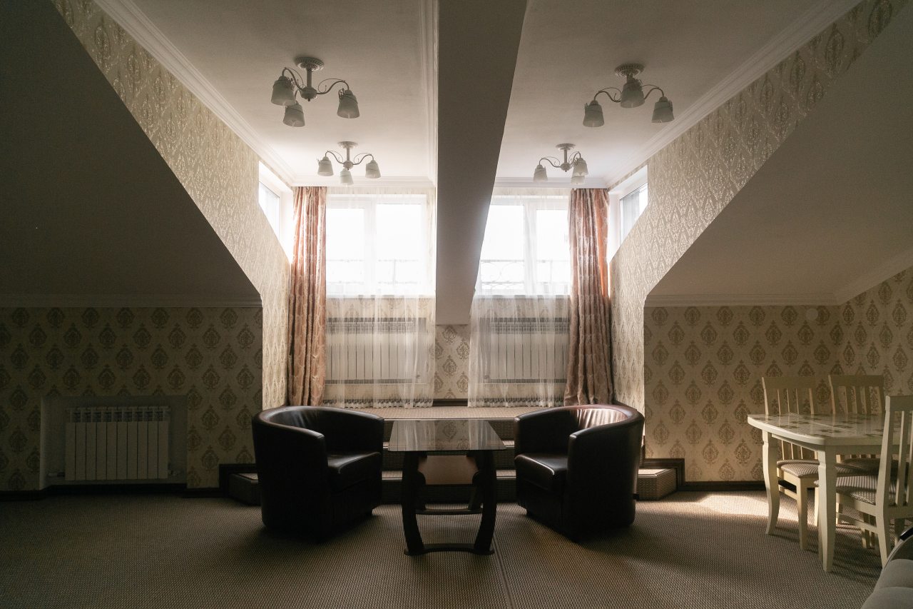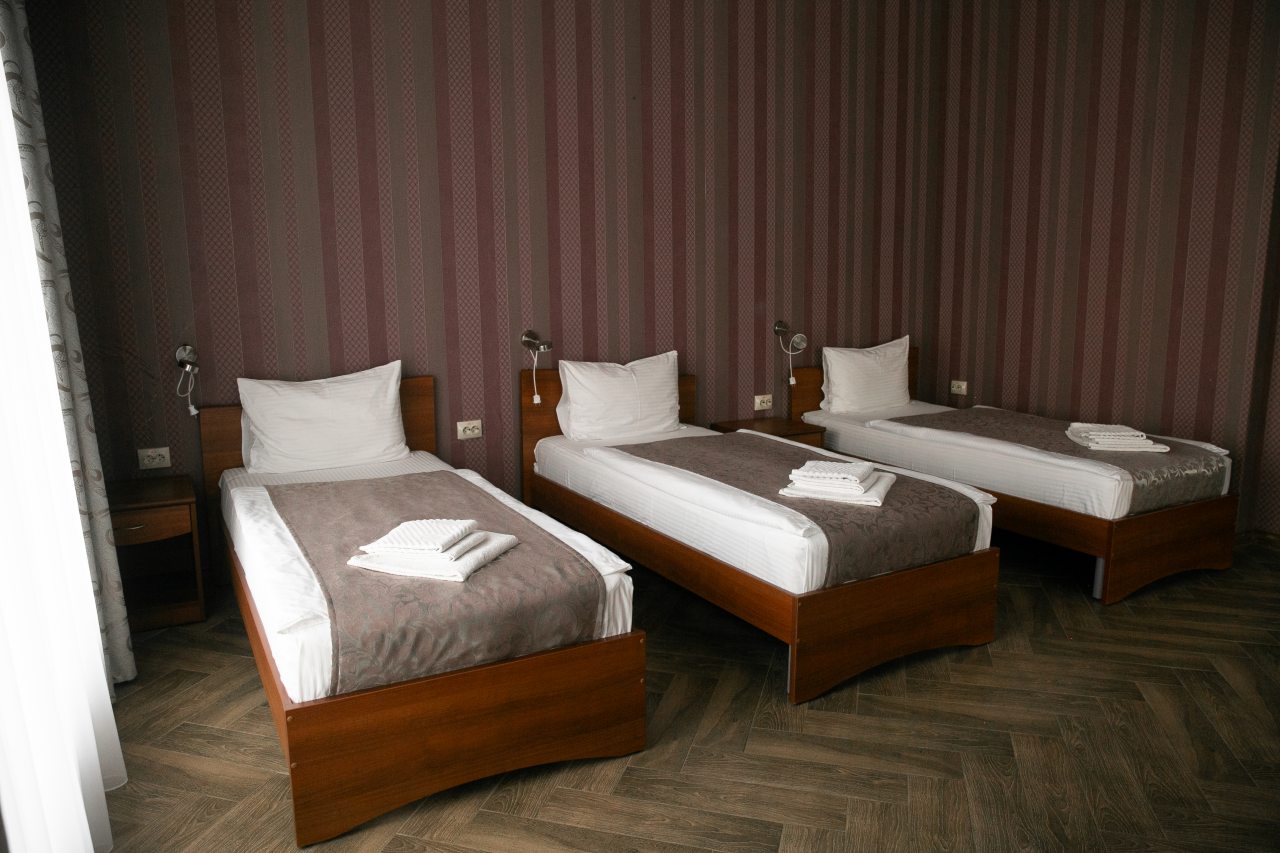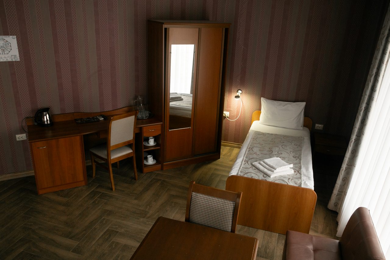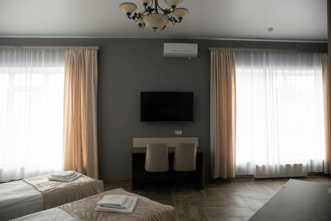 Каждый номер оборудован удобной для сна кроватью, вместительным шкафом, кондиционером, телевизором и другой необходимой для проживания качественной мебелью и техникой. В санузле вас ожидает набор белоснежных полотенец и халатов, а также различные туалетно-гигиенические принадлежности.