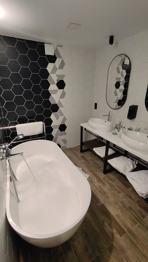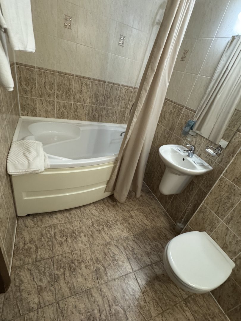 От апартаментов в которых мы жили мы вообще в восторге полном огромный двухкомнатный номер с большой кроватью и самое главное с сауной в номере . Белые полотенца, халаты, тапочки, фен, чисто и уютно !