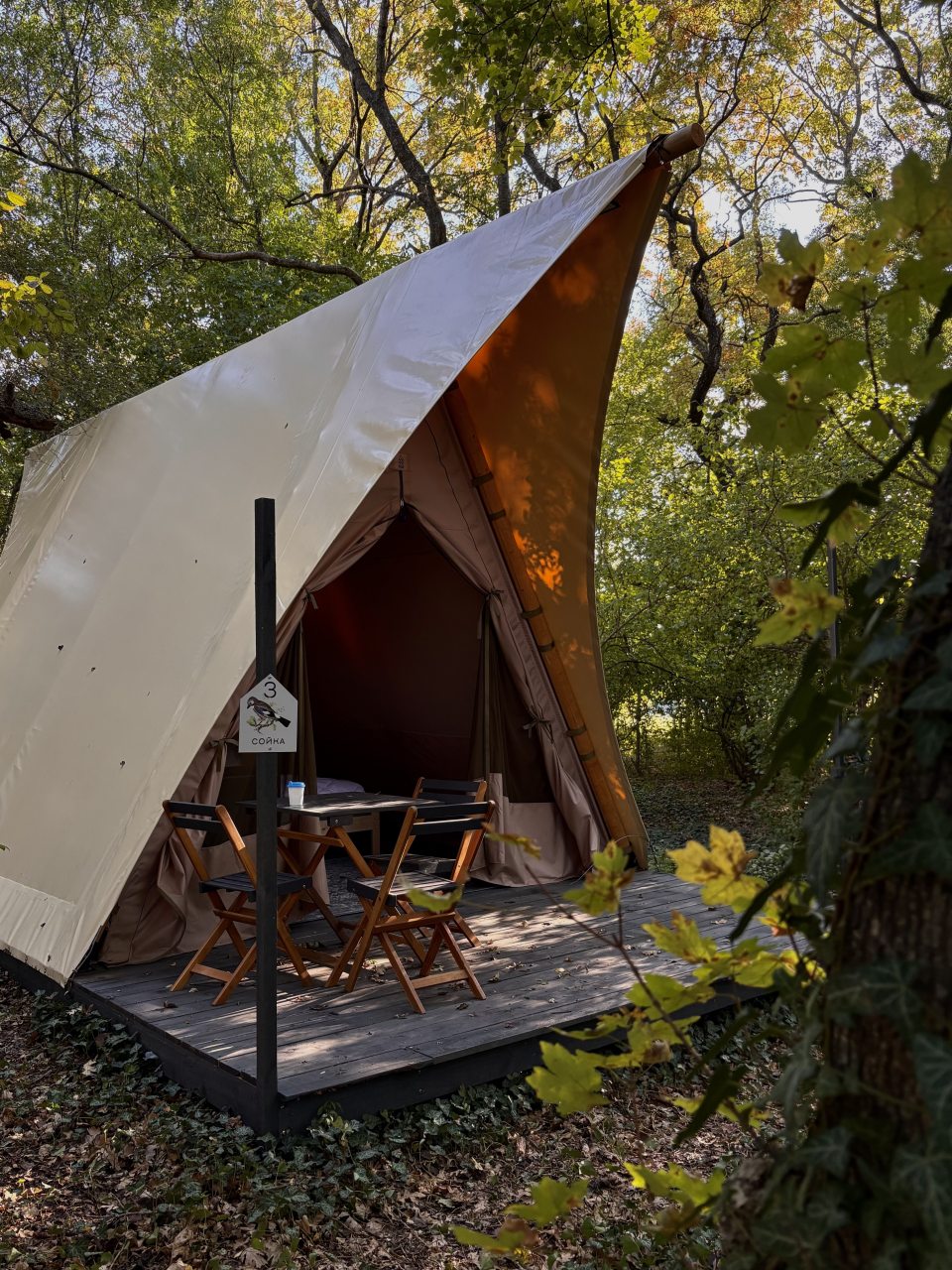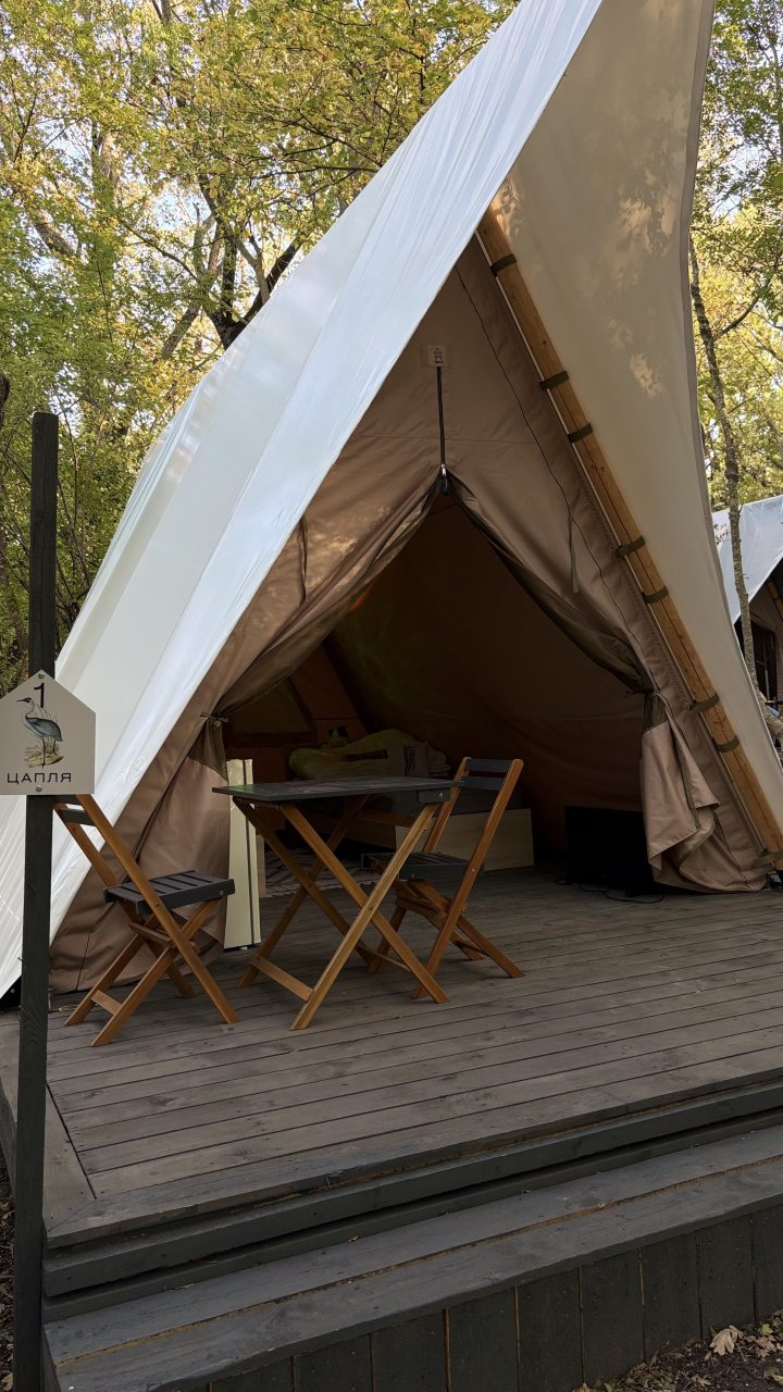 Место идеально подходит для отдыха на свежем воздухе. Гостям предлагается разместиться в уютных палатках: Цапля, Дятел, Сойка. Каждая из них оборудована комфортабельными спальными местами, лампами, розетками возле кровати, холодильником и электрочайником. Душ и туалет располагаются на улице.