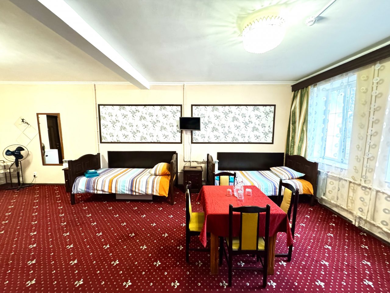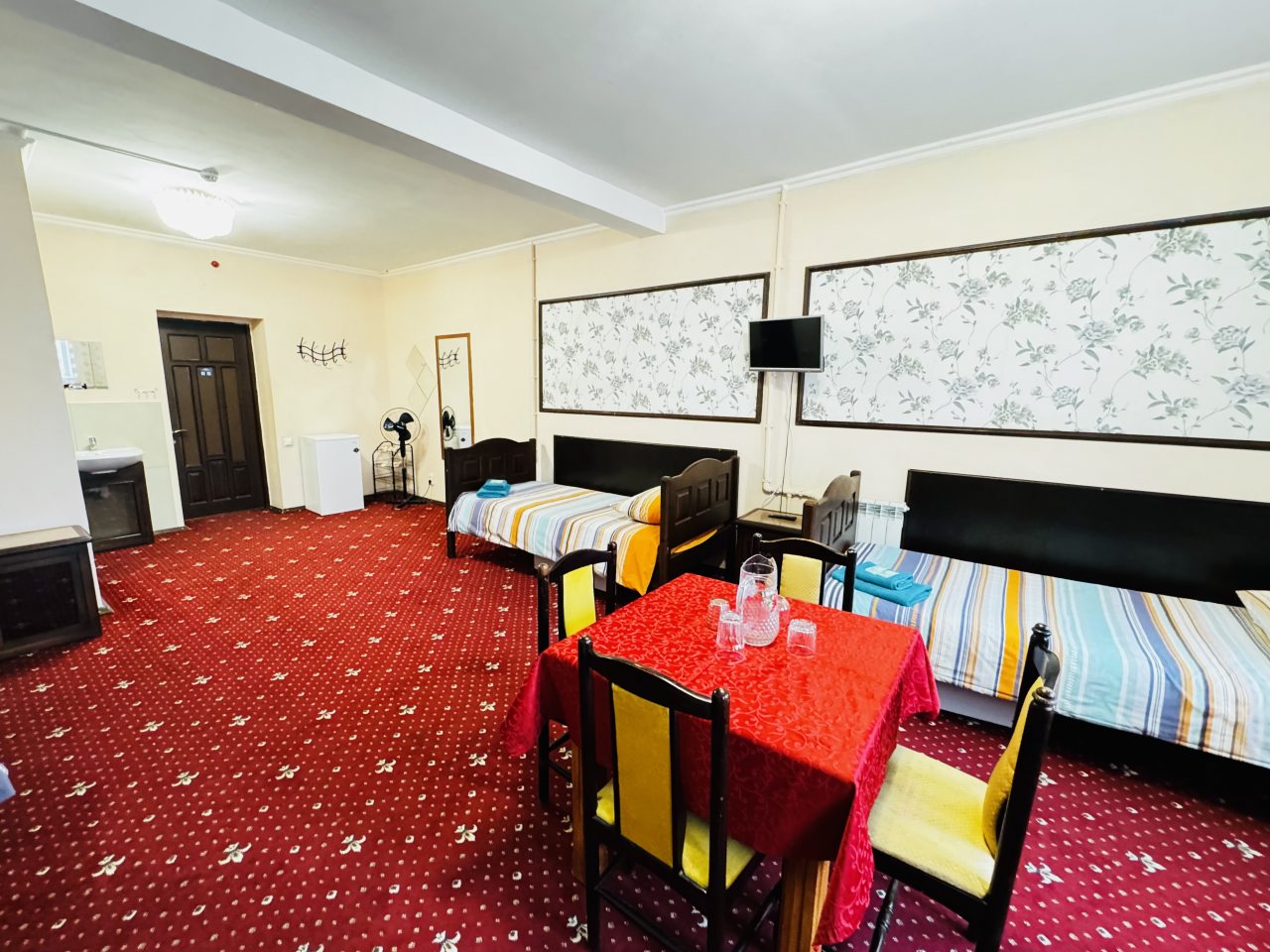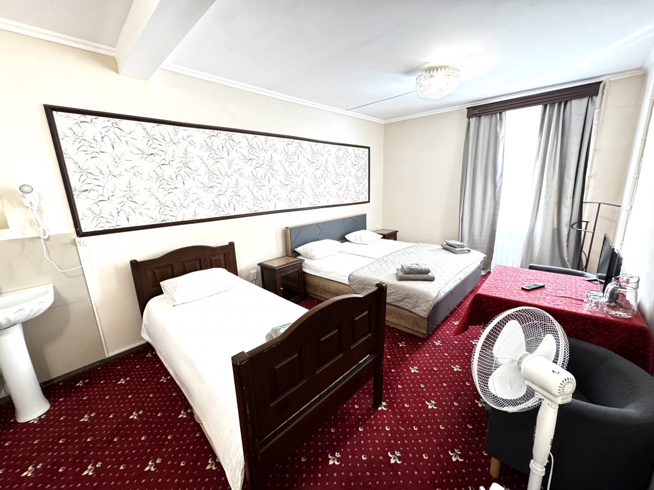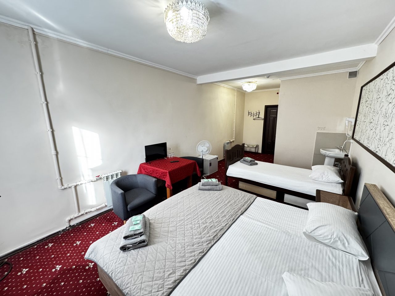 В стандартном номере есть одна оригинальная особенность – умывальник расположен не в санузле, а в комнате. Впрочем, главное, что он есть. Телевизор маленький, хотя показывает хорошо. Только смотреть его удобнее сидя у стола, а не лежа в кровати. Лежебоками не понравиться.