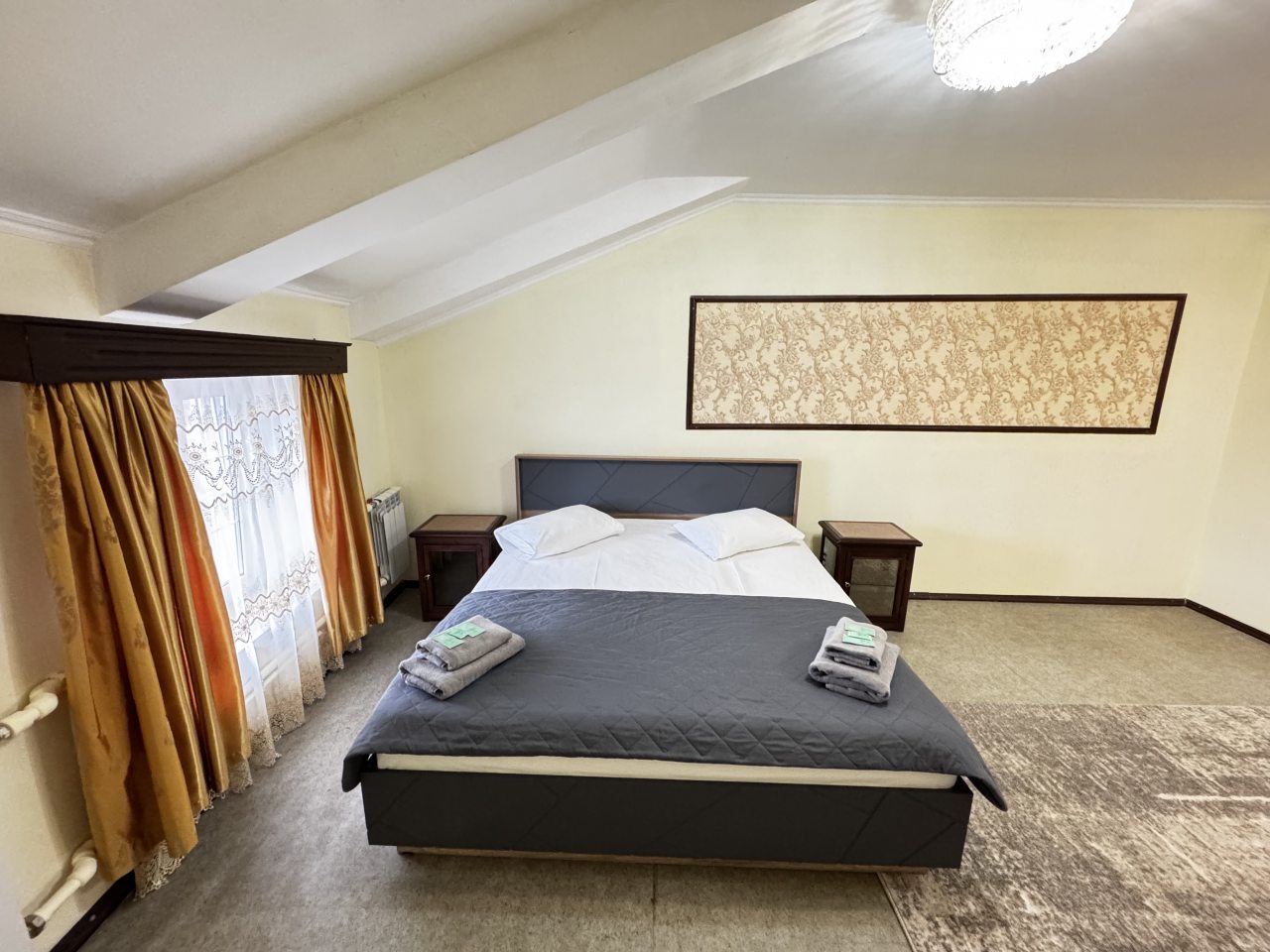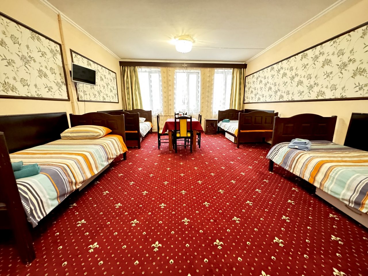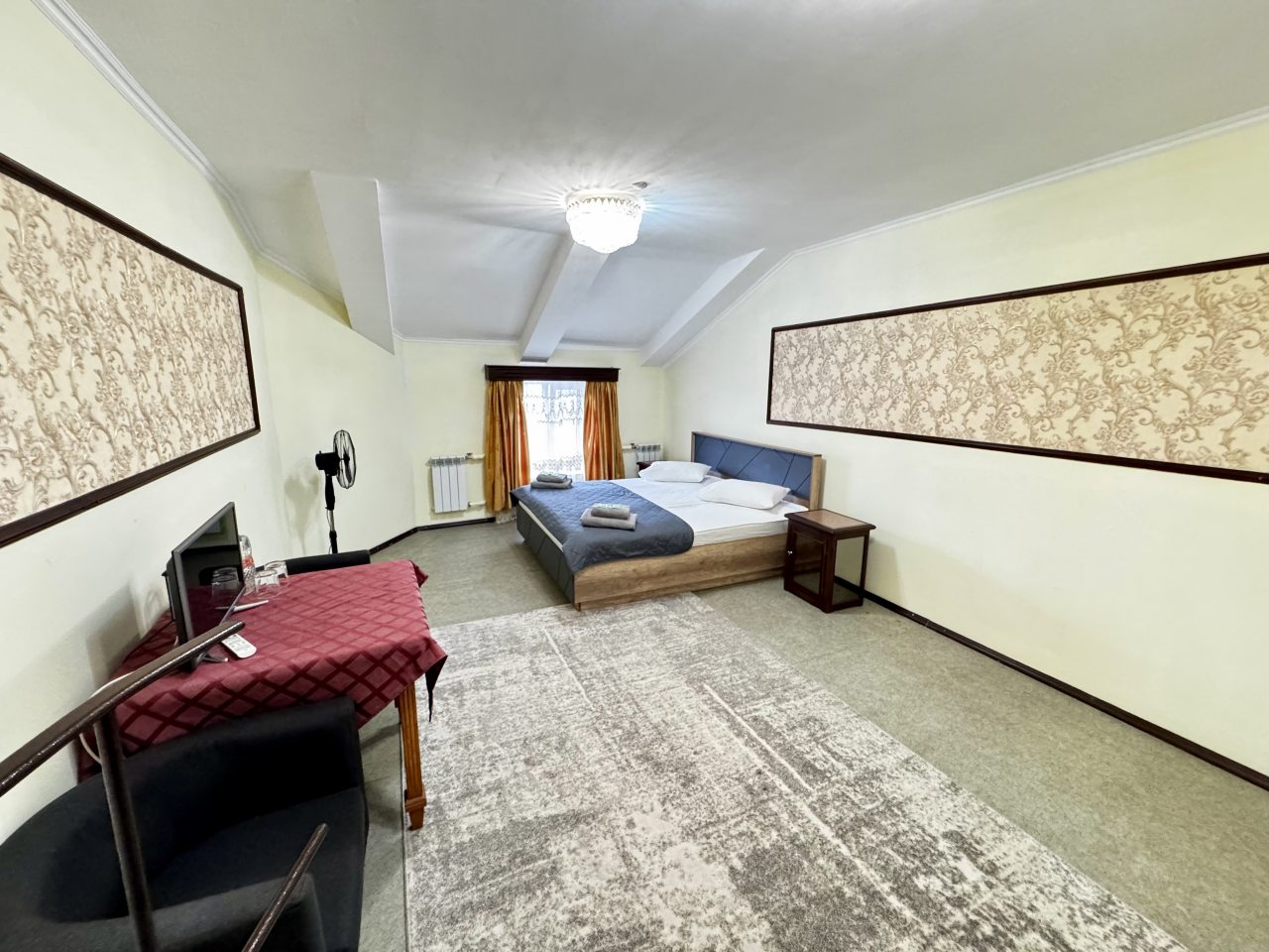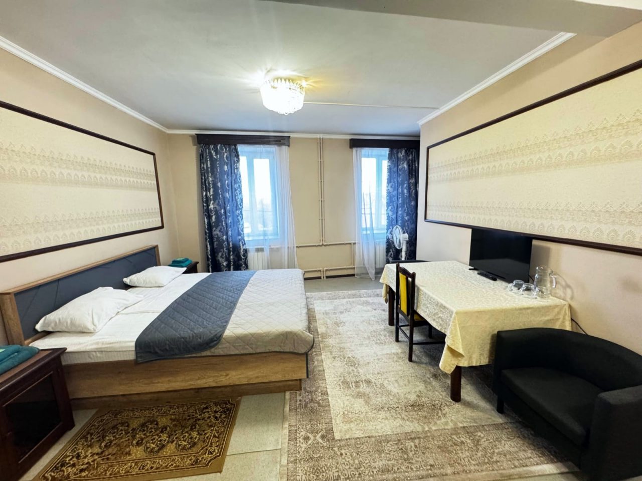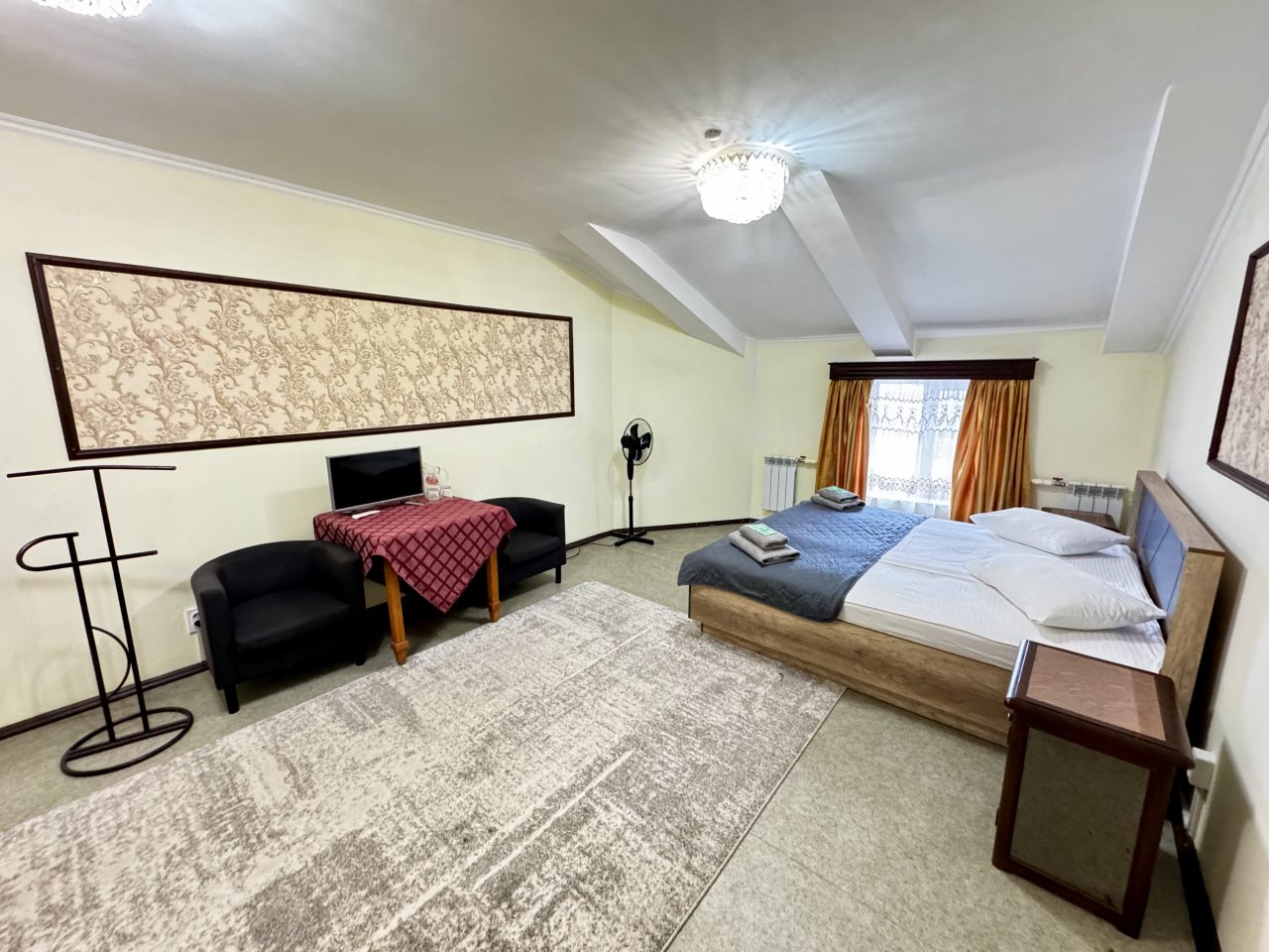 В стандартном номере есть одна оригинальная особенность – умывальник расположен не в санузле, а в комнате. Впрочем, главное, что он есть. Телевизор маленький, хотя показывает хорошо. Только смотреть его удобнее сидя у стола, а не лежа в кровати. Лежебоками не понравиться.