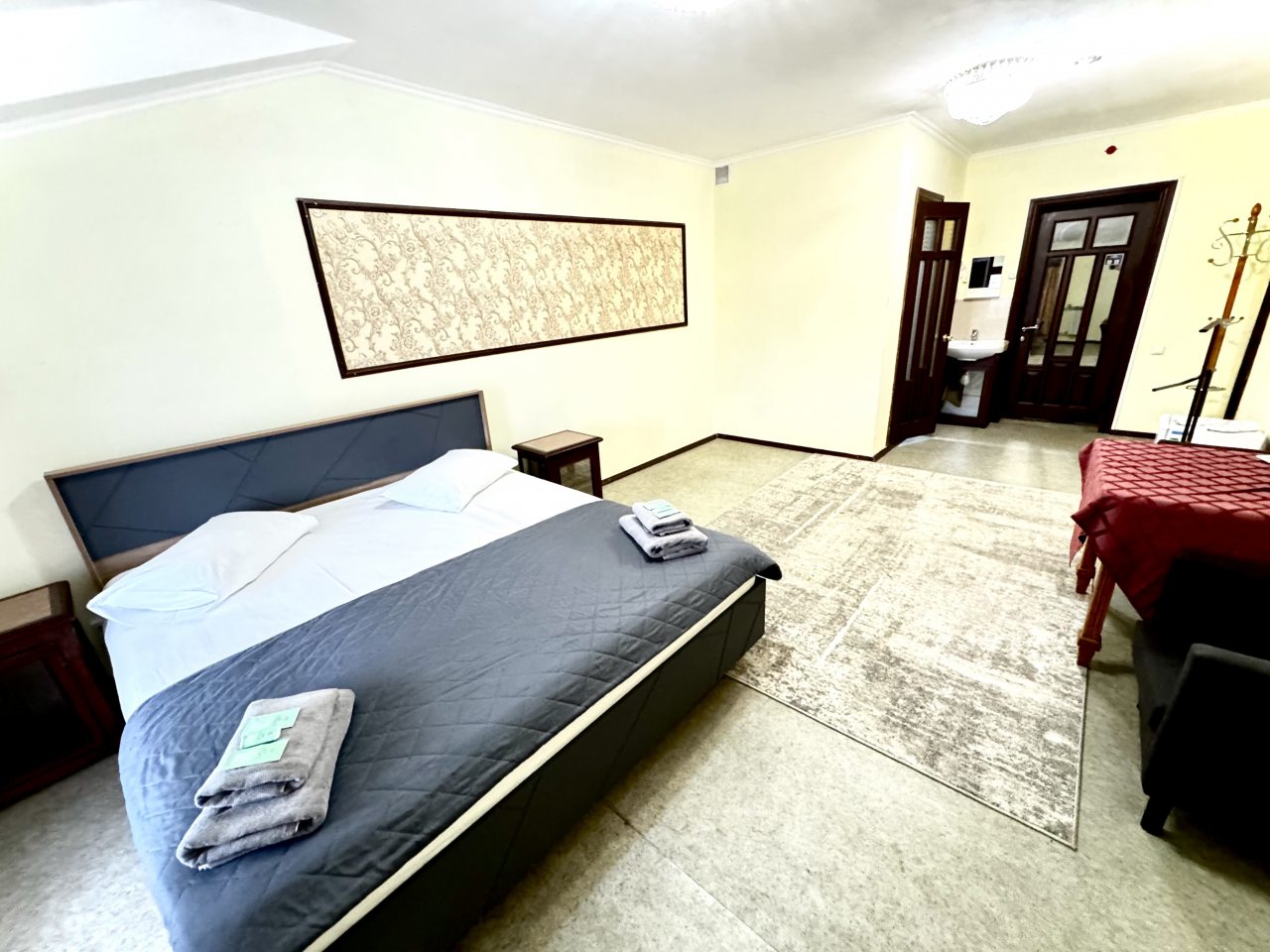 Бюджетный вариант, есть все, что нужно для неприхотливых постояльцев. Душевая кабина, туалет, раковина вынесена в комнату. Ремонт старый, но чисто и уютно. Комфортные матрасы, удобные кровати.