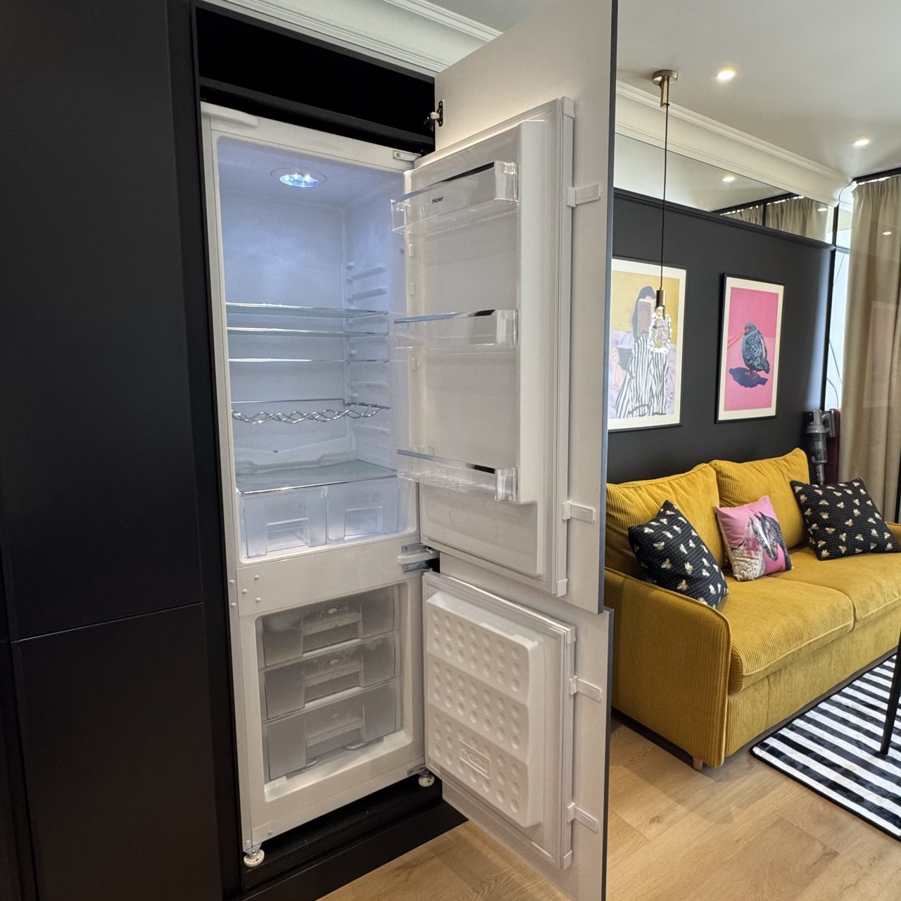 Кухонная зона оснащена чайником, варочной панелью, различными столовыми приборами, вытяжкой, холодильником и красивой обеденной зоной.