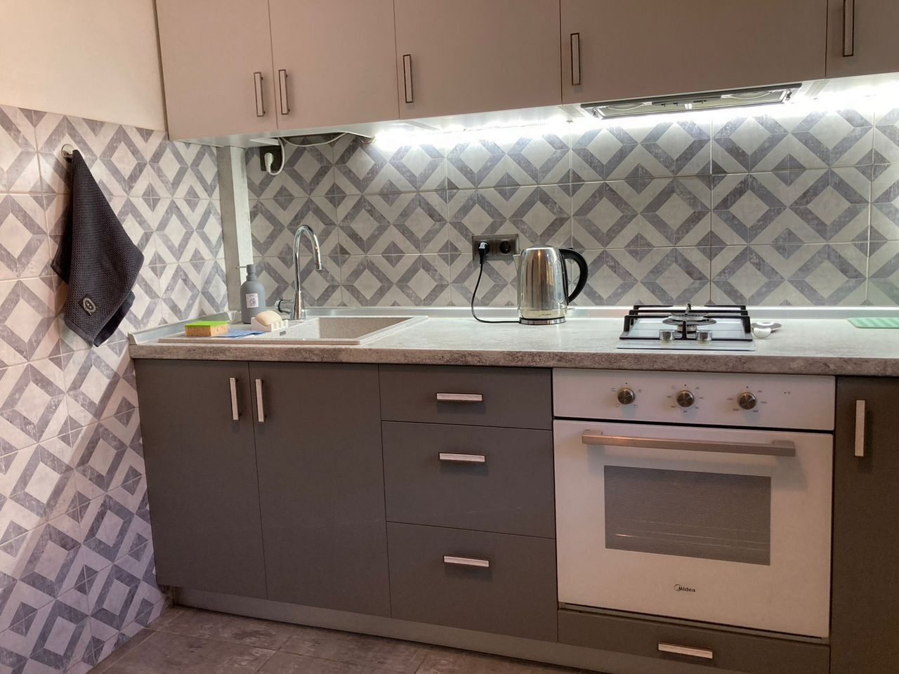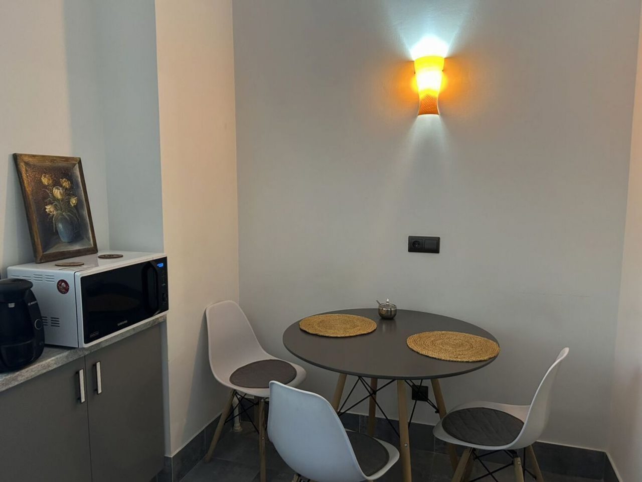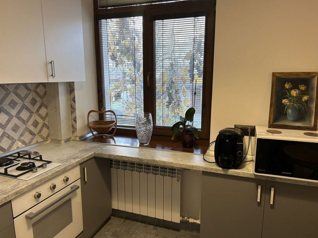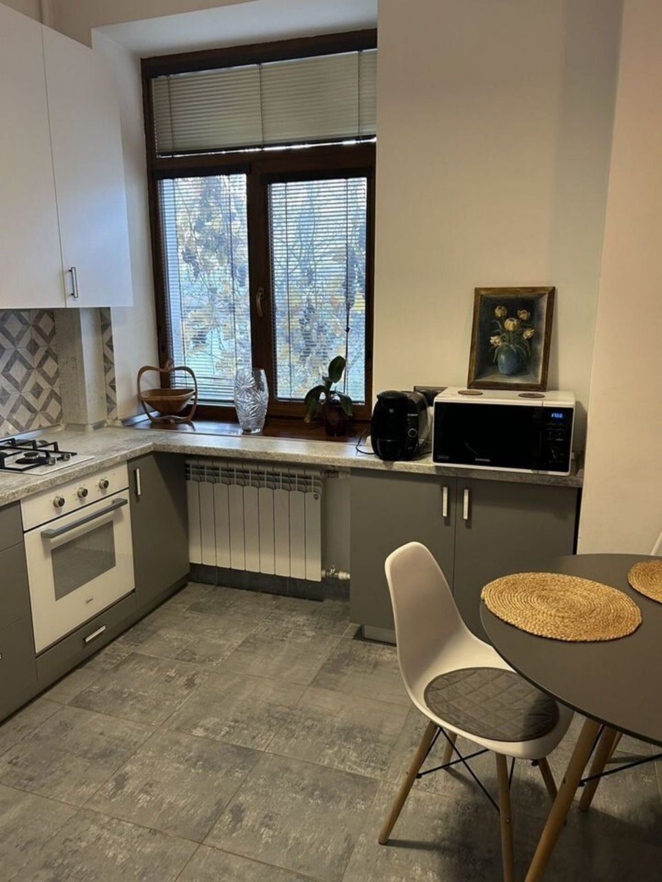 Кухня оснащена кофемашиной, микроволновой печью, духовым шкафом, электрочайником, газовой плитой, холодильником. В шаговой доступности кафе и другие заведения, где можно вкусно и сытно пообедать.
