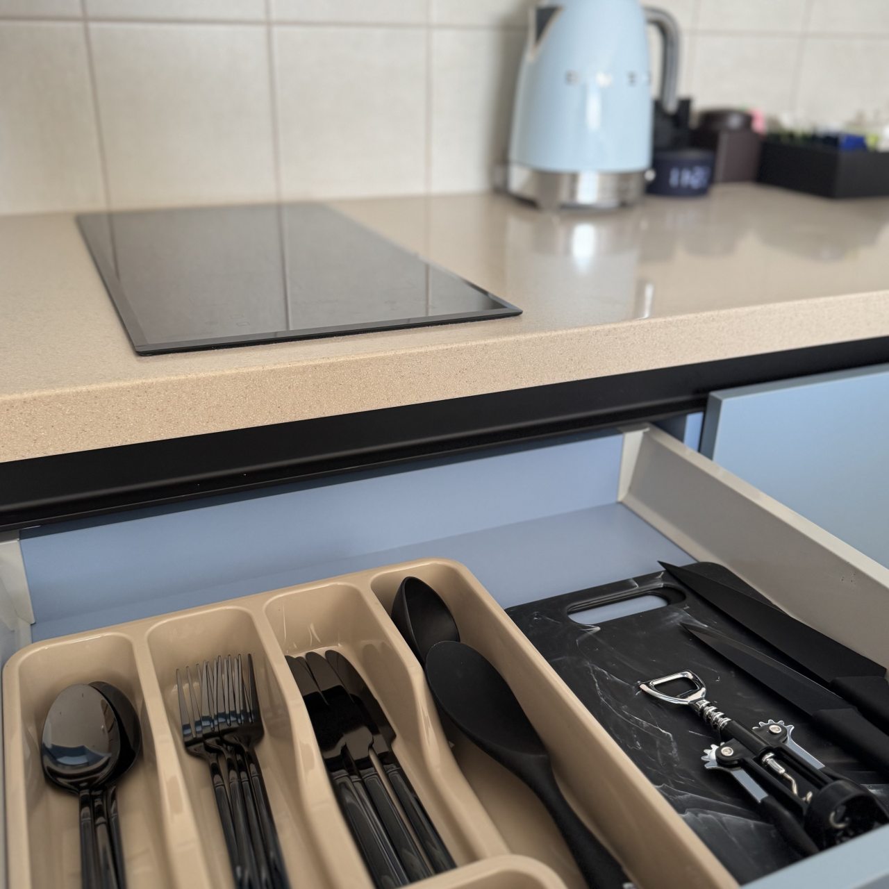 Кухонная зона оснащена чайником, варочной панелью, различными столовыми приборами, посудой, холодильником и красивой обеденной зоной, чтобы вы могли в любой момент насладиться любимой едой и напитками.