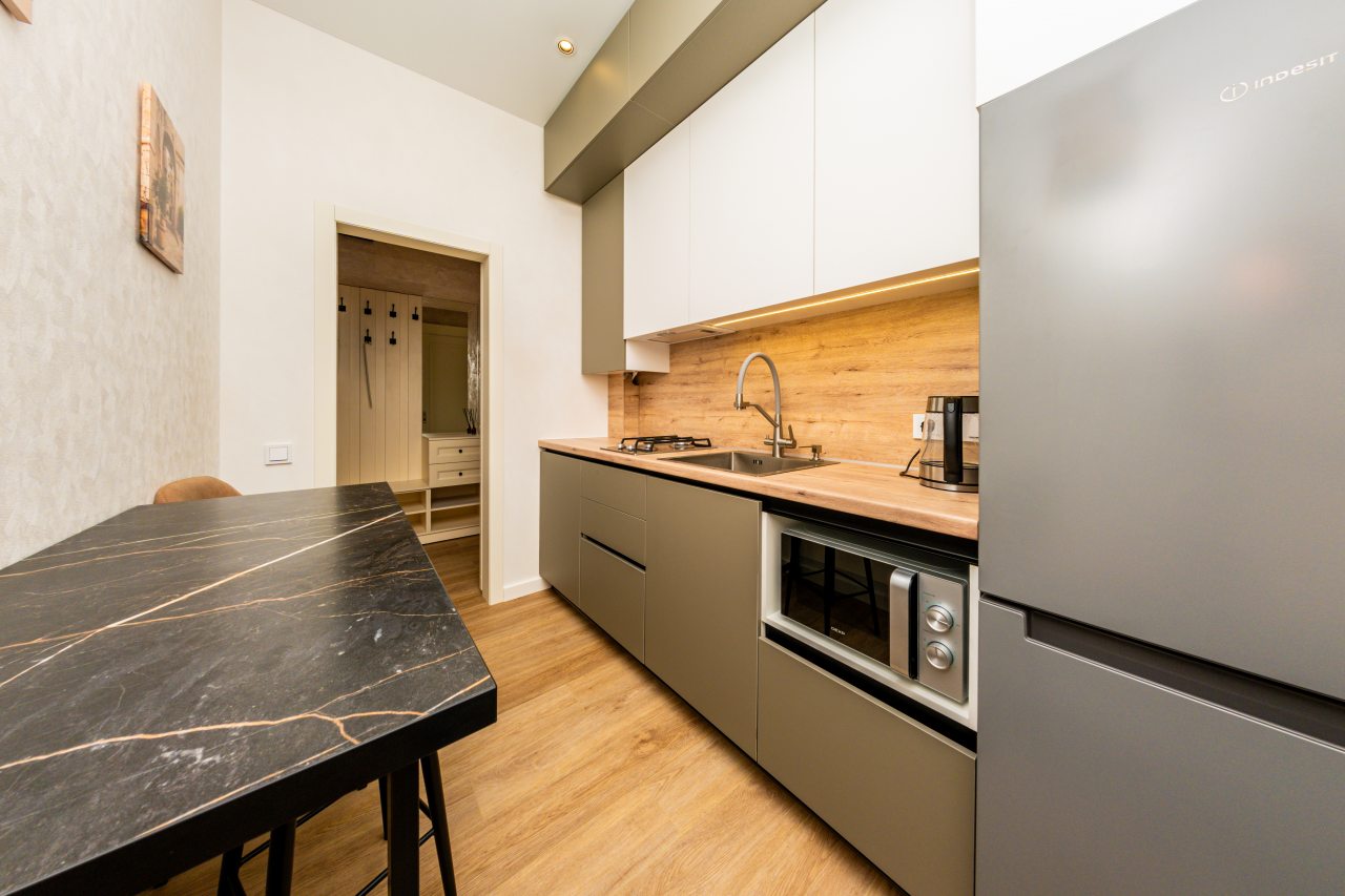 На кухне есть обеденный стол и кухонный гарнитур, укомплектованный бытовой техникой, благодаря которой можно самостоятельно приготовить блюда. В окрестностях располагается продуктовый магазин, кофейня и пекарня.