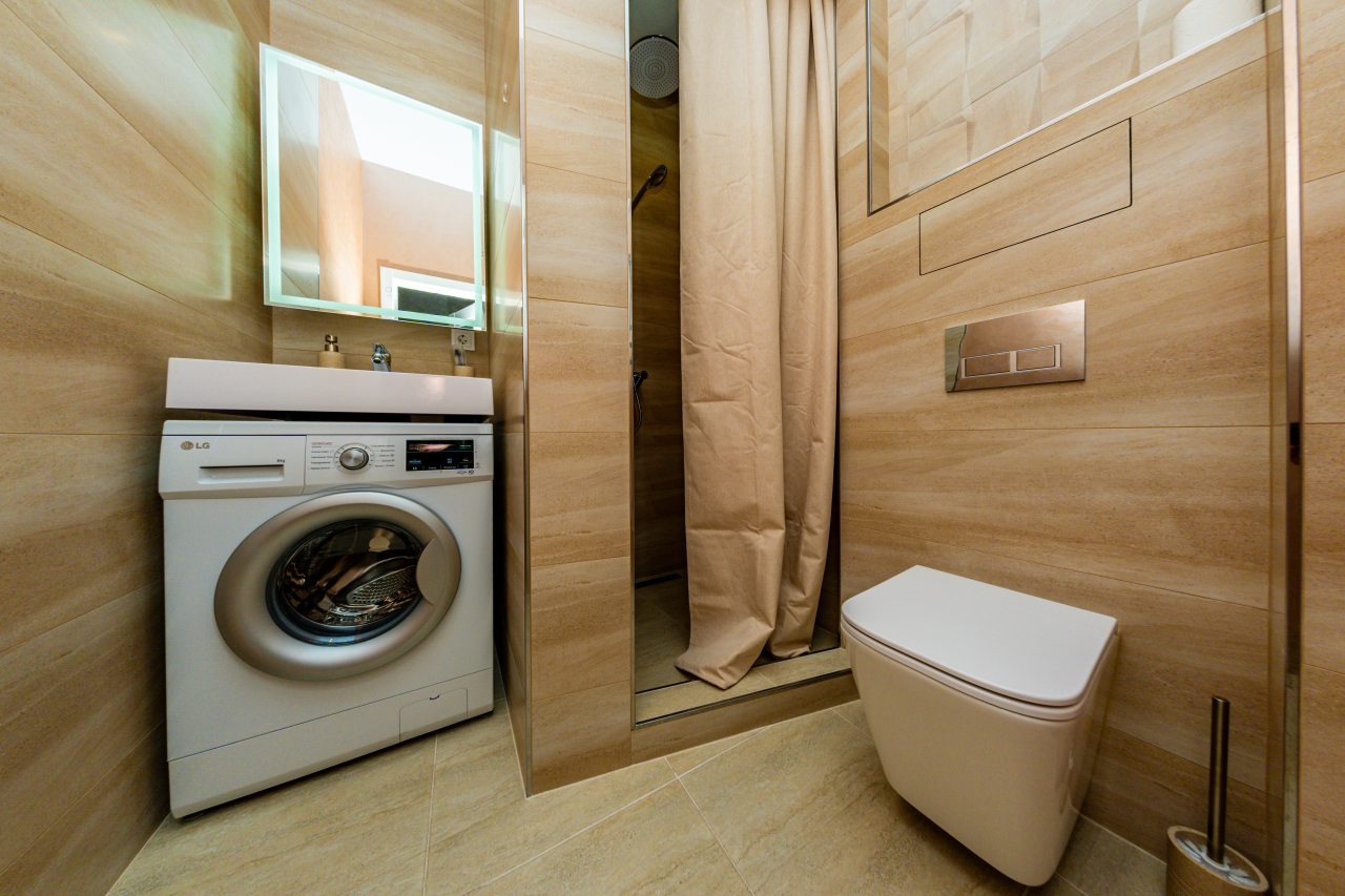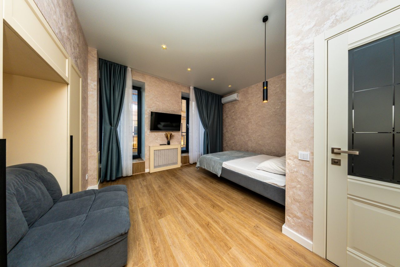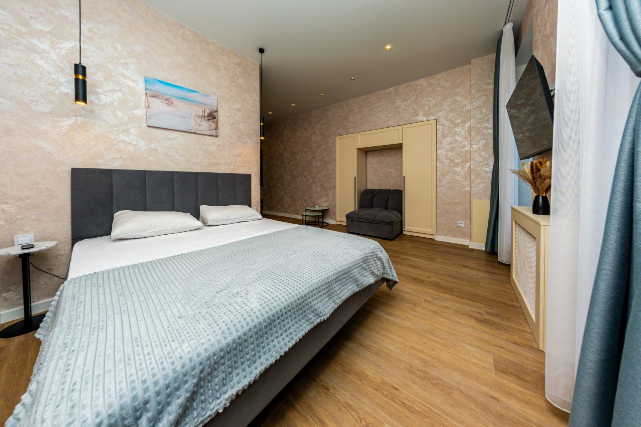 Апартаменты в классическом стиле готовы к размещению гостей и оснащены удобной мебелью и современной техникой. Имеется двуспальная кровать, кондиционер, мягкое кресло, телевизор. В санузле установлена сантехника и стиральная машина.