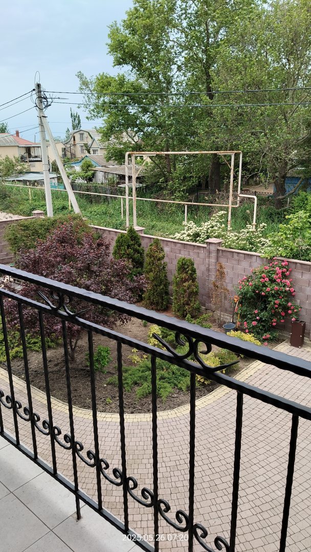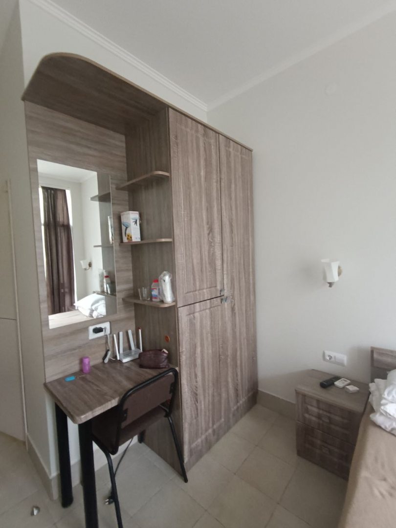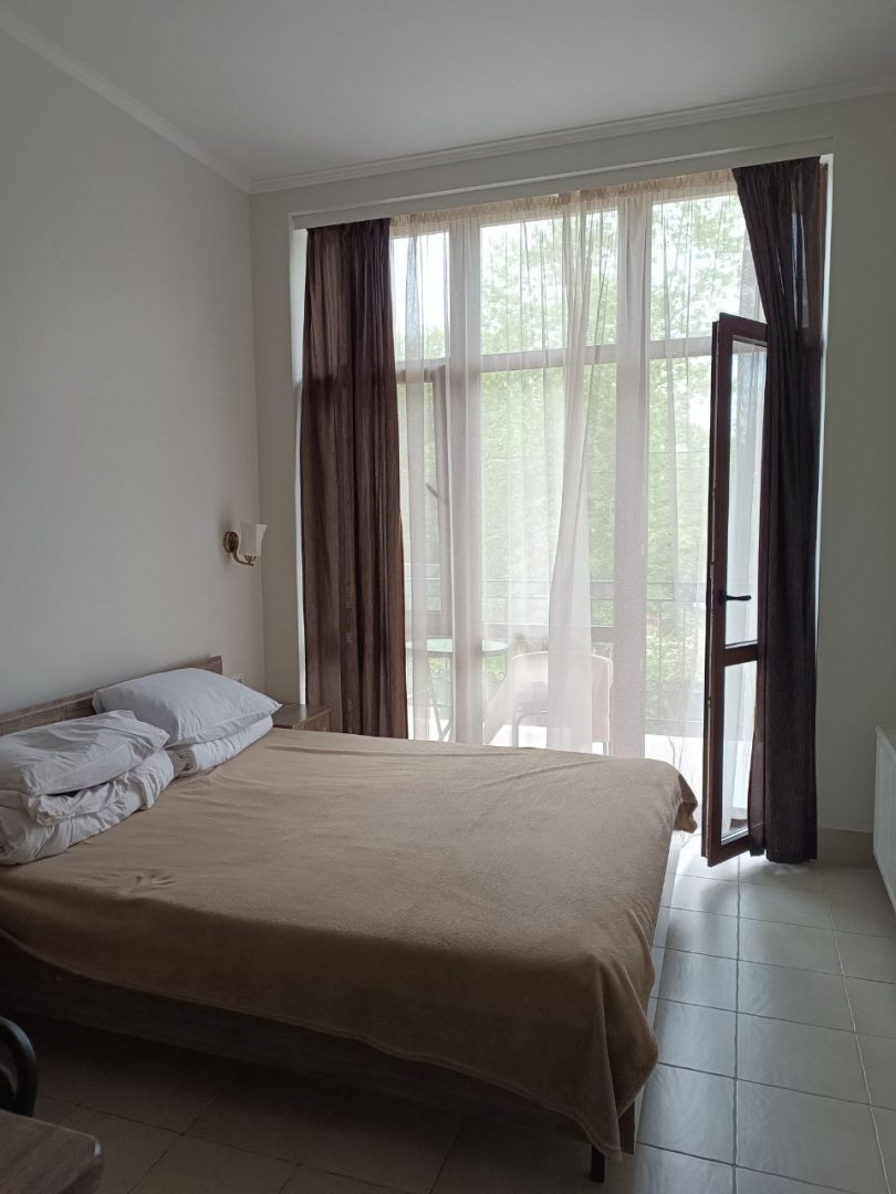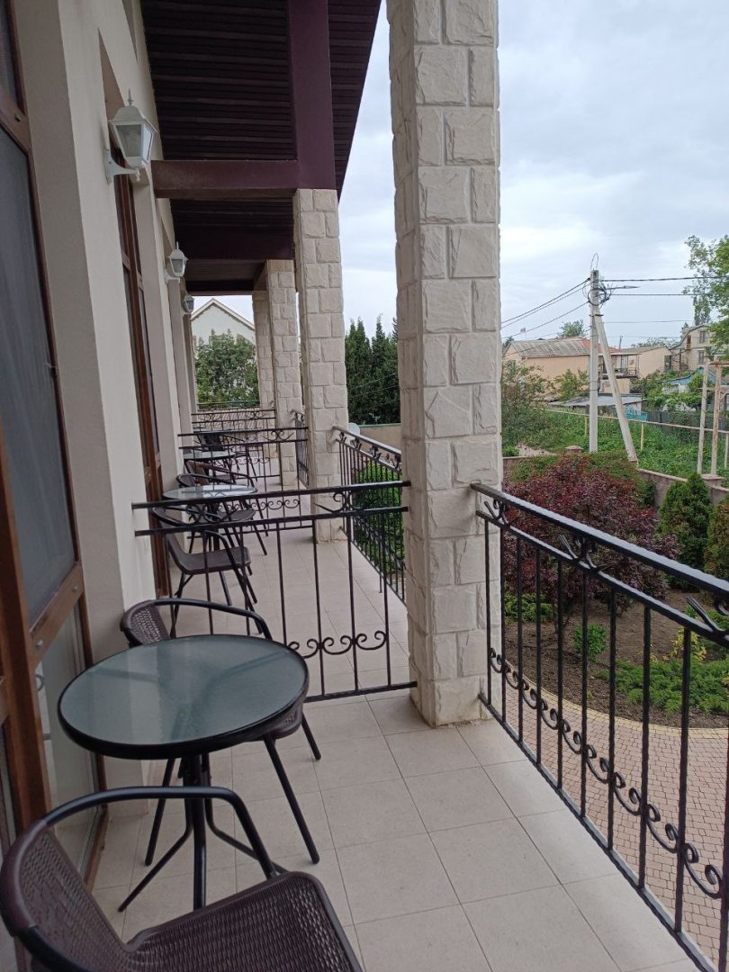 Гостевой дом отличный. Хозяева предусмотрели абсолютно все. В нашем двухместном номере маленький холодильник, фен, вместительный шкаф, сушилка для белья, телевизор, кондиционер, сетка на окне.На балконе столик и кресла. На этаже большой холодильник, плитка, микроволновка, стиральная машинка с порошком и кондиционером, гладильная доска, утюг, отдельный кранчик с питьевой водой. Двор весь в зелени. Вообщем, все прекрасно, советую