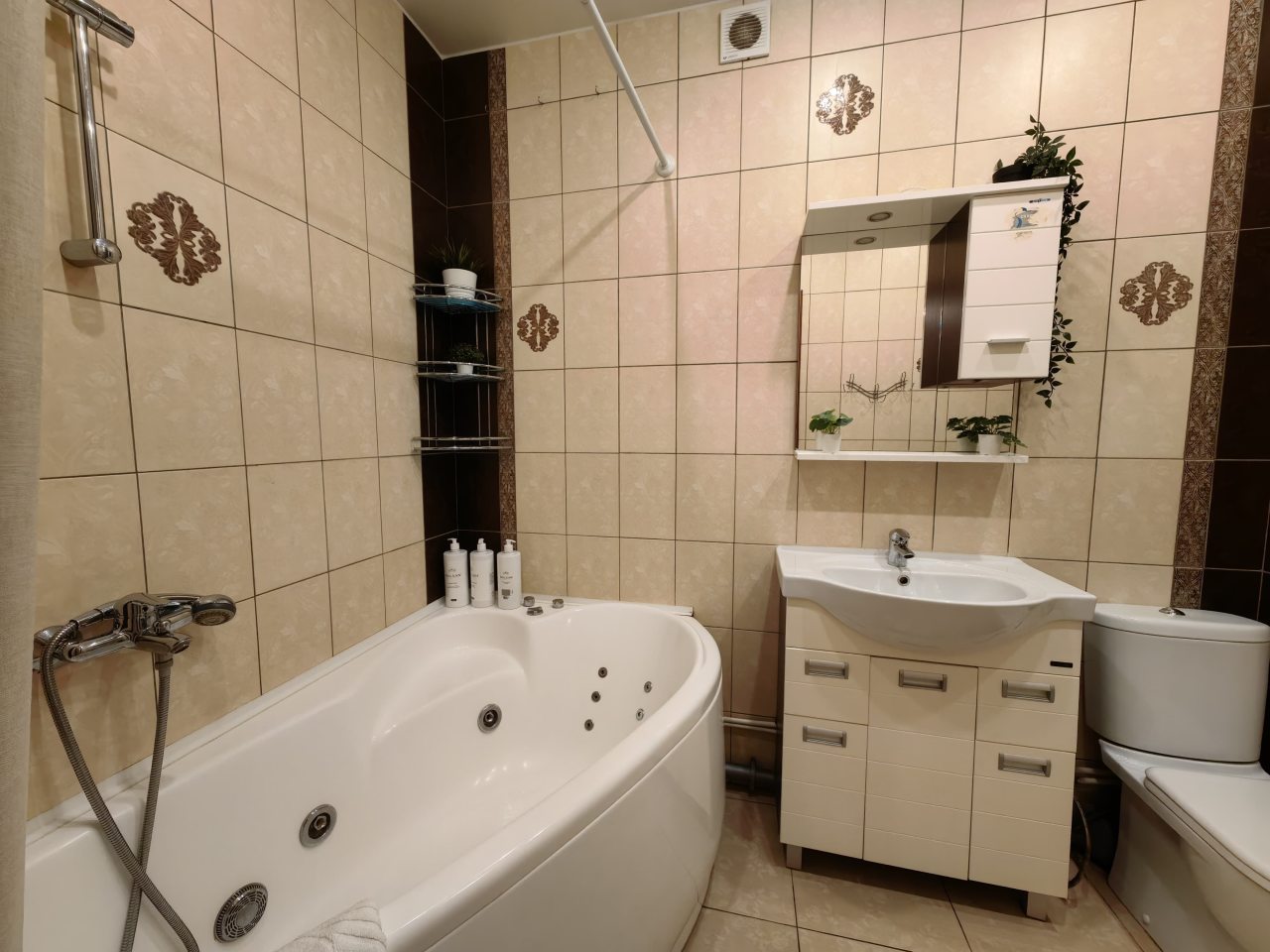 По-домашнему уютная квартира оснащена всем необходимым для комфортного проживания постояльцев. Здесь есть: двуспальная кровать, шкаф-купе, гладильные принадлежности, телевизор, можно подключиться к сети Wi-Fi. Санузел оборудован гидромассажной ванной, стиральной машиной, есть полотенца, фен и средства личной гигиены.
