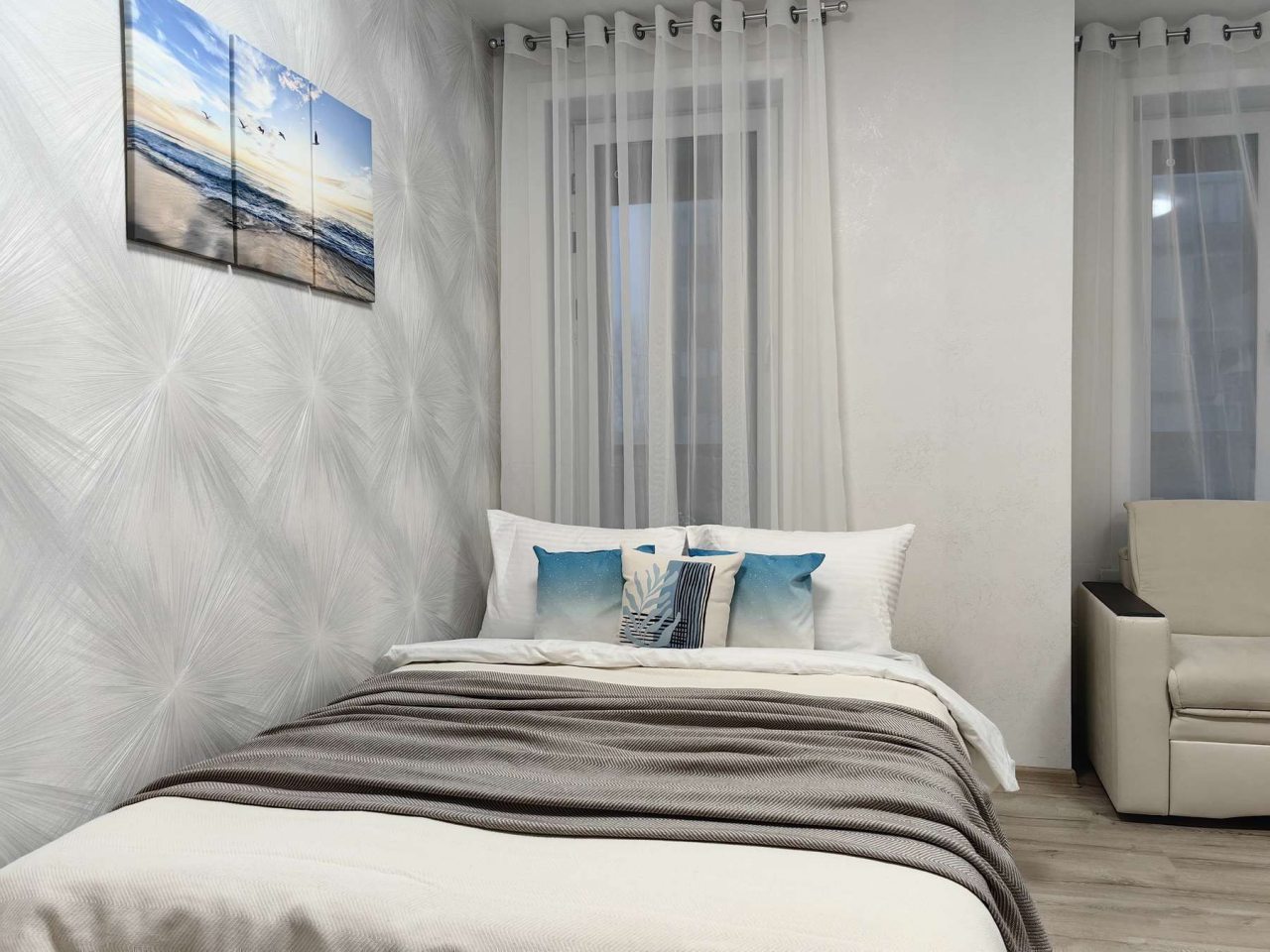 В светлой квартире есть раскладной диван-кровать, ЖК-телевизор и уютный балкончик, на котором стоит журнальный стол со стульями, работает Wi-Fi. В отдельной ванной комнате: раковина, туалет, ванна, средства личной гигиены.