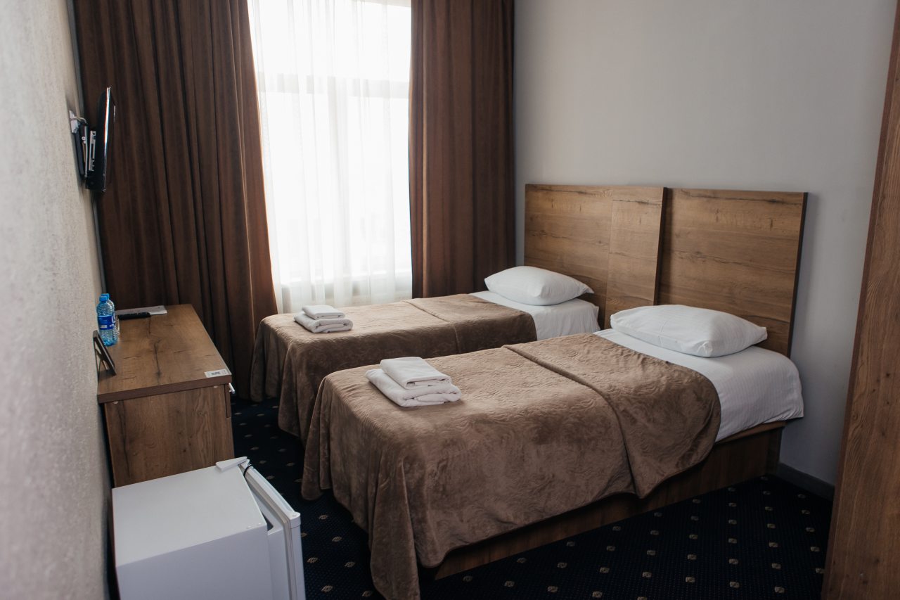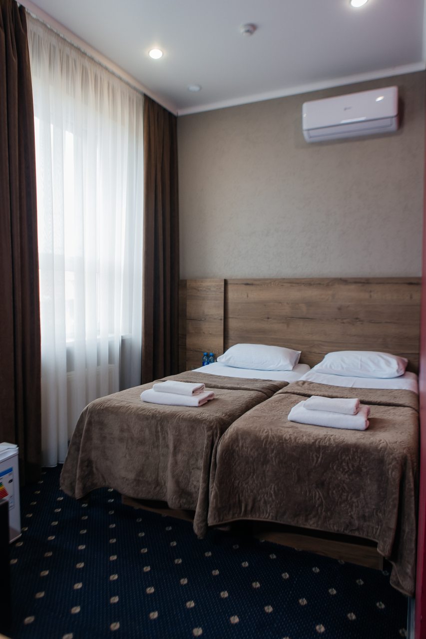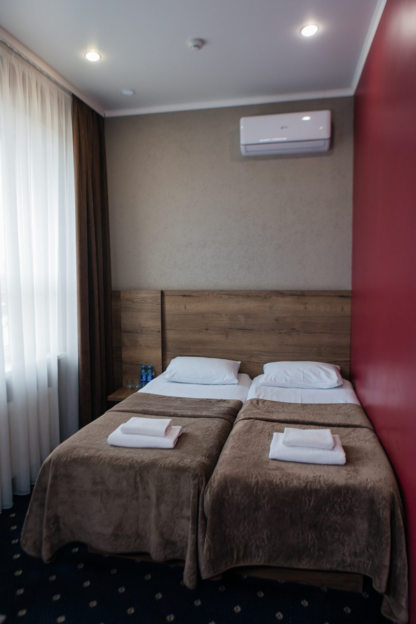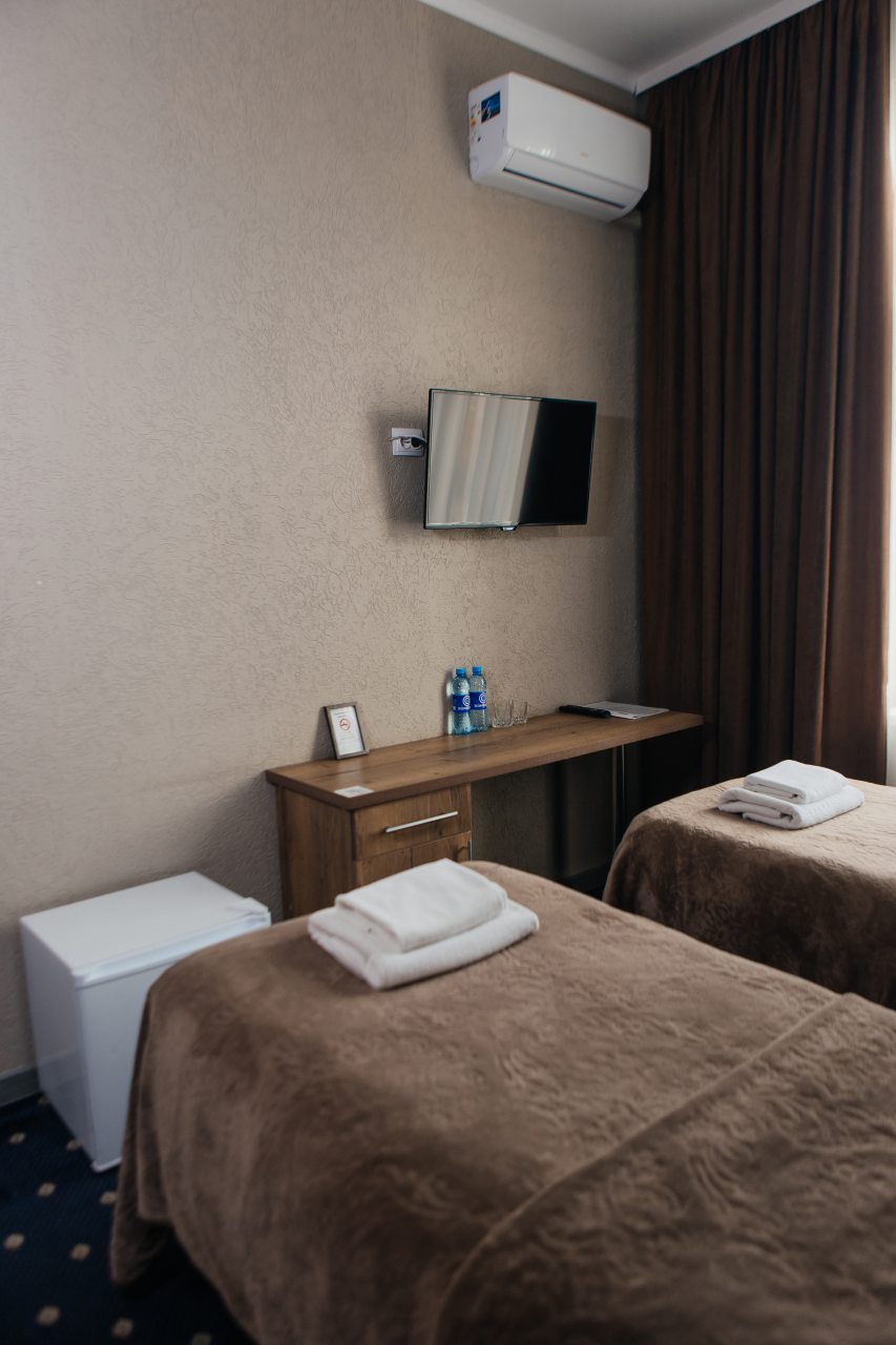 в номер. Номер небольшой, но всё есть: телевизор, сплит-система, удобные кровати, постельное хорошего качества. Завтрак входил в оплату. В меню было 2 вида каши, колбаса, сыр и масло. Всё съедобное. Отдельное спасибо хозяйке столовой. Очень вежливо встретила, сделала