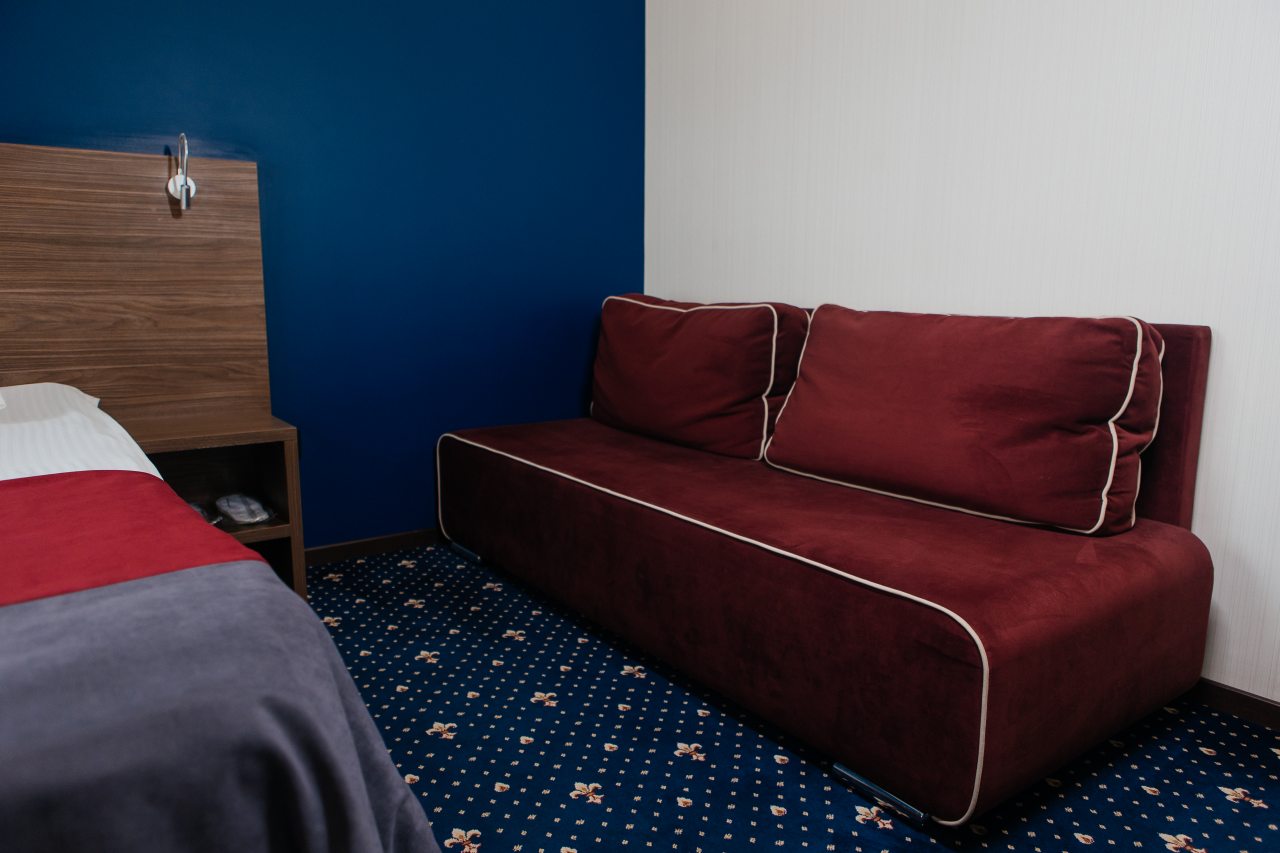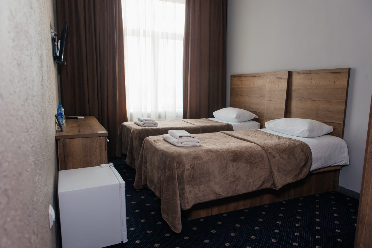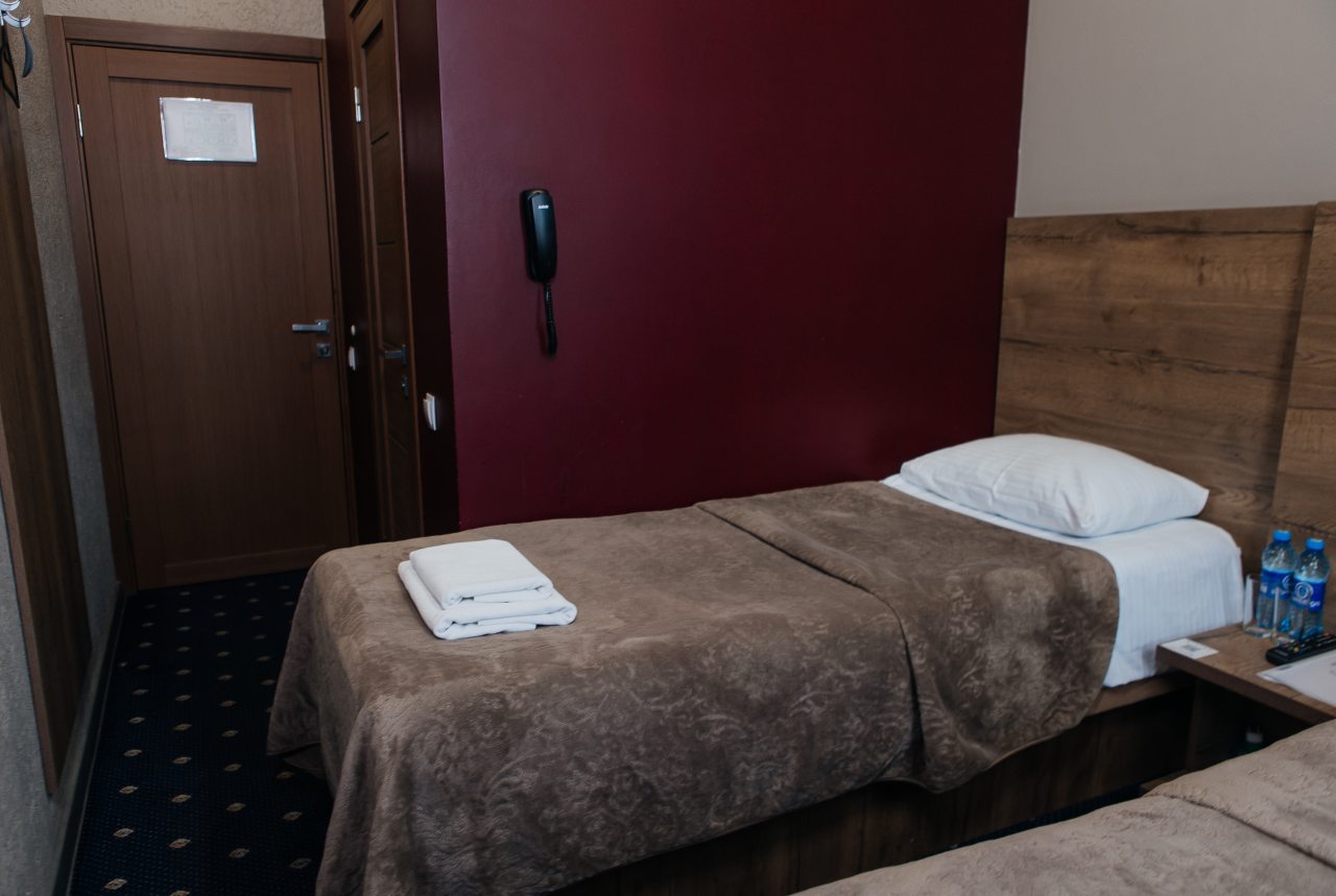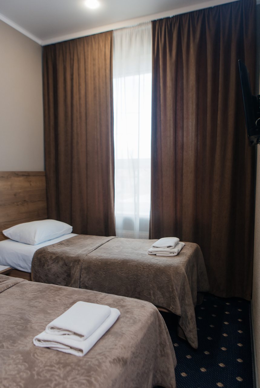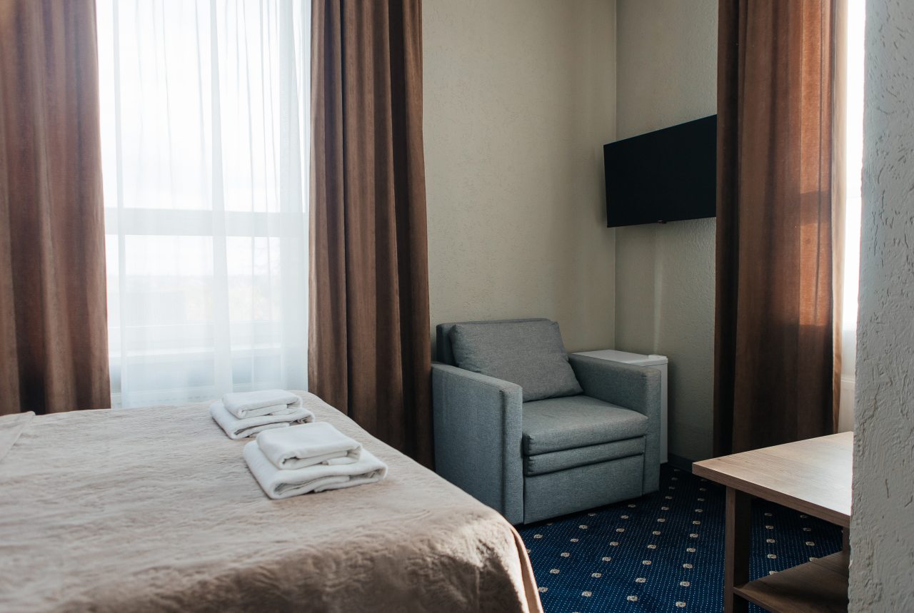 в номер. Номер небольшой, но всё есть: телевизор, сплит-система, удобные кровати, постельное хорошего качества. Завтрак входил в оплату. В меню было 2 вида каши, колбаса, сыр и масло. Всё съедобное. Отдельное спасибо хозяйке столовой. Очень вежливо встретила, сделала