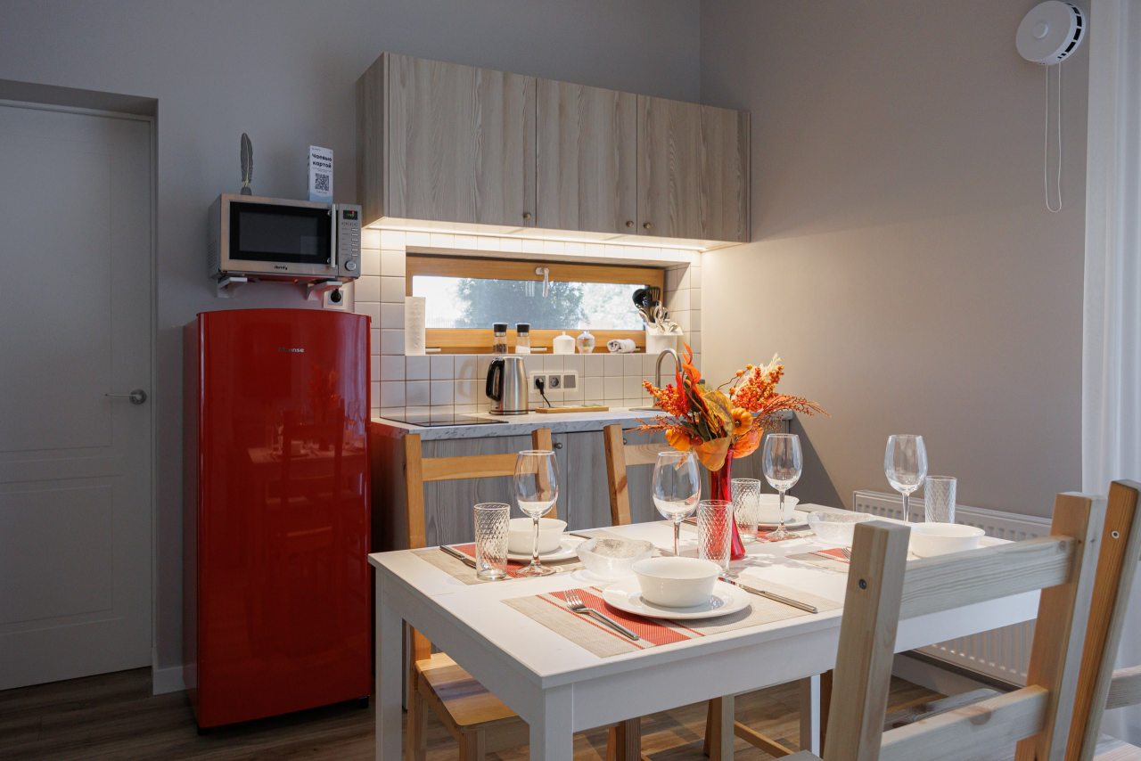 Кухня укомплектована бытовыми приборами и набором посуды для приготовления еды. Около домиков оборудованы мангальные зоны. А поблизости работает кафе-пекарня.