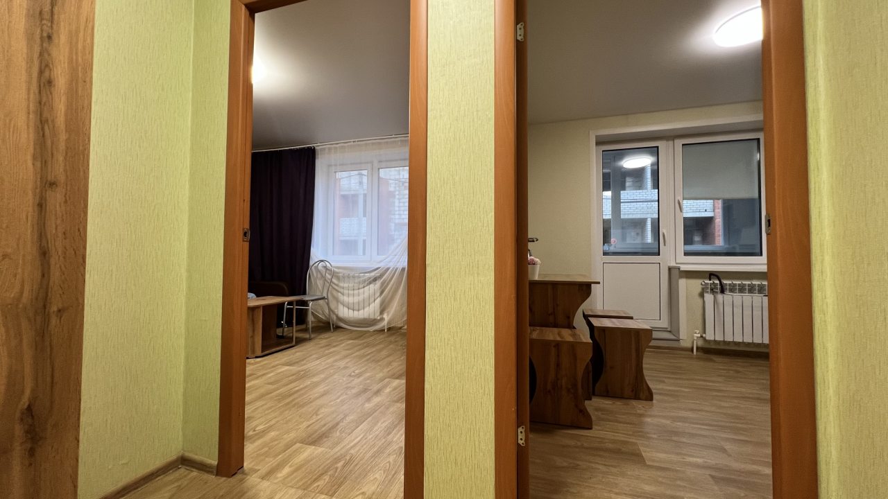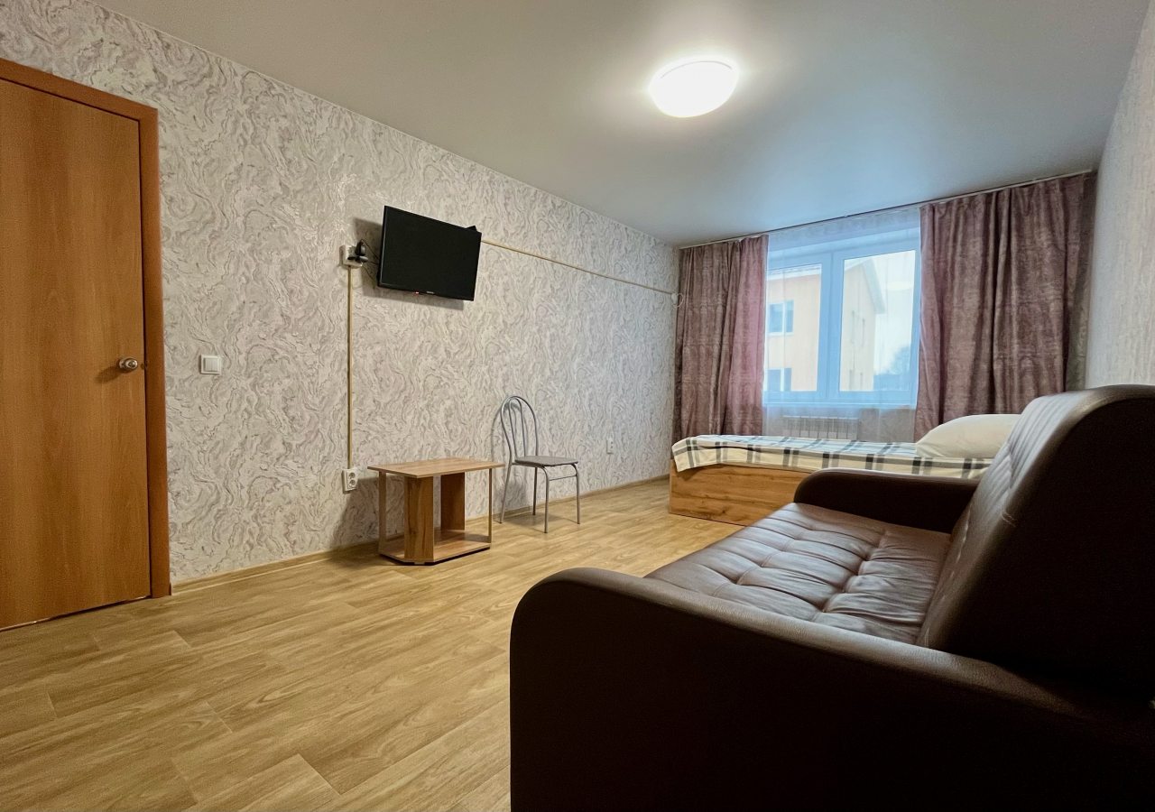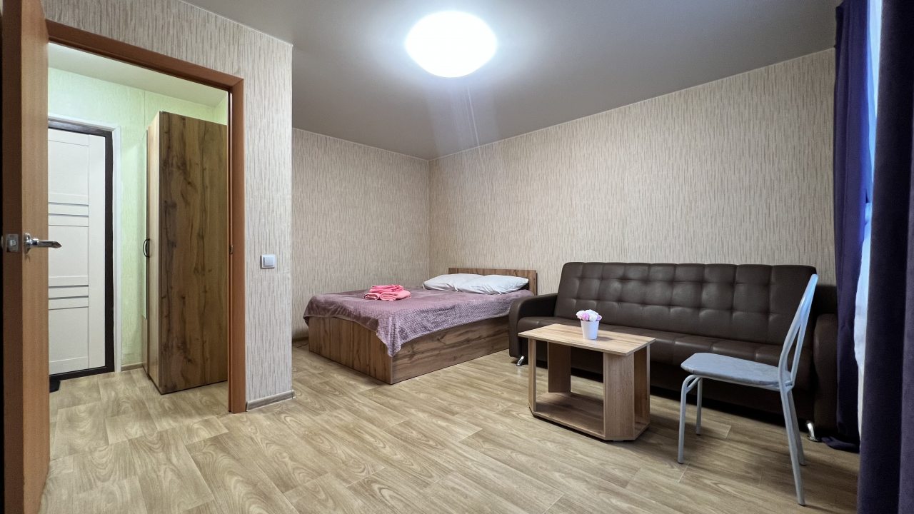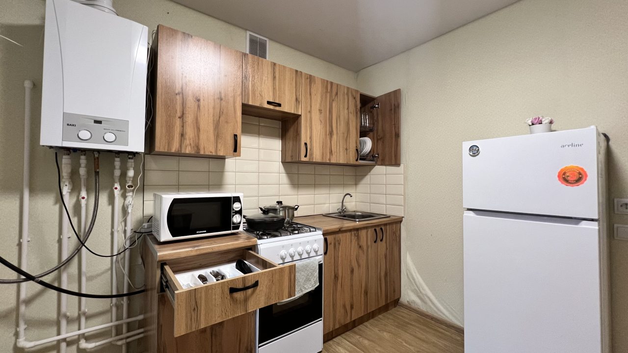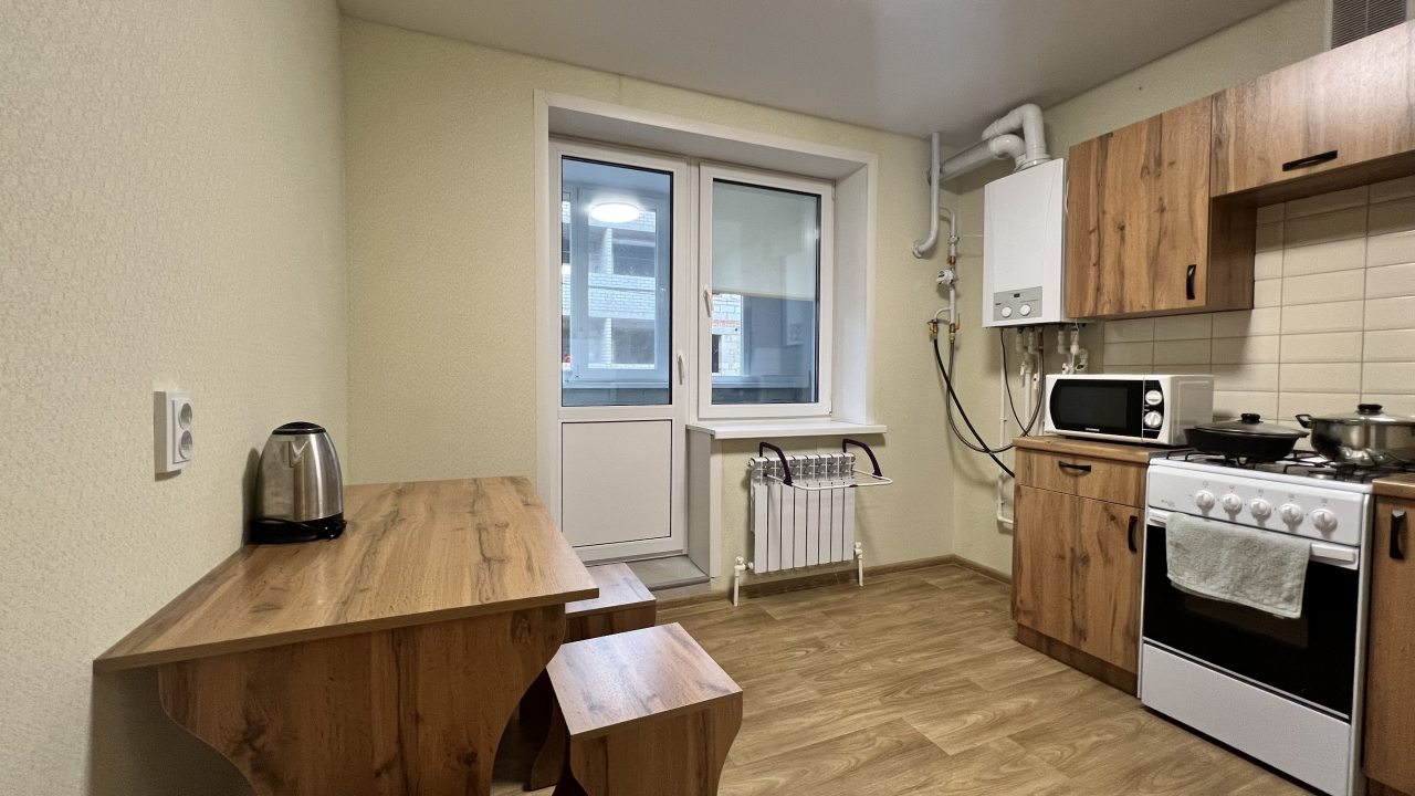 Квартира расположена недалеко от центра поселка, что очень удобно. В ней минимум мебели, но все необходимое есть: и кровать, и диван, и телевизор. Для комфортного проживания также есть плотные шторы, благодаря которым дневной свет не будет мешать по утрам. Техника на кухне работает хорошо, есть набор посуды и столовых приборов.