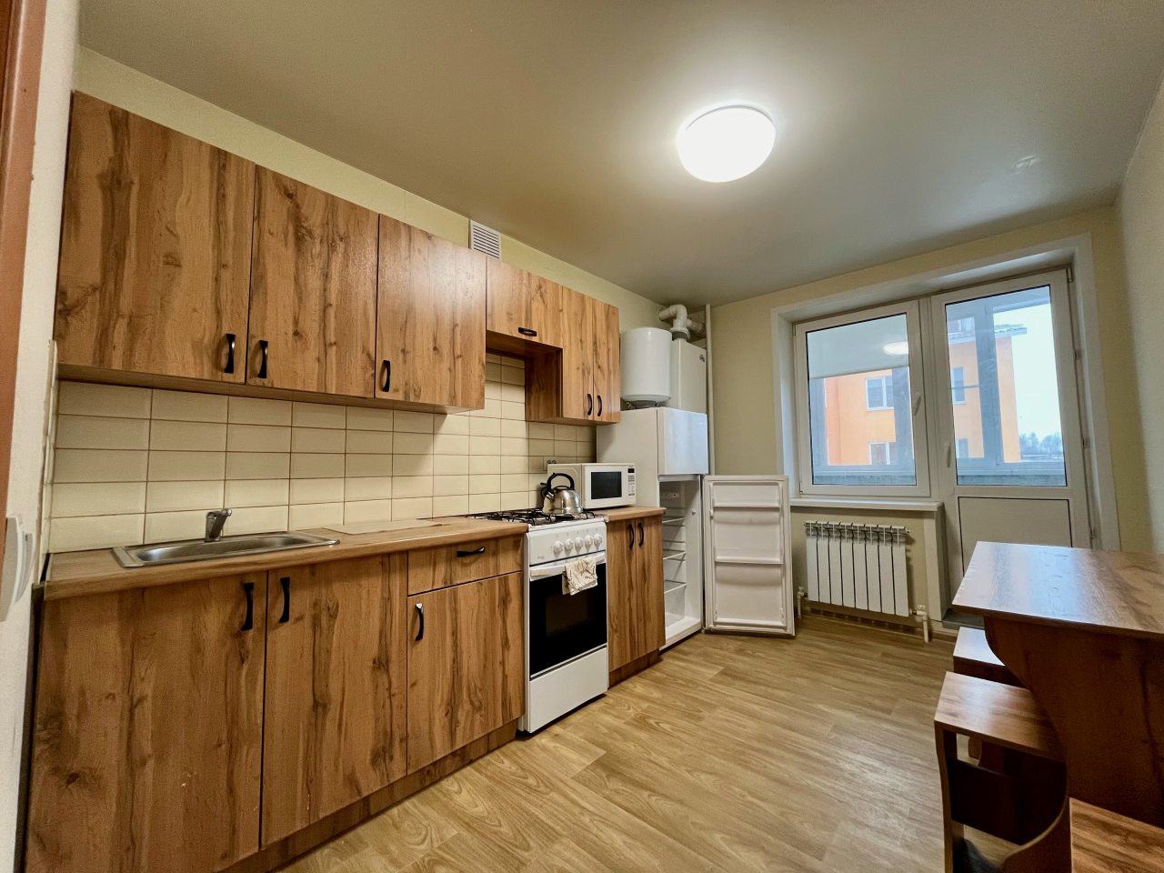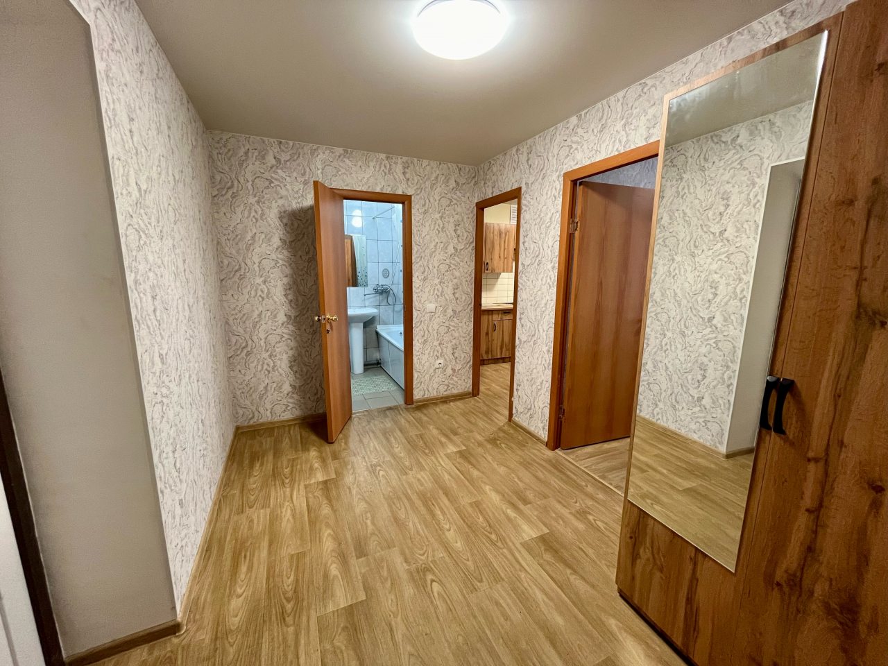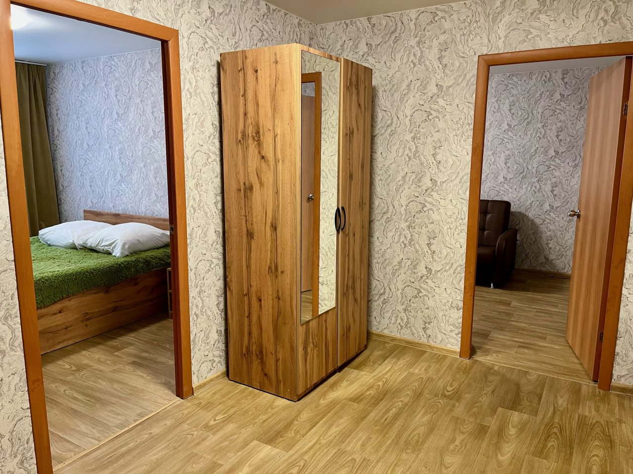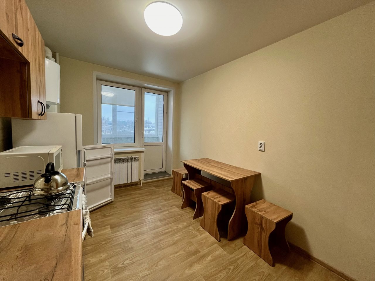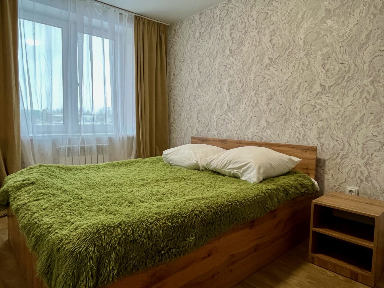 Квартира расположена недалеко от центра поселка, что очень удобно. В ней минимум мебели, но все необходимое есть: и кровать, и диван, и телевизор. Для комфортного проживания также есть плотные шторы, благодаря которым дневной свет не будет мешать по утрам. Техника на кухне работает хорошо, есть набор посуды и столовых приборов.