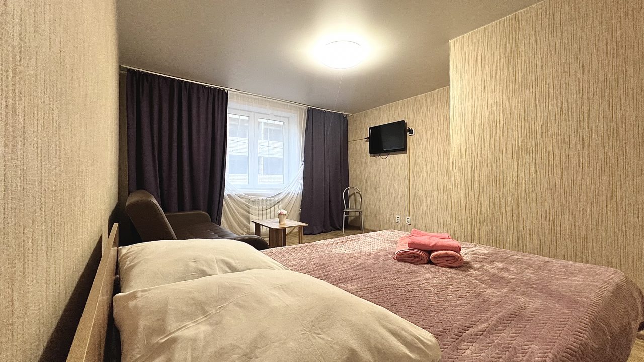 Квартира находится в самом центре. Тут рядом есть красивые места. Это хороший вариант для туриста. В номере есть все условия, выдают чистую постель и полотенца. Ванная комната была в моем распоряжении, кухня. Можно самому готовить еду, ведь рядом возле новостройки есть магазин с продуктами питания.