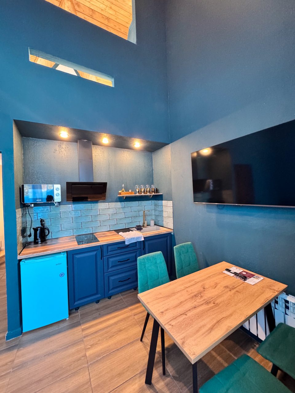 Гостям предлагается разместиться в больших и современных номерах, где дизайн продуман до мельчайших деталей. Здесь большие и мягкие кровати с постельным бельем из 100% хлопка, где вы можете вдоволь выспаться, пол с подогревом, сушилка для одежды, ванная комната с тропическим душем, телевизор с онлайн-кинотеатрами, Wi-Fi. Устроившись на террасе, можно любоваться невероятной красотой горного пейзажа.