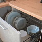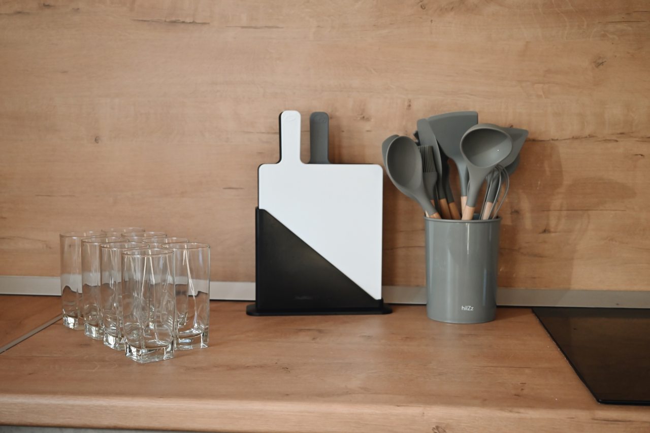 На просторной кухне можно готовить самому. Для этого есть все необходимое: варочная панель, СВЧ печь, духовой шкаф, холодильник, вытяжка, вся необходимая посуда и приборы.