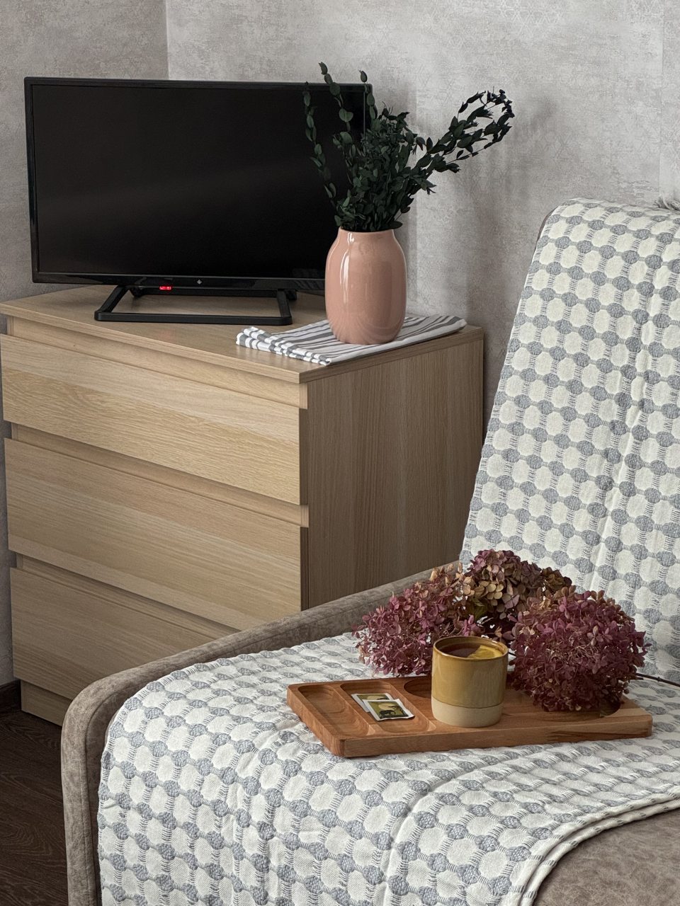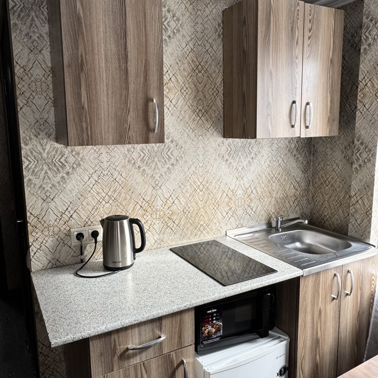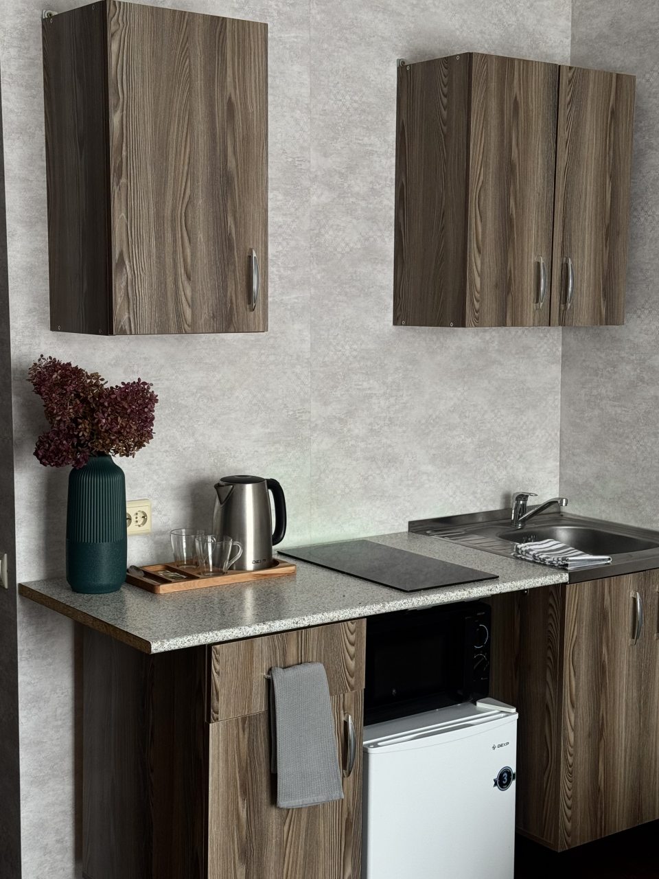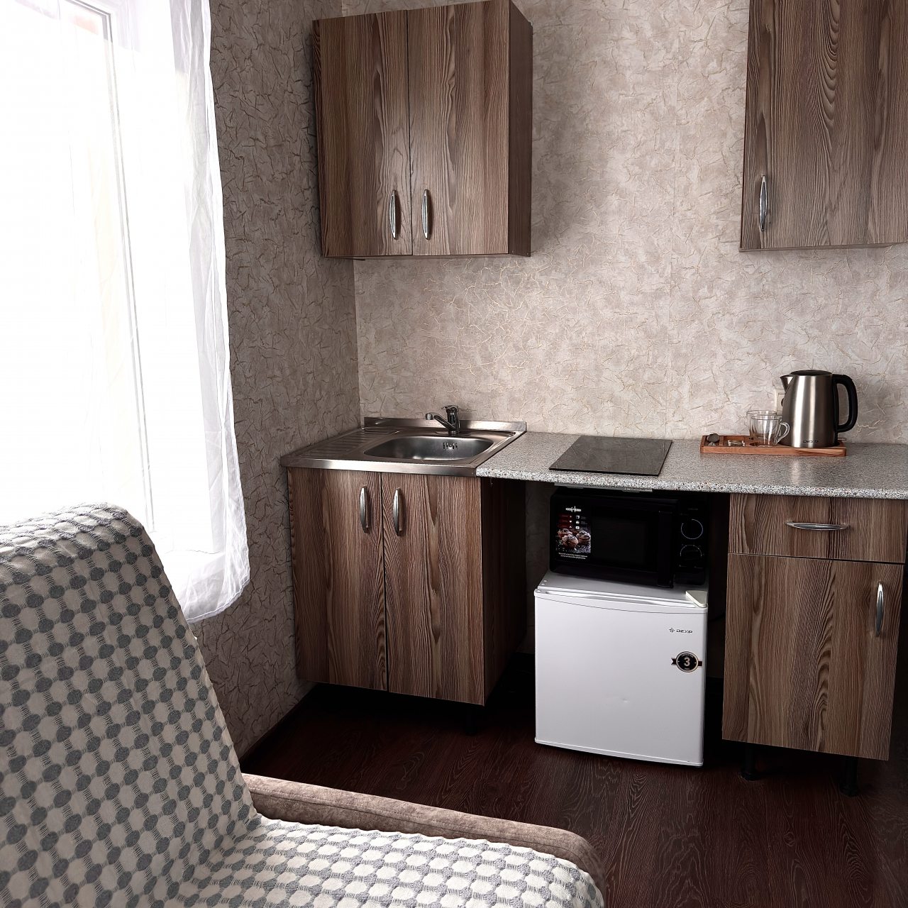 Каждый номер укомплектован мини-кухней, чтобы вы в любое время могли порадовать себя любимой едой и напитками. В наличии варочная панель, СВЧ, чайник, холодильник.