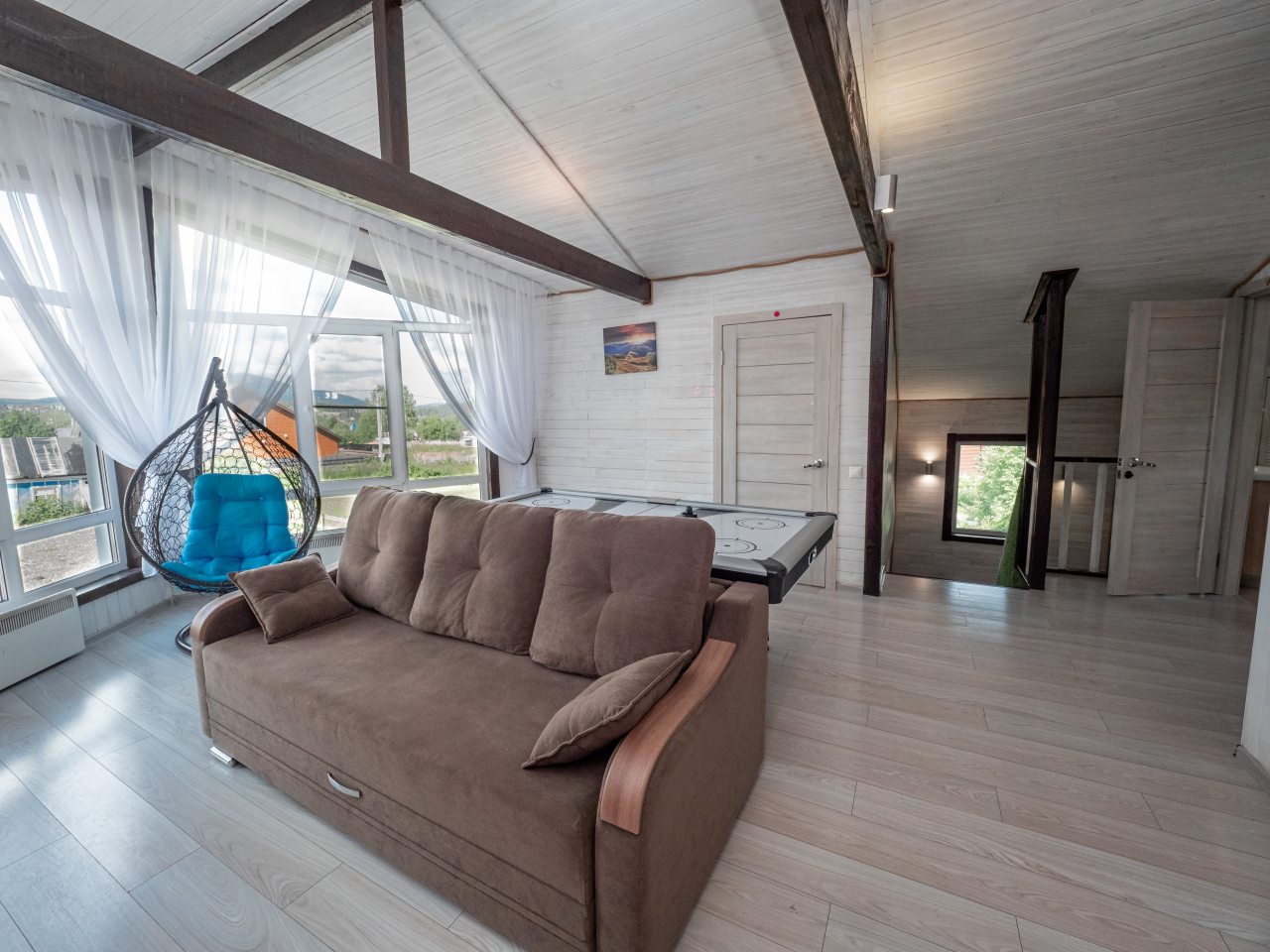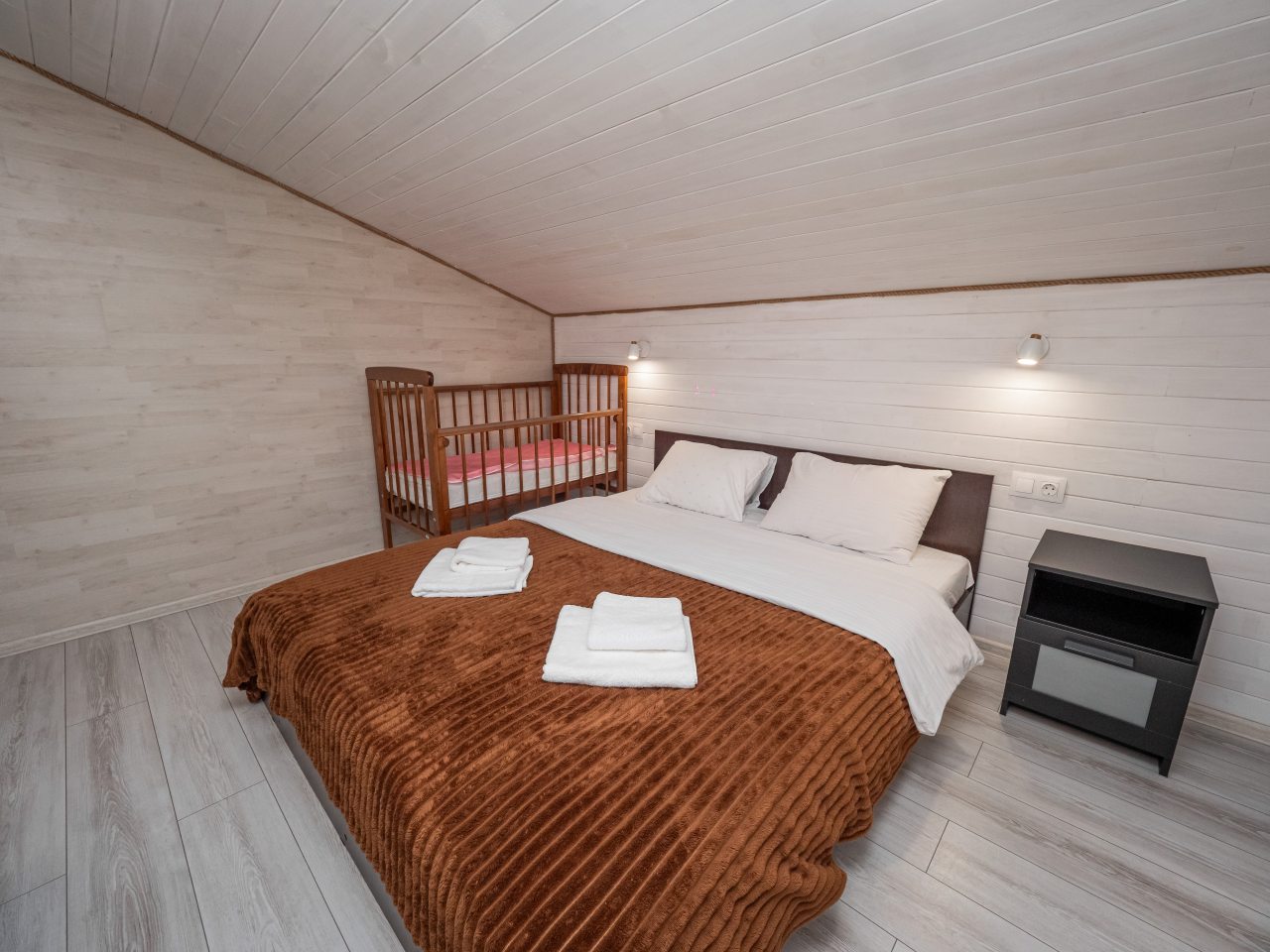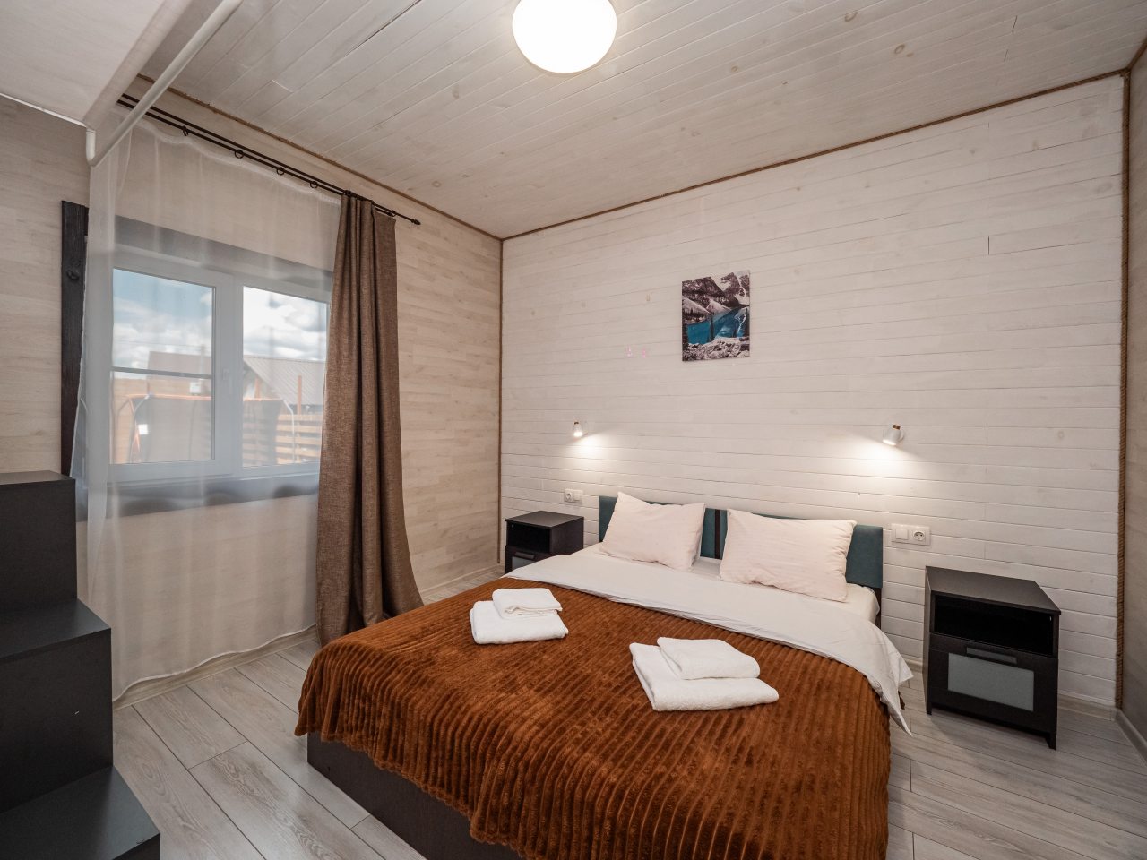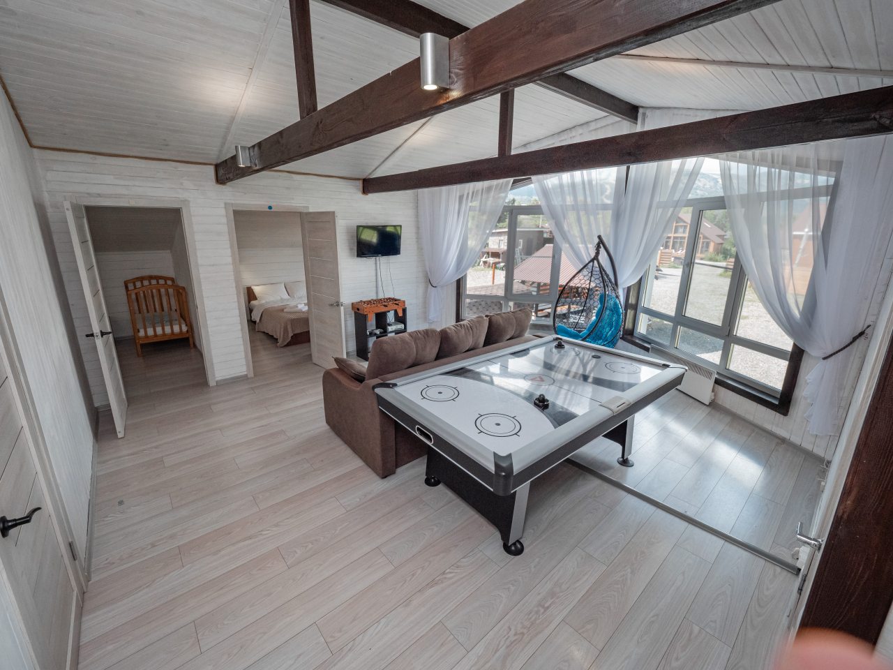 Благодаря большой площади дома в 160 квадратных метров, его вместимость — от одного до четырнадцати гостей. Идеальный вариант для семей или большой компании. Так, внутри предусмотрены теплые полы в прихожей и сушилка для горнолыжной амуниции, удобные двуспальные кровати и мягкие диваны, детская кроватка. Среди дополнительных удобств — телевизор с игровой приставкой, светомузыка, доступ к Wi-Fi, несколько санузлов с душем и стиральной машинкой, средствами гигиены. Весело провести время можно за настольными играми.