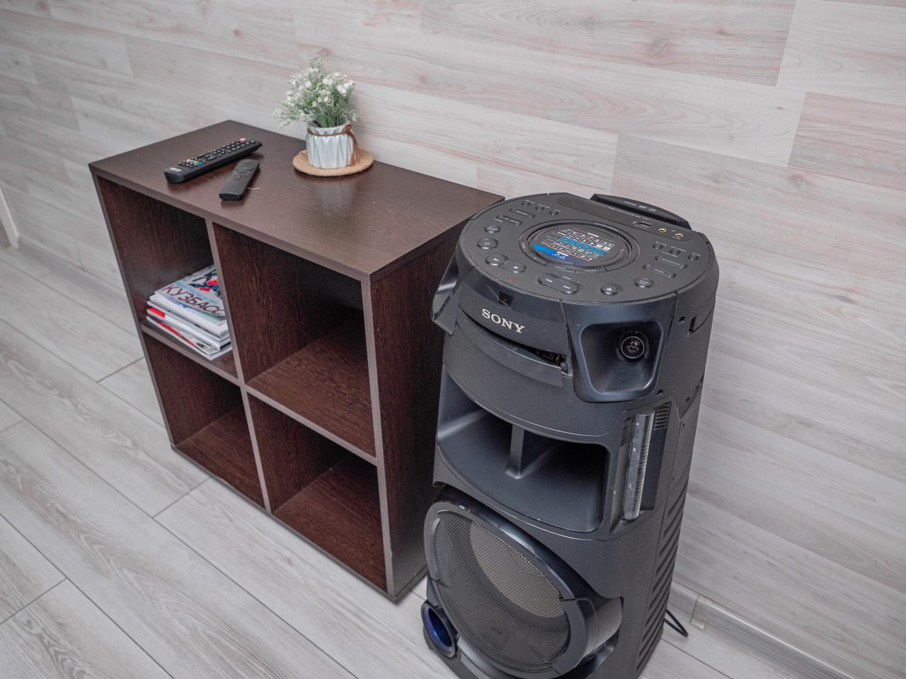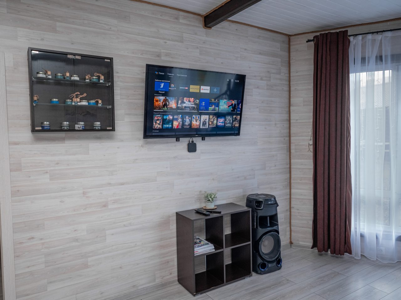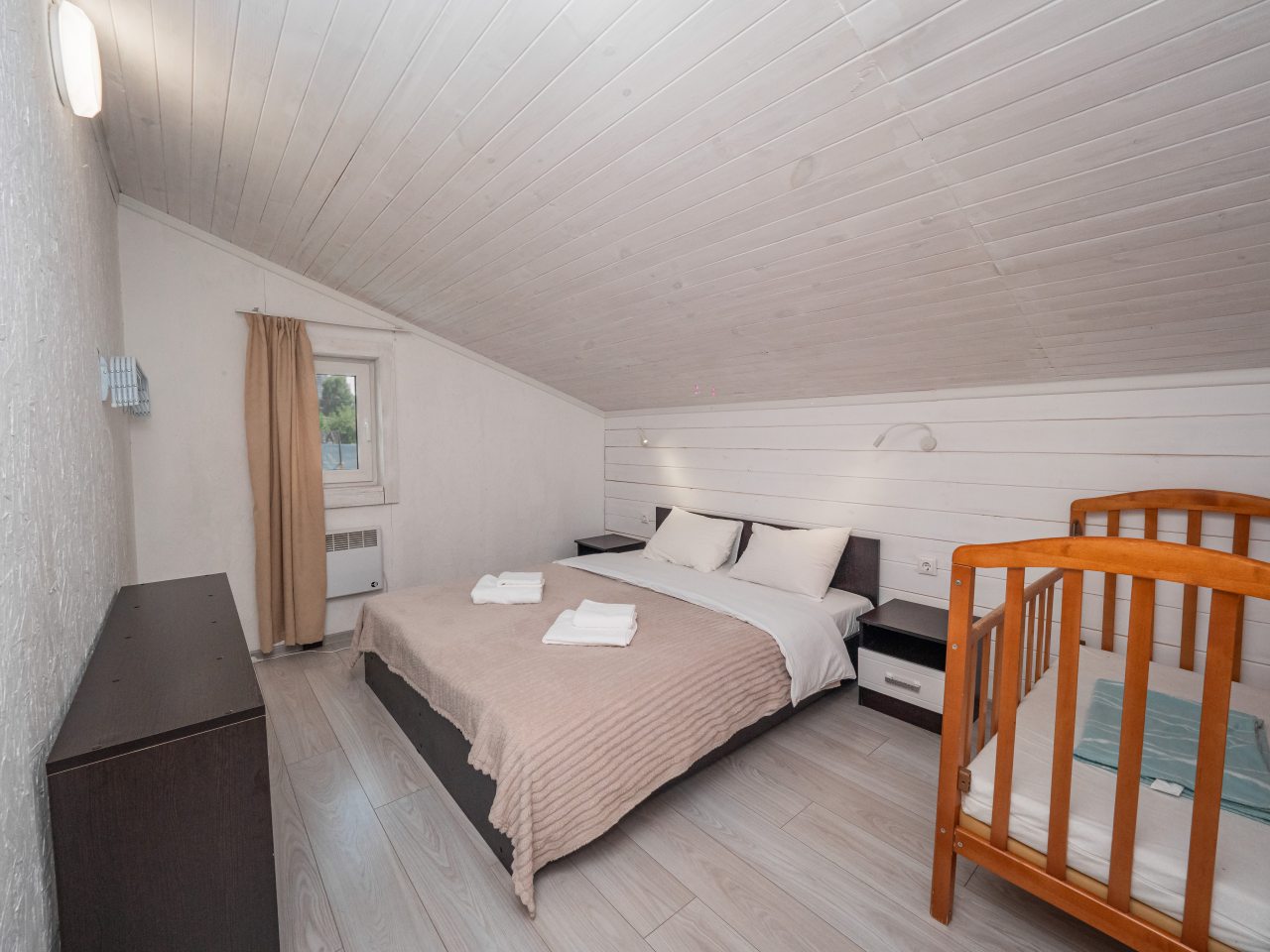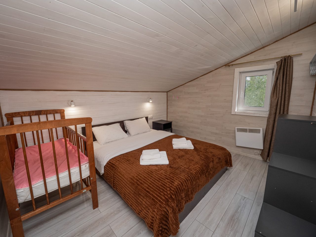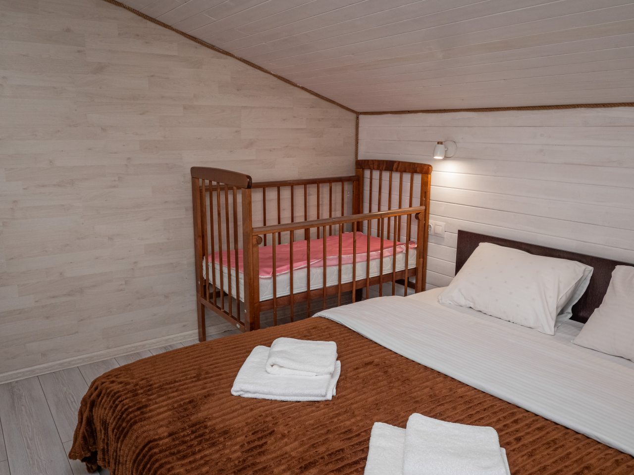 Благодаря большой площади дома в 160 квадратных метров, его вместимость — от одного до четырнадцати гостей. Идеальный вариант для семей или большой компании. Так, внутри предусмотрены теплые полы в прихожей и сушилка для горнолыжной амуниции, удобные двуспальные кровати и мягкие диваны, детская кроватка. Среди дополнительных удобств — телевизор с игровой приставкой, светомузыка, доступ к Wi-Fi, несколько санузлов с душем и стиральной машинкой, средствами гигиены. Весело провести время можно за настольными играми.