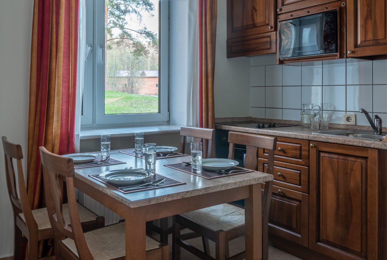 К размещению представлены уютные домики и коттеджи разной вместимости. Роскошное убранство, функциональная мебель и техника представлены для удобства гостей. Есть несколько спален с удобными кроватями, гостиная с мягкой мебелью и телевизором, а также кухня с обеденным столом на несколько персон, где можно расположиться всей семьей на праздничный ужин.