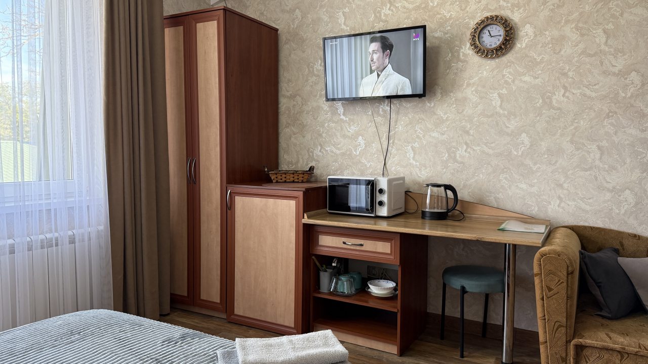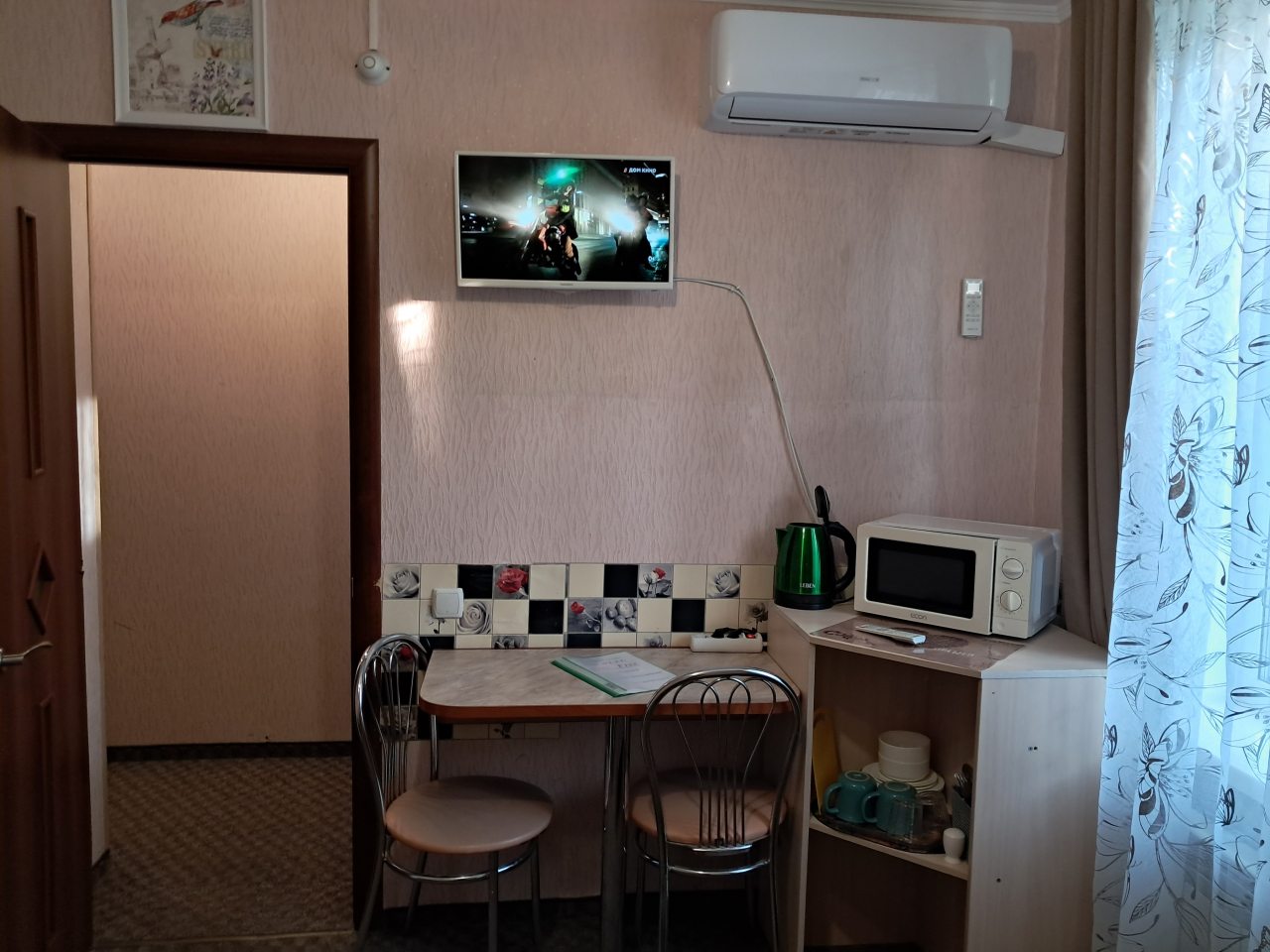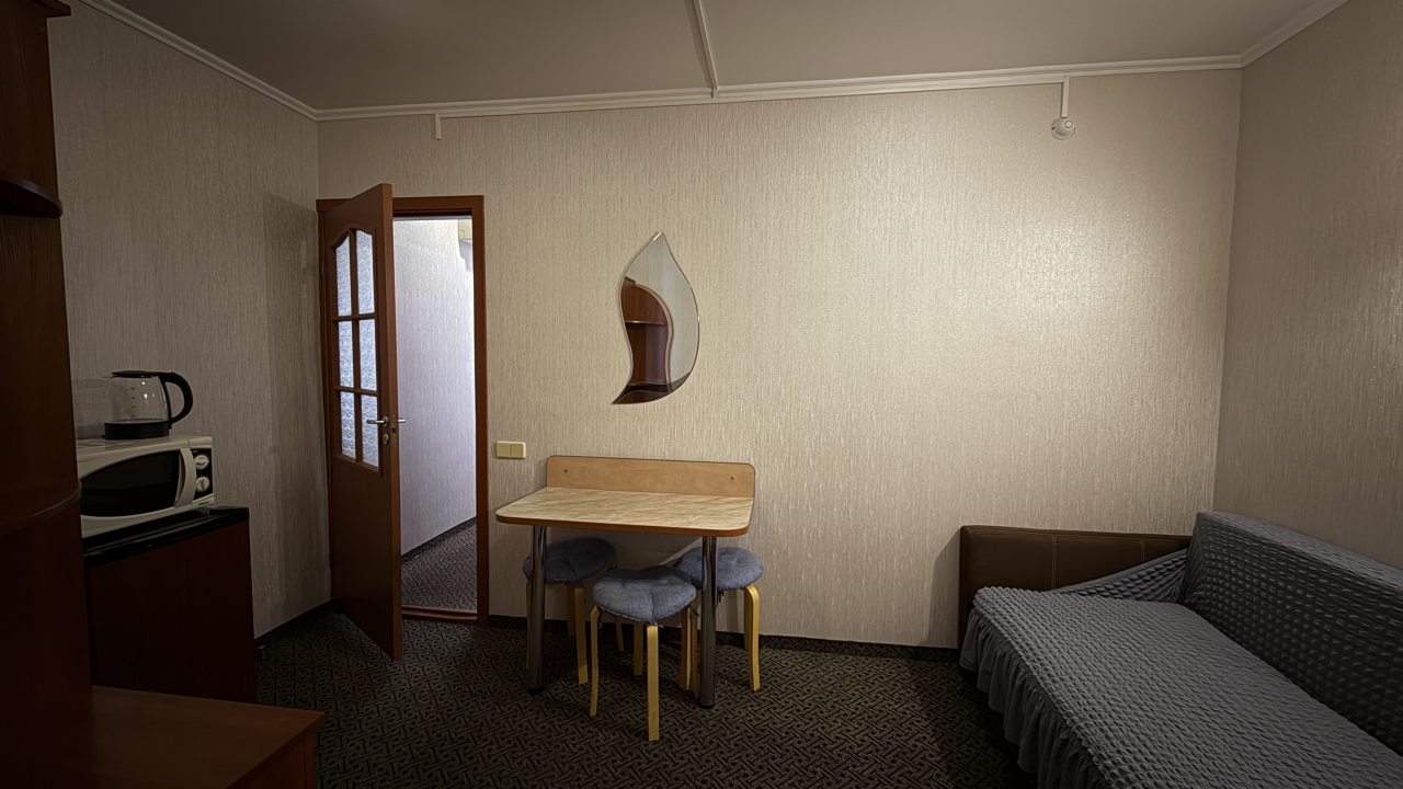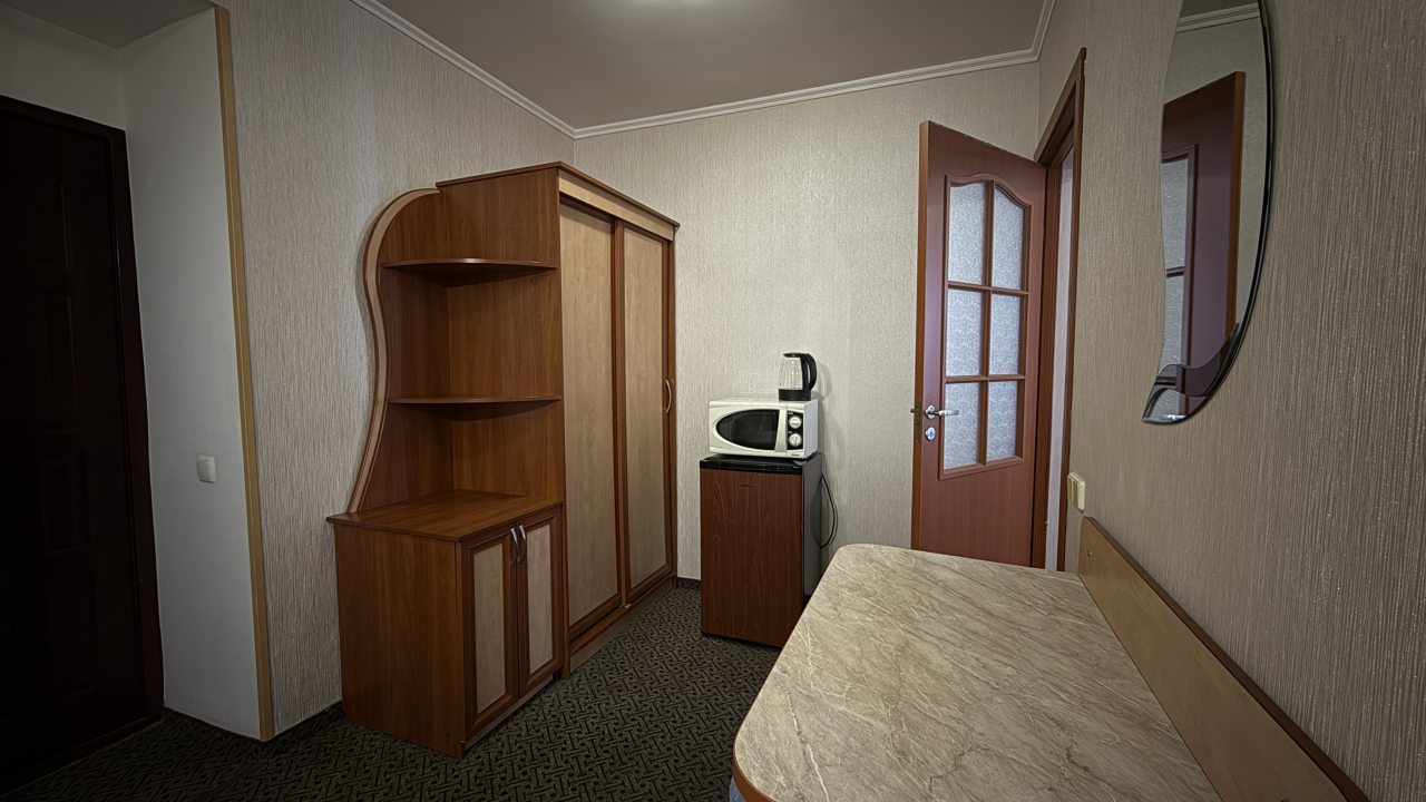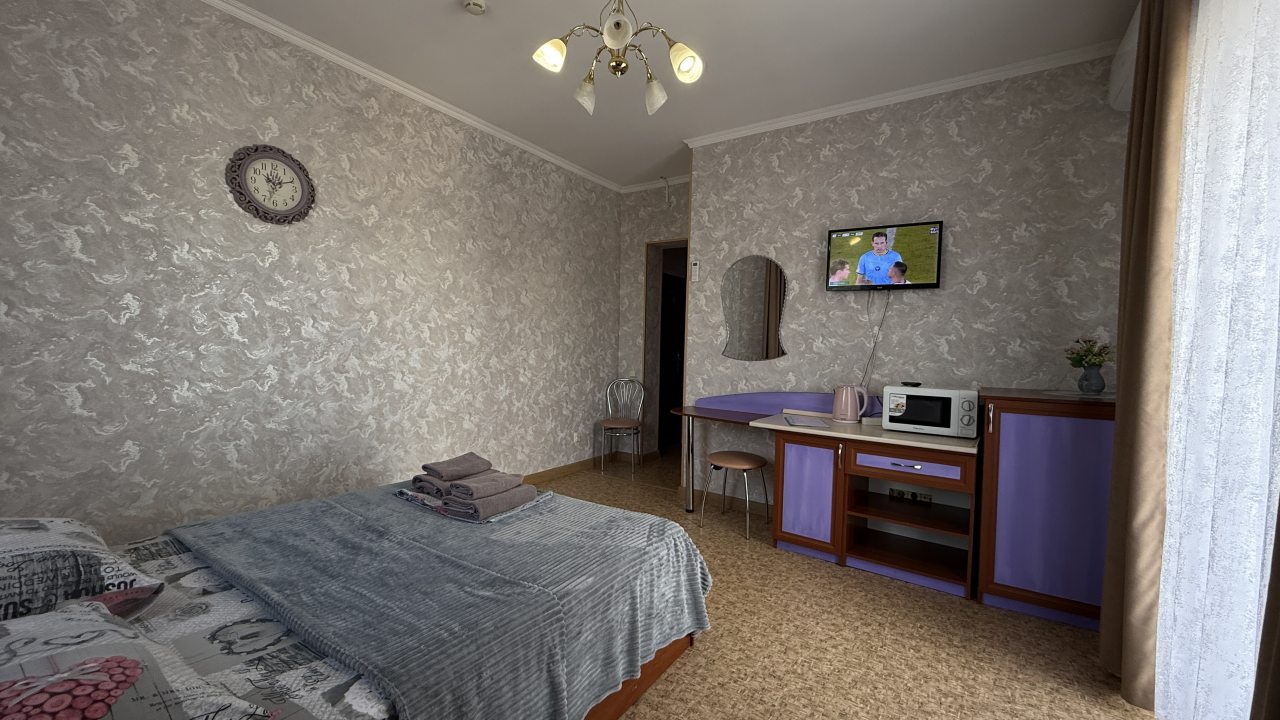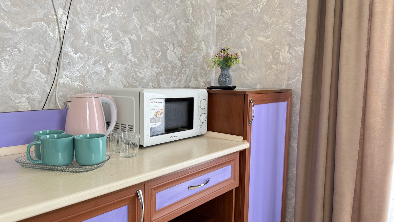 Хорошее местоположение. Приветливые сотрудники. Чисто. Есть холодильник, микроаолновка, чайник. Шампунь, мыло. Мы брали на одну ночь. Цена качество.