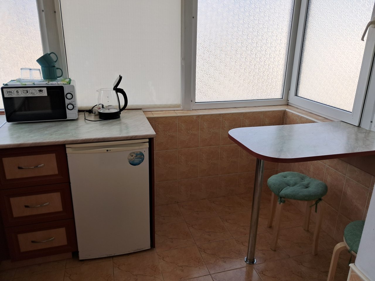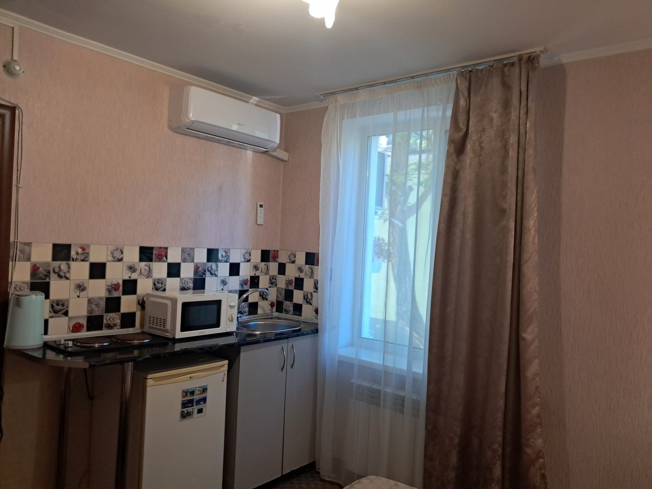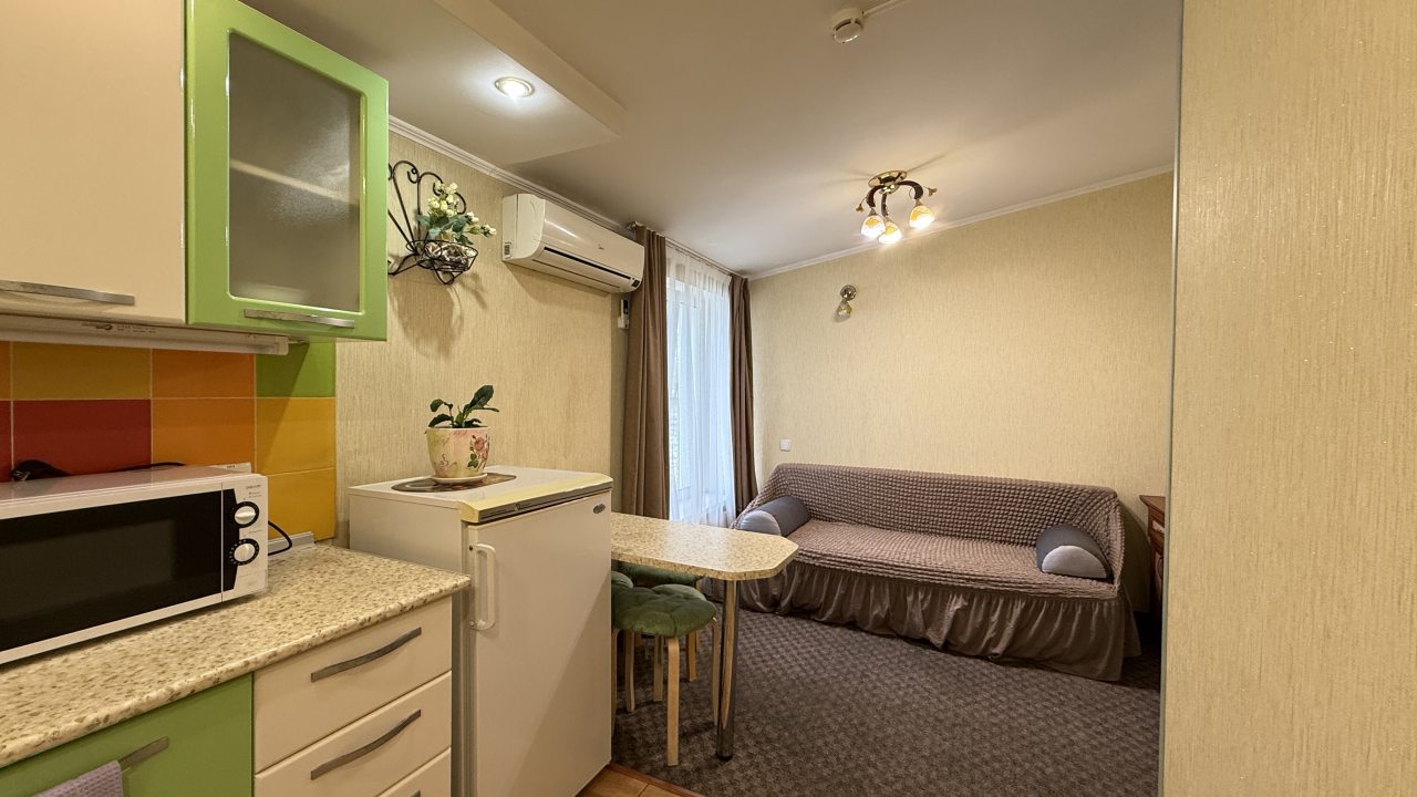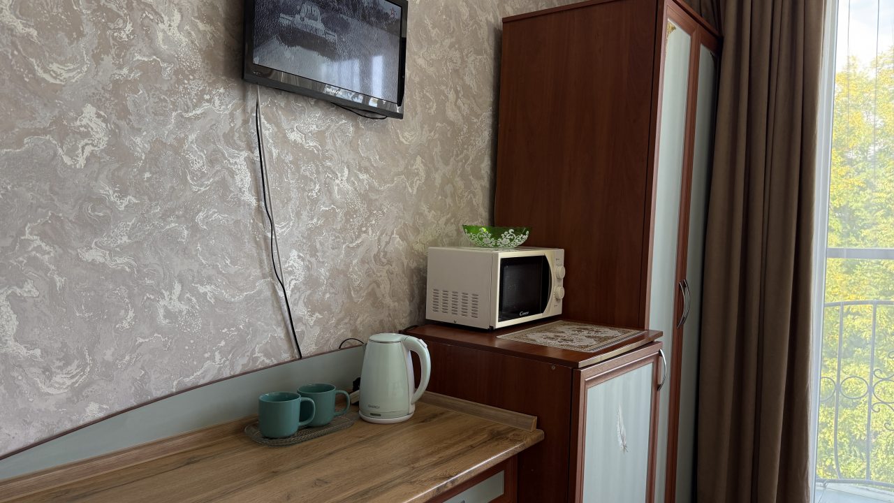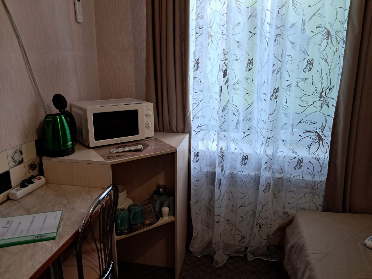 Хорошее местоположение. Приветливые сотрудники. Чисто. Есть холодильник, микроаолновка, чайник. Шампунь, мыло. Мы брали на одну ночь. Цена качество.
