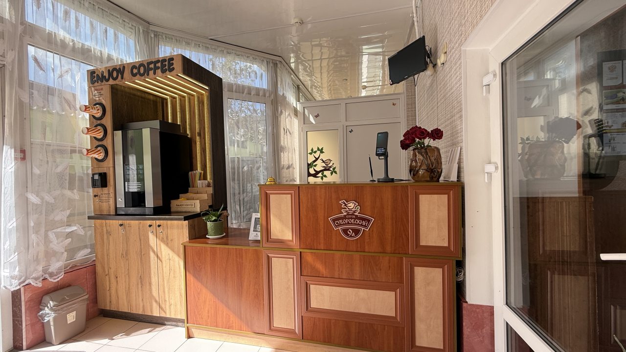 Довольно близко от вокзала(20-30)минут пешком Круглосуточно работает стойка регистрации.Есть услуга прачечной (300р одна закладка стиралки).Есть утюг-гладите сами,бесплатно. Тихо,уютно