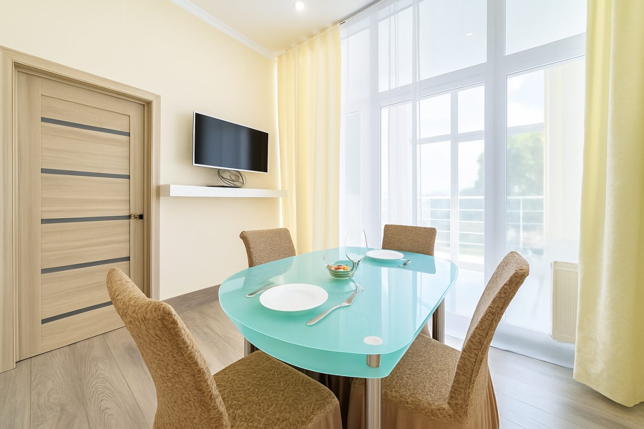 Мне было комфортно жить в подобных условиях, тем более, что тут есть кухня и можно было самому готовить еду для своей семьи, что в нашем случае весьма актуально. Кухня прекрасно обустроена, есть посуда, мебель и качественная техника, да и полностью квартира современно оснащена.