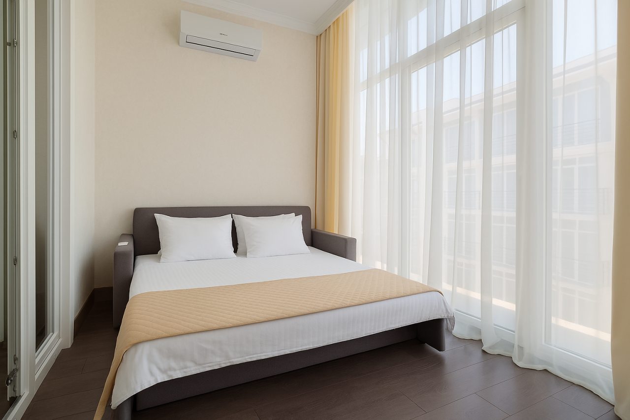 Для комфортного проживания светлые апартаменты укомплектованы современной мебелью и техникой. Среди удобств гости найдут кондиционер, высокоскоростной Wi-Fi, ЖК-телевизор, стиральную машину, кондиционер, фен и собственную ванную комнату. Предлагаются косметические наборы и тапочки. Из больших окон открывается живописный вид на море.
