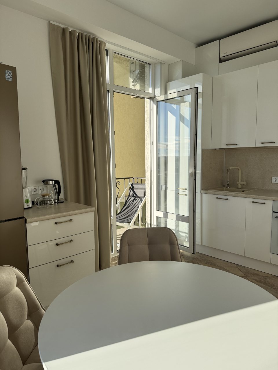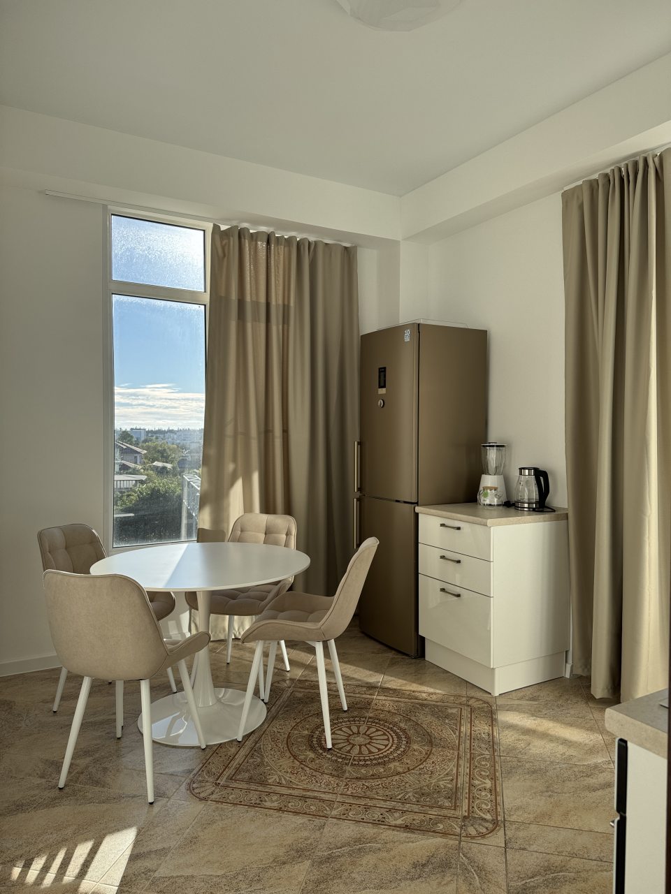 Для приготовления любимых домашних блюд и напитков предусмотрена красивая обеденная зона, духовой шкаф, варочная панель, чайник, блендер и холодильник.