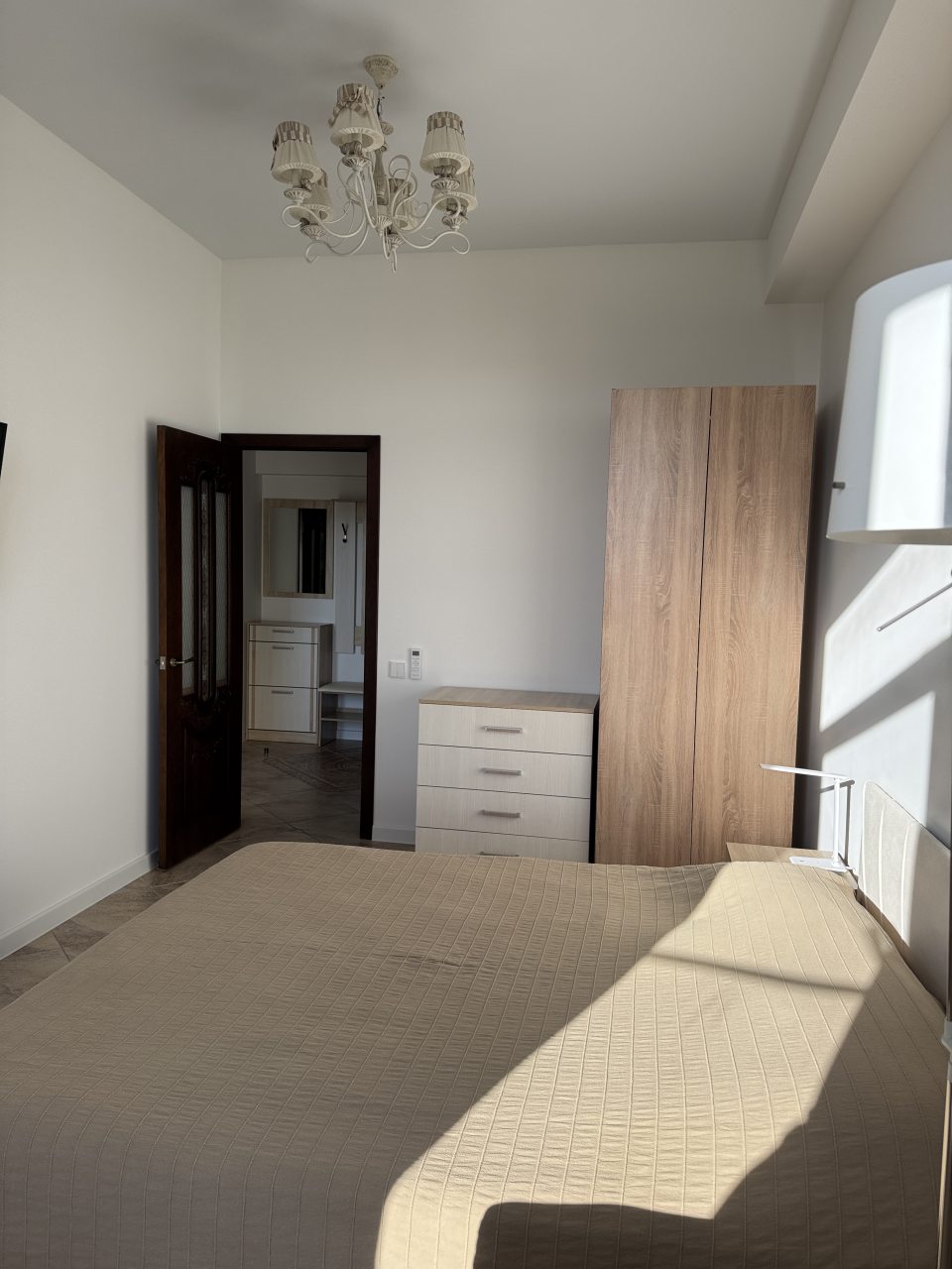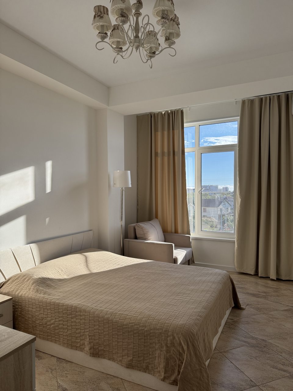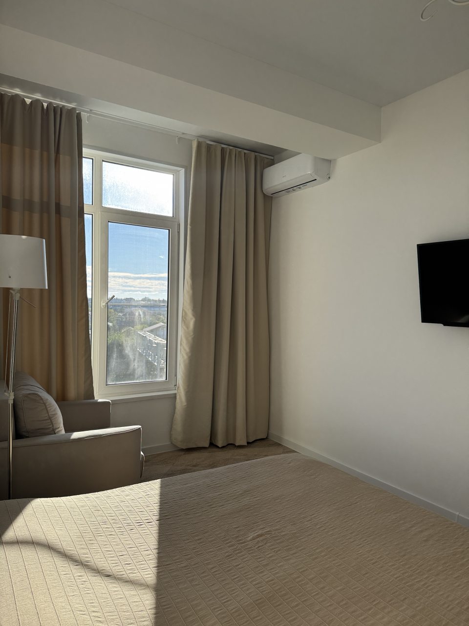 Внутри вас ожидает удобная двуспальная кровать, мягкое кресло с лампой, телевизор, кондиционер, вместительный шкаф, комод, а также санузел с душевой, стиральной машиной и средствами для личной гигиены.