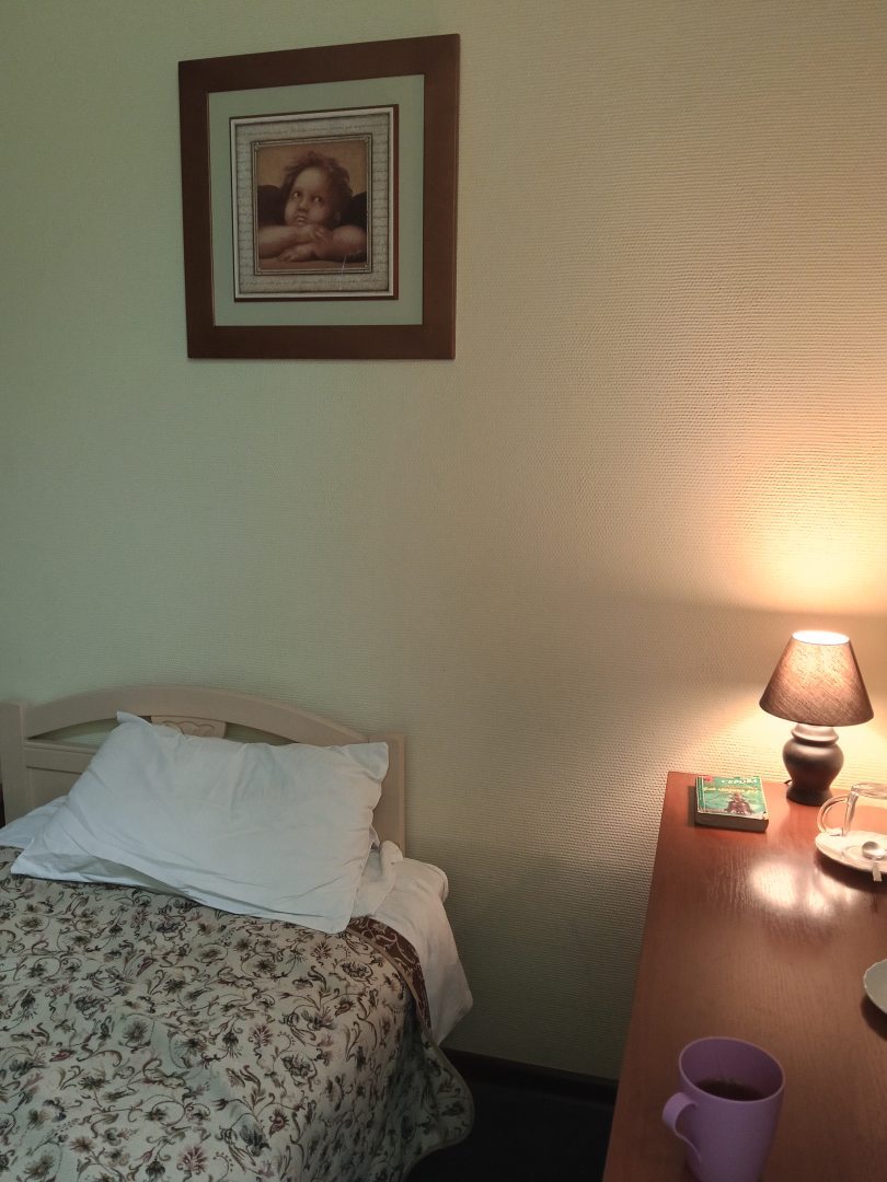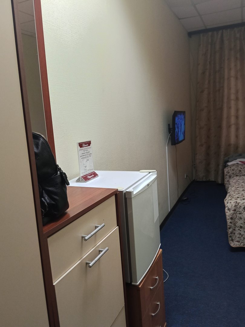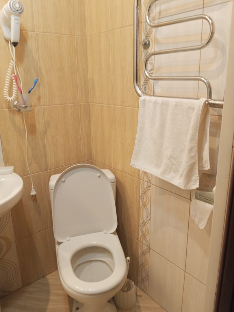 Из недостатков: номер брали с завтраком, но оказалось весь завтрак - это одно печенье. Или вообще отмените завтрак, или сделайте нормальный. У гостиницы своя котельная, поэтому горячую воду надо минут десять сливать, чтобы она была горячая, лейка душа течет во все бока, только не на тебя, душевая кабинка течет, поэтому на полу образовается лужа. Матрасы : пружины в бока торчат, поэтому пора их заменить. Внешний вид номера потертый. Вывод: гостинице требуется ремонт