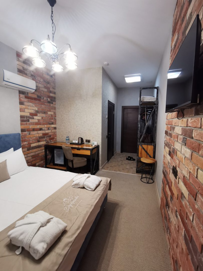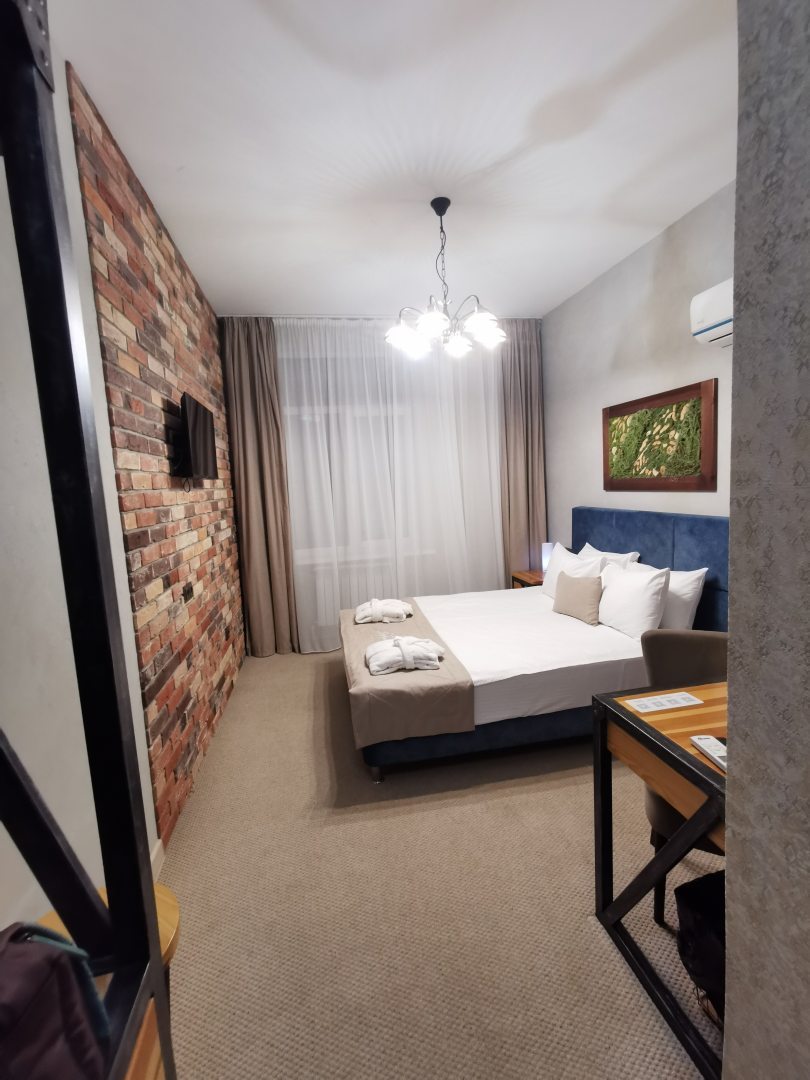 Представлены 37 номеров, которые выполнены в стиле «Классика» и «Лофт». В оформлении преобладают пастельные тёплые оттенки, создающие уютную и современную обстановку. Комнаты оснащены кондиционером, ЖК-телевизором, Wi-Fi и собственной ванной комнатой. Так же имеется мини-холодильник и чайник.
