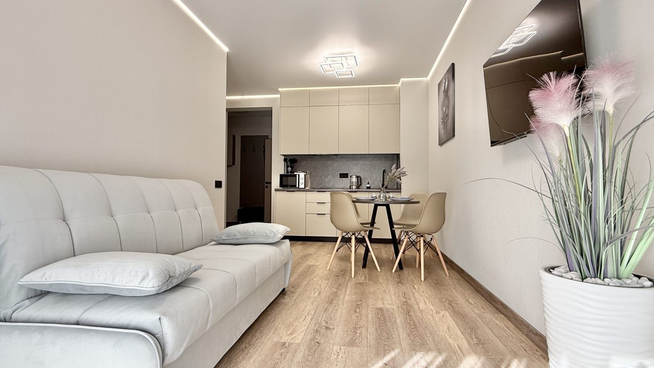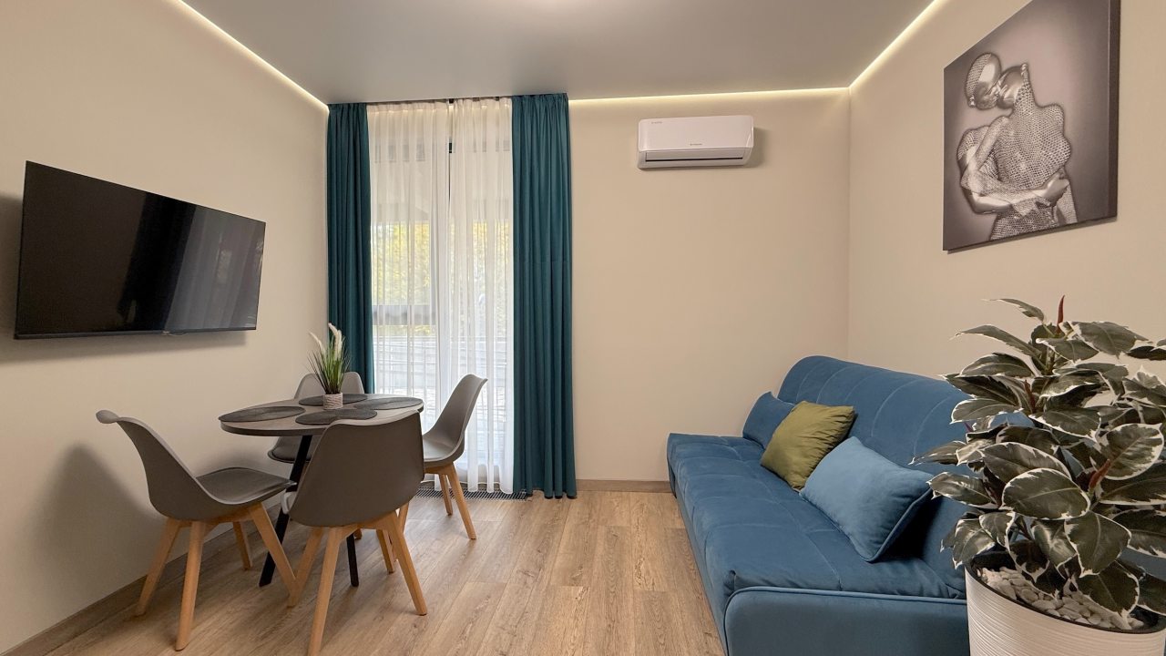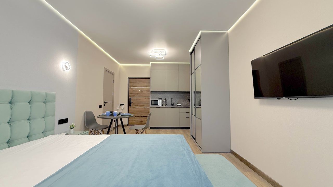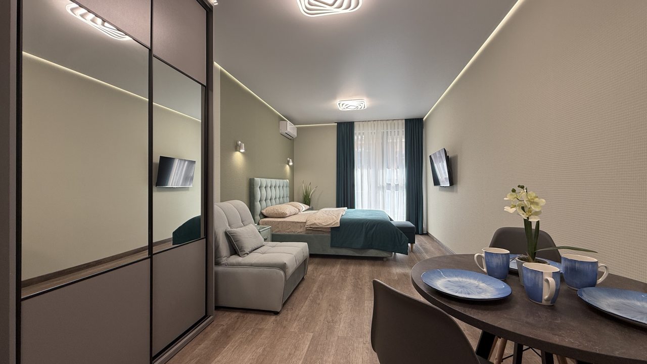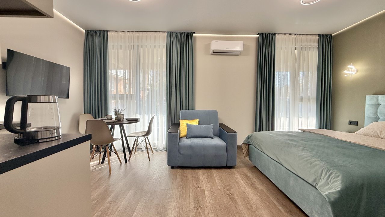 На выбор гостя предоставляются разные категории номеров: Студио, Люкс, Апартаменты, Семейные номера. Каждый их них оборудован качественной мебелью и современной техникой. Предусмотрены индивидуальные ванные комнаты и набор полотенец.