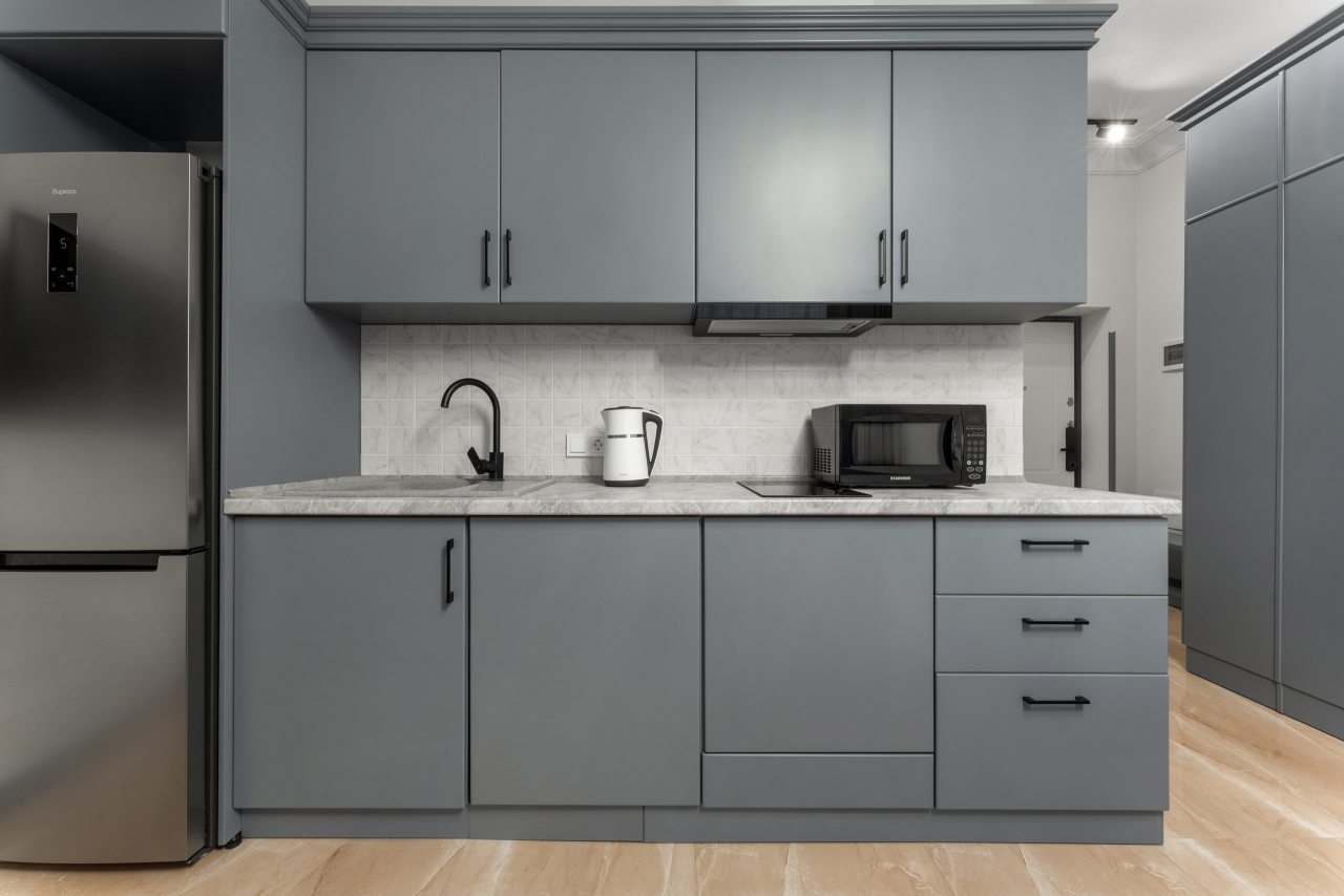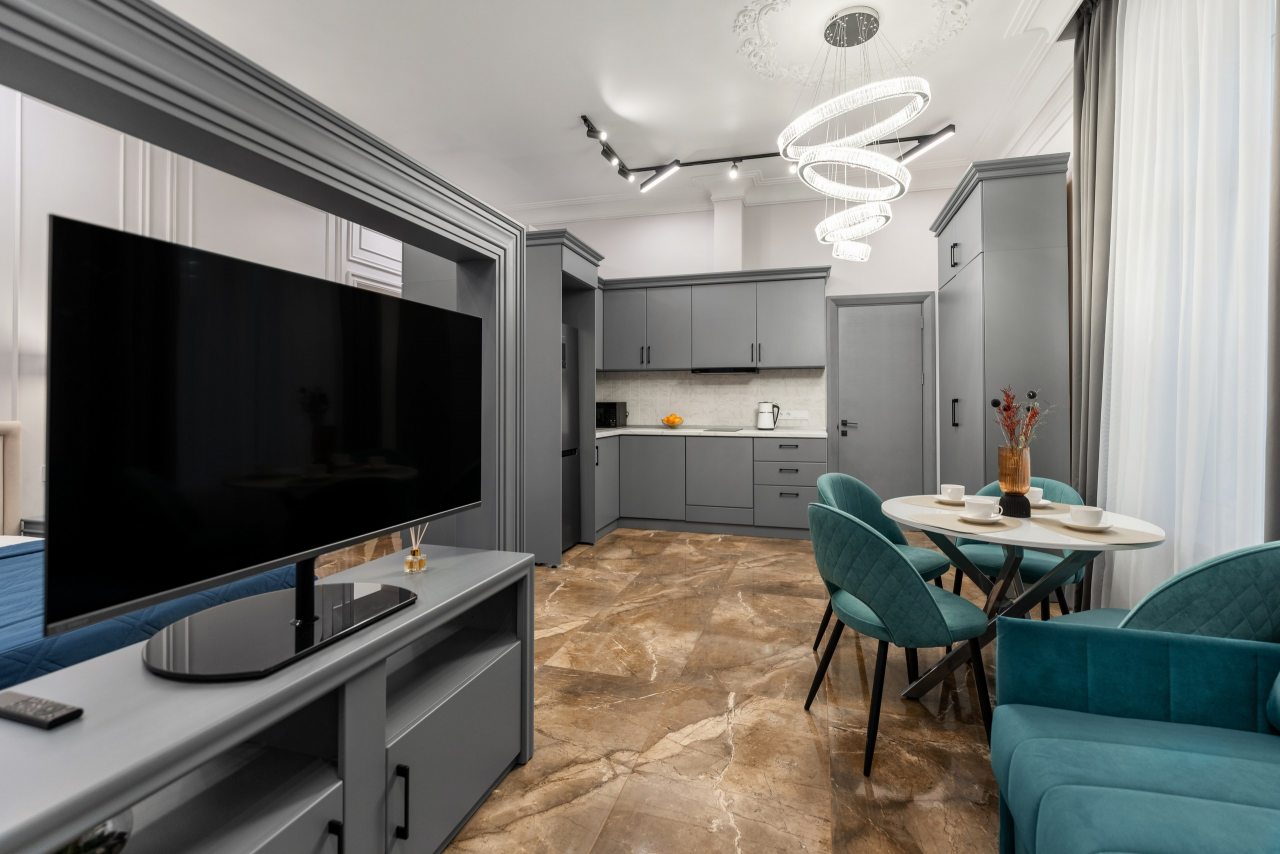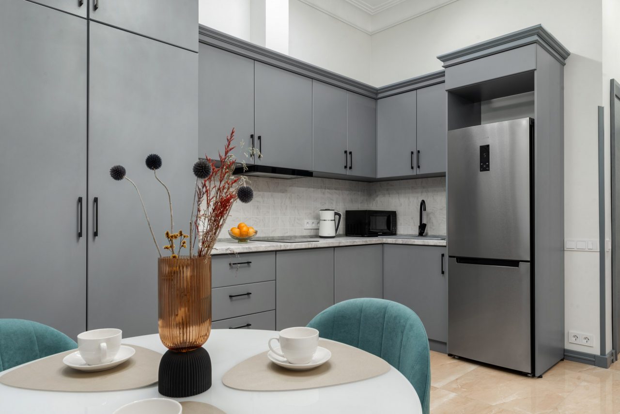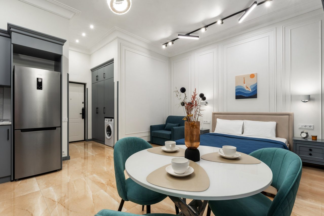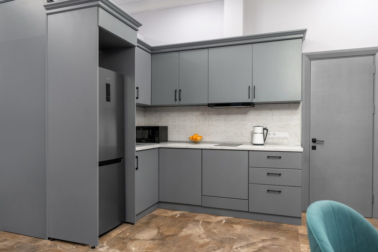 Для удобства приготовления любимых блюд предусмотрена кухня с СВЧ, варочной панелью, чайником, холодильником и красивой обеденной зоной.