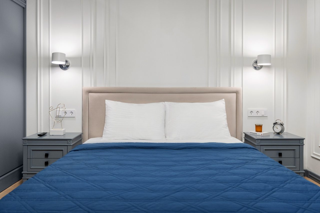 Предусмотрены номера различной вместимости. В каждом вас ожидает стильный дизайн, удобная кровать, телевизор, шкаф с сейфом, а также санузел с полотенцами и необходимой сантехникой.