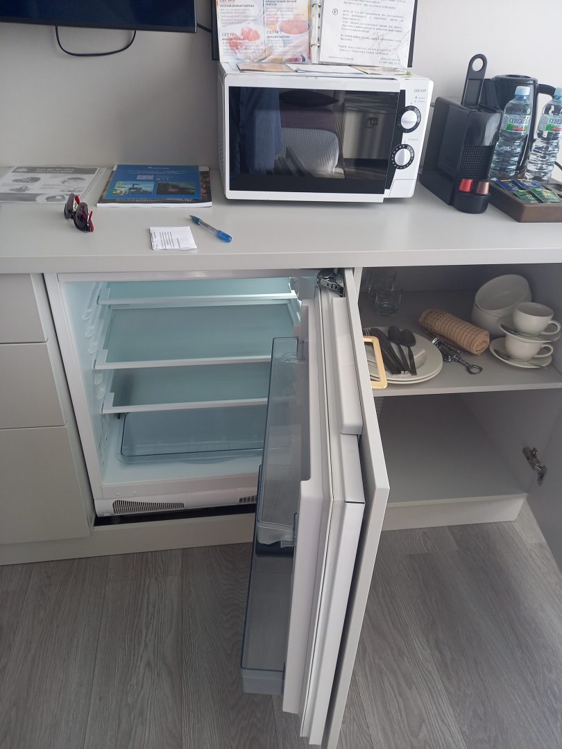 Апартаменты оборудованы мини-кухней, где есть электрический чайник, кофемашина, чайный набор, кофейные капсулы и бутылочки с водой.