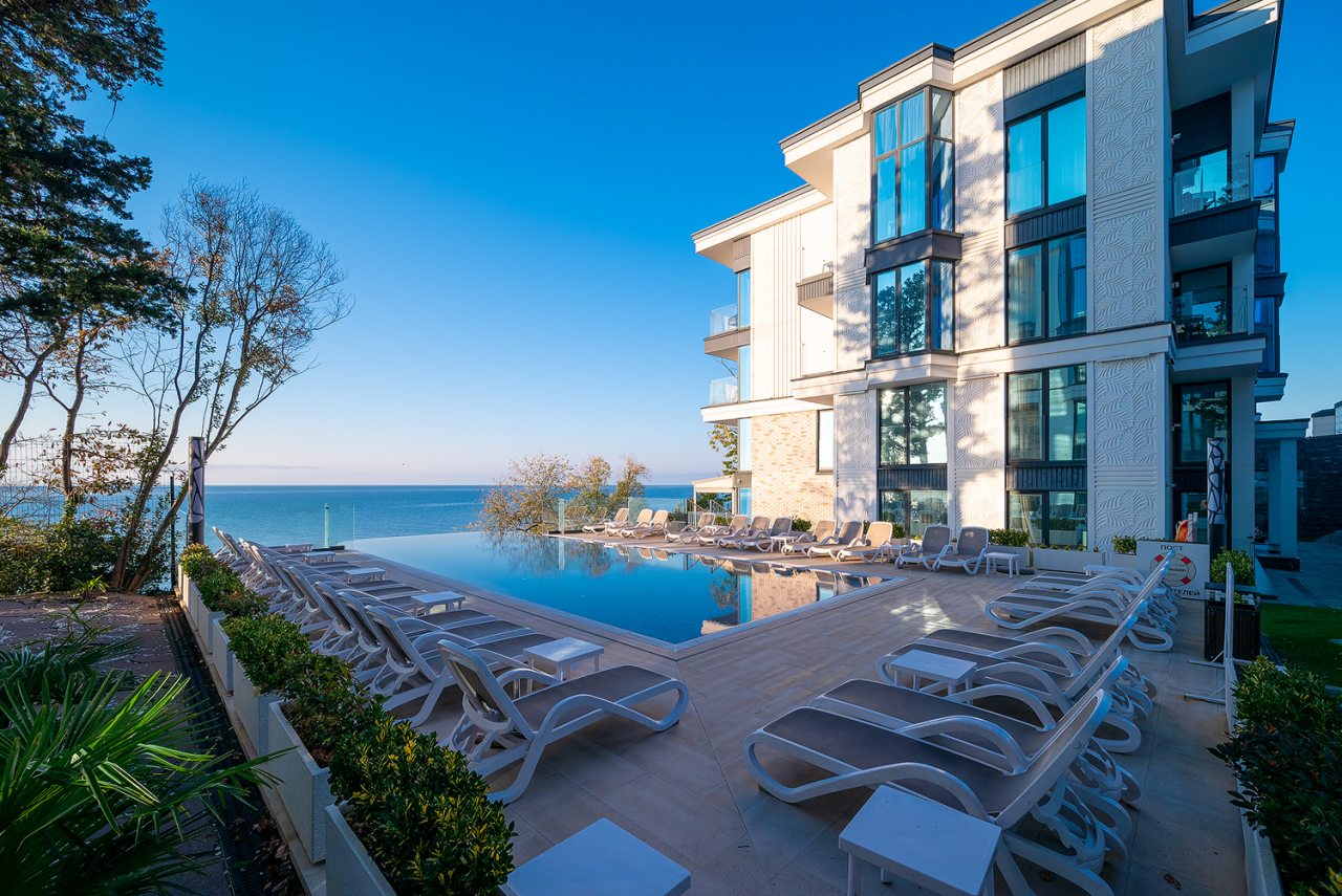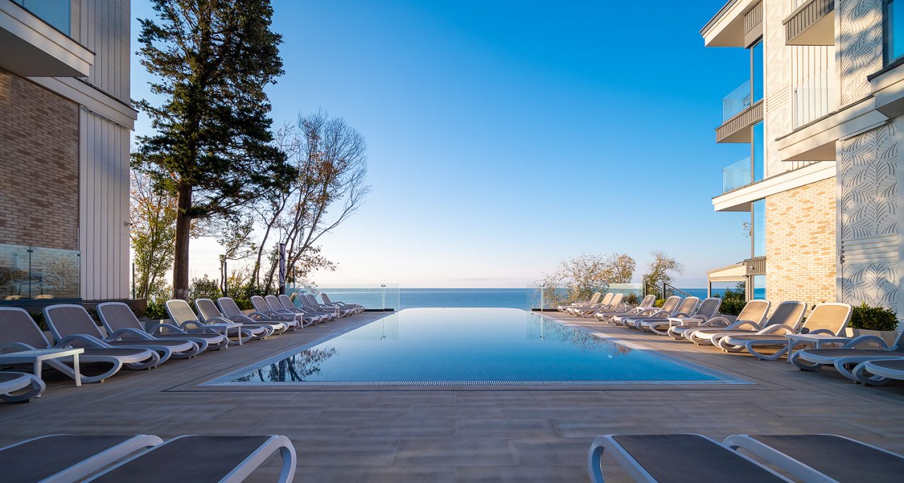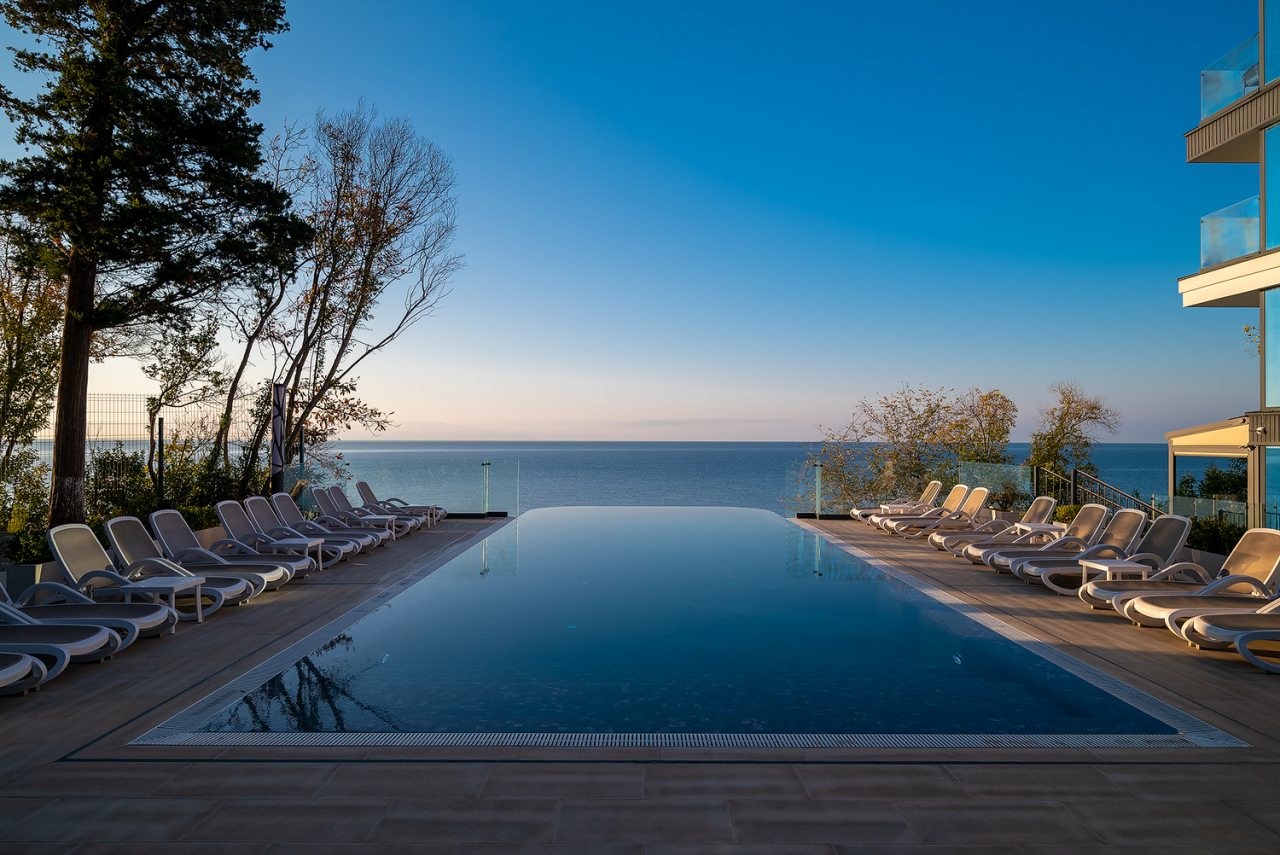 Два бассейна инфинити, один из них находится прямо на берегу моря, сауна, рядом ресторан. Второй бассейн инфинити находится в скале на высоте более 25 метров с панорамными видами на центр Сочи.