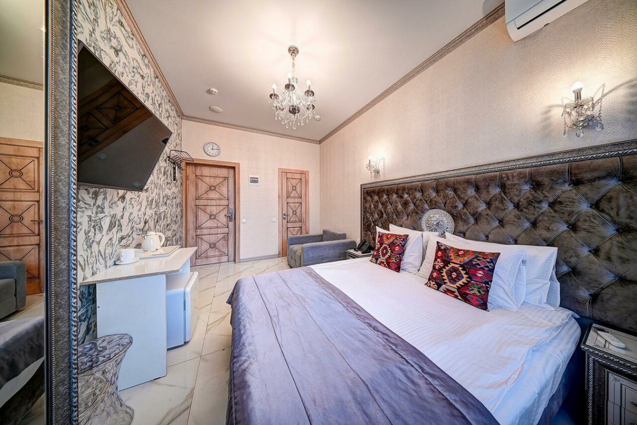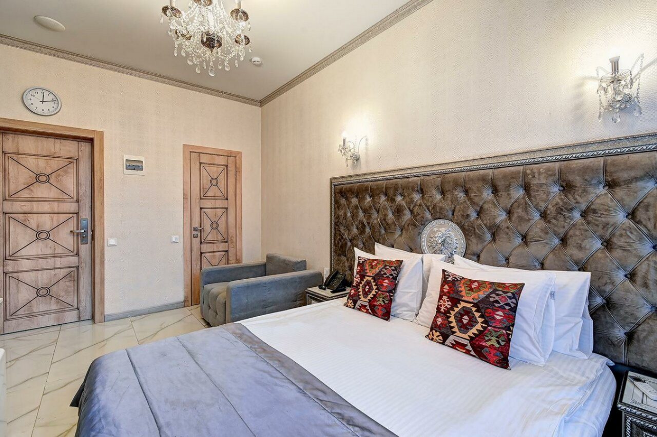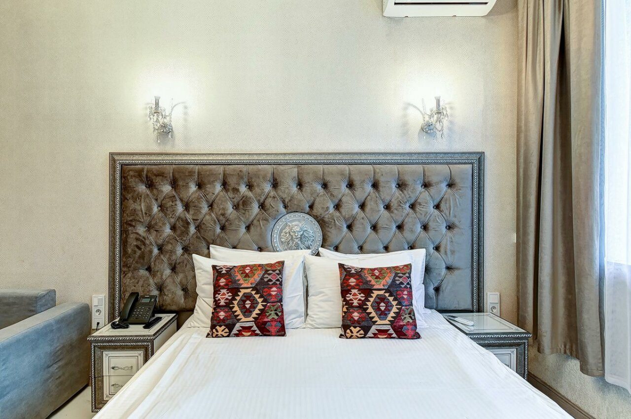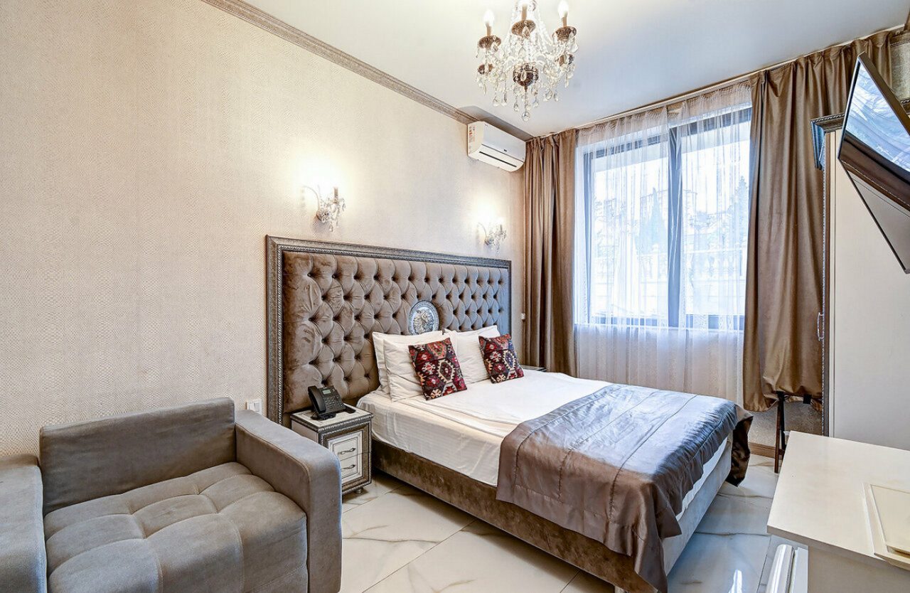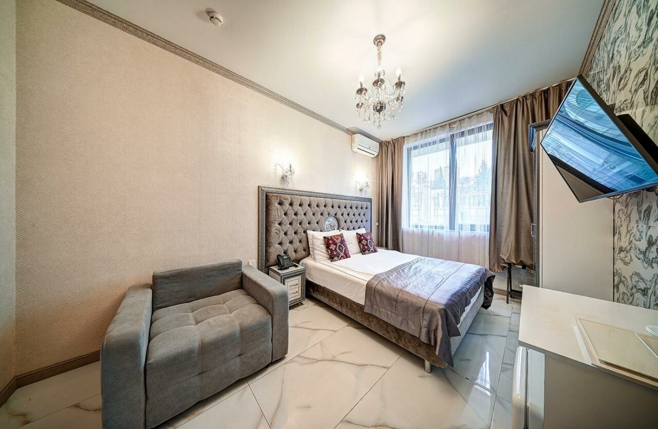 Апартаменты выполнены в современном стиле и приятных цветовых решениях. В их комплектацию входит: двуспальная кровать с белоснежным постельным бельем, мягкое кресло, прикроватные тумбочки, телевизор, шкаф для хранения личных вещей. В санузле установлен душ и есть фен.